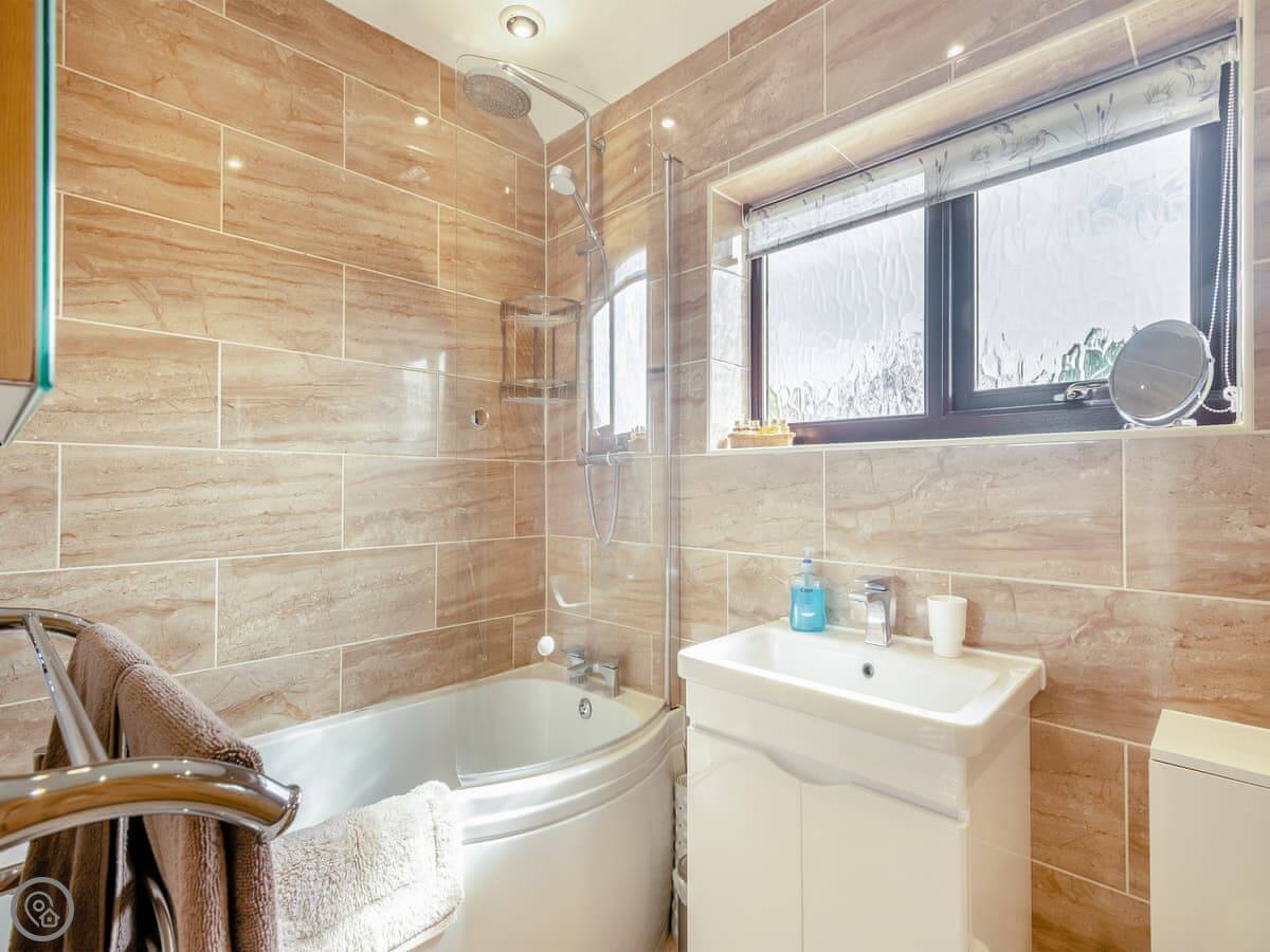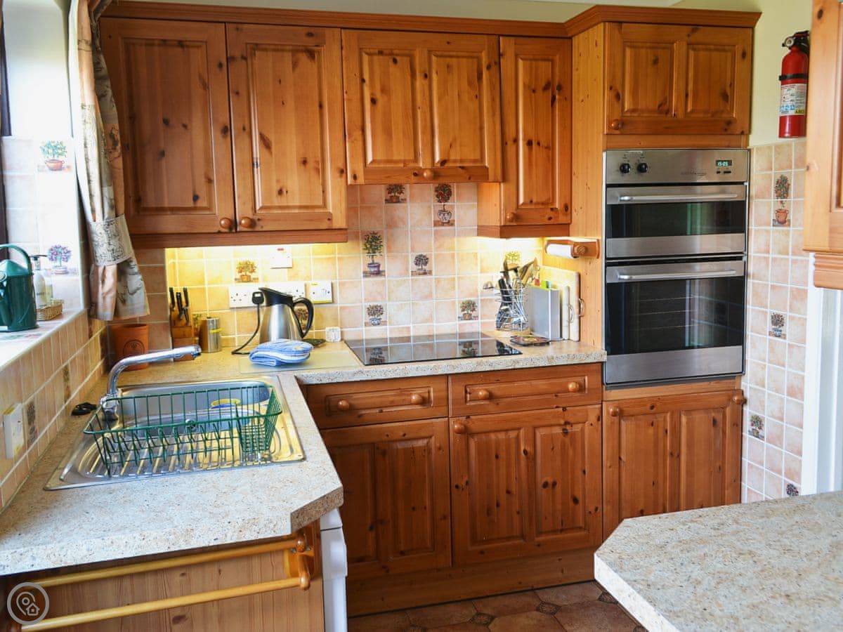 Stuff here includes a dishwasher, washing machine, a woodburner, and a TV. There's a cot and a highchair if you need them. Bedding and towels are included. There's parking on the drive. No pets, sorry.