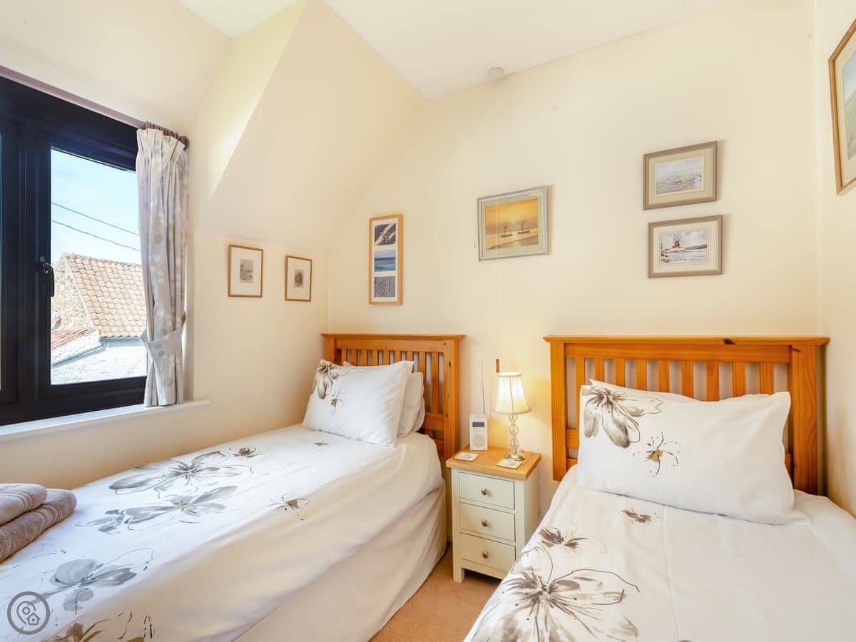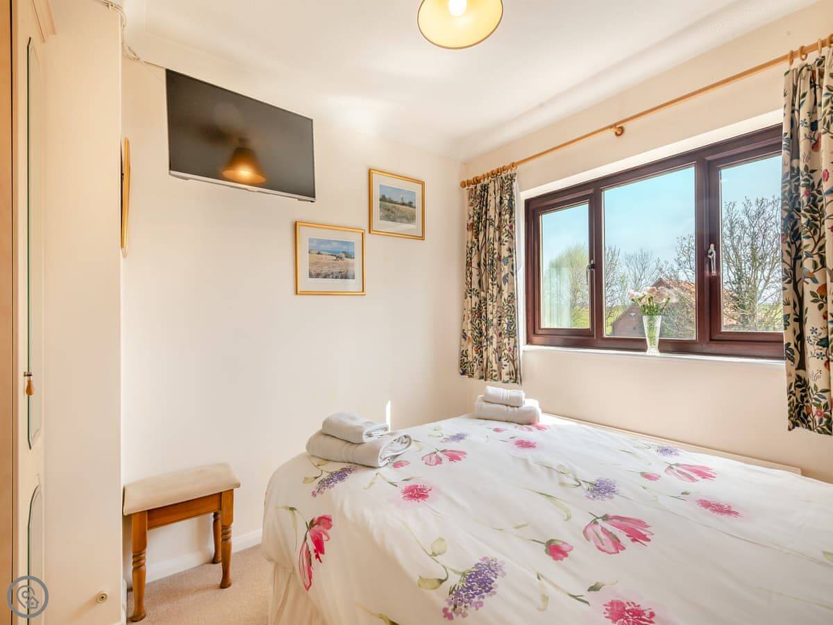 The beach at Holme is about five minutes in the car. It's sand. Hunstanton is a short drive for the town beach and the cliffs. The village shop is right opposite the entrance, which is handy for milk and papers. The pub is about a hundred yards down the road. The Gin Trap. It's good, does food. You'd need to book.
