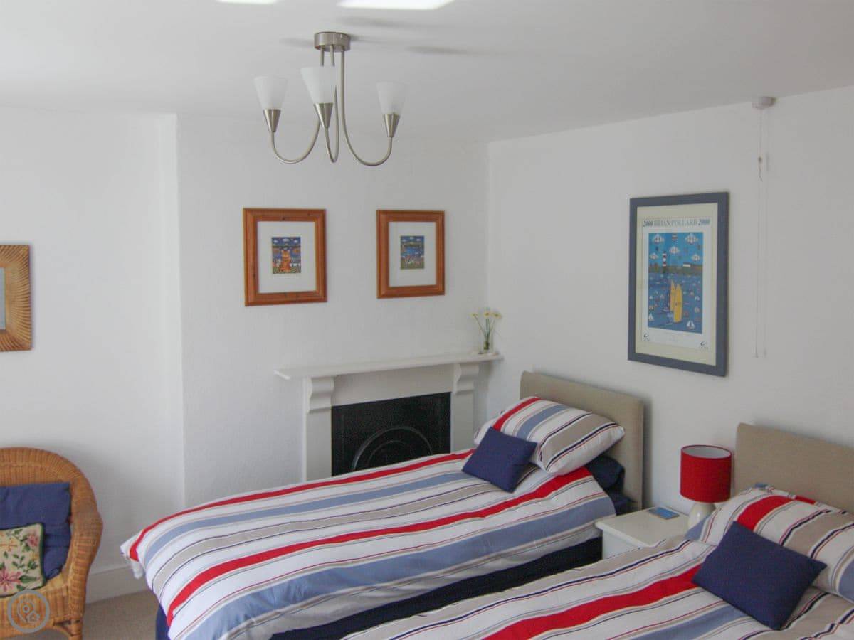 Inside, there's a living room looking out to sea, a separate kitchen with a table, and two good sized bedrooms. One has a king size bed, the other has two singles. There's a small porch with a seat outside the front door, and a raised seating area up some steps. Both have that sea view.