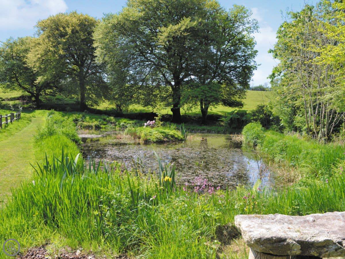 The best bit is probably the garden. It's south facing. There's a patio and a lawn, and then it slopes down into a big wild flower meadow, over an acre of it. There are ponds and streams down there. It's very quiet.