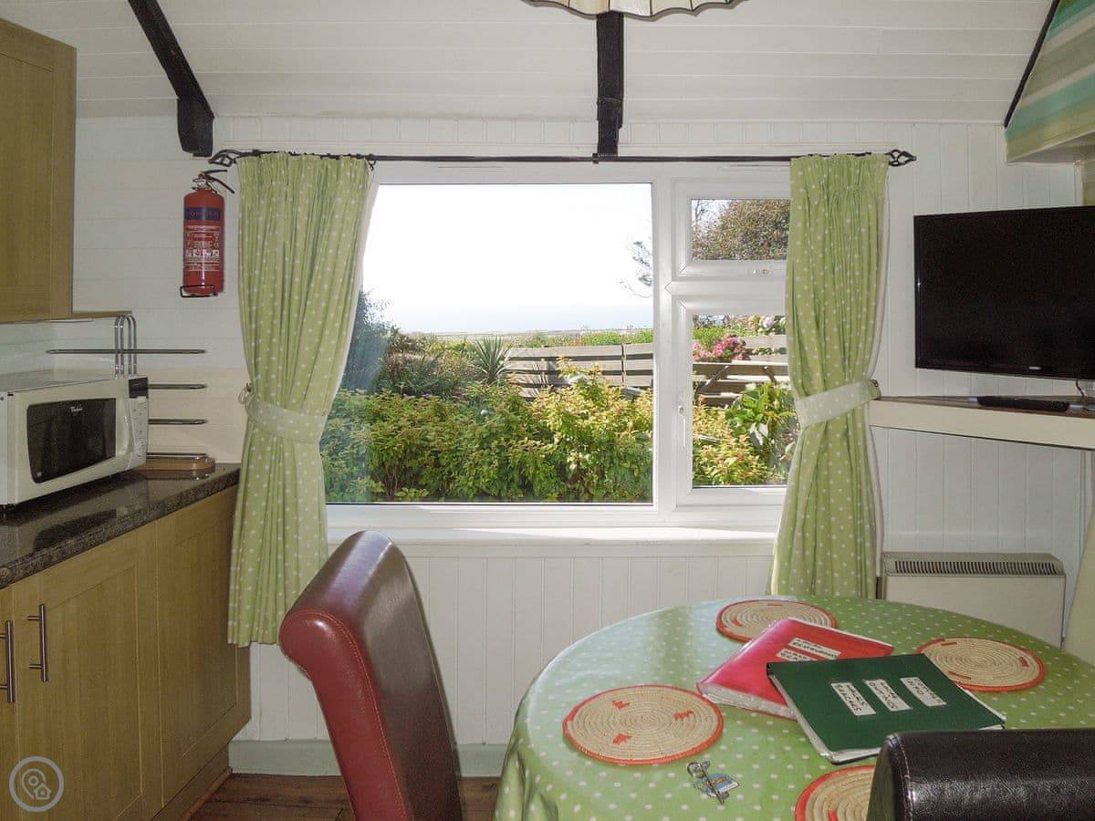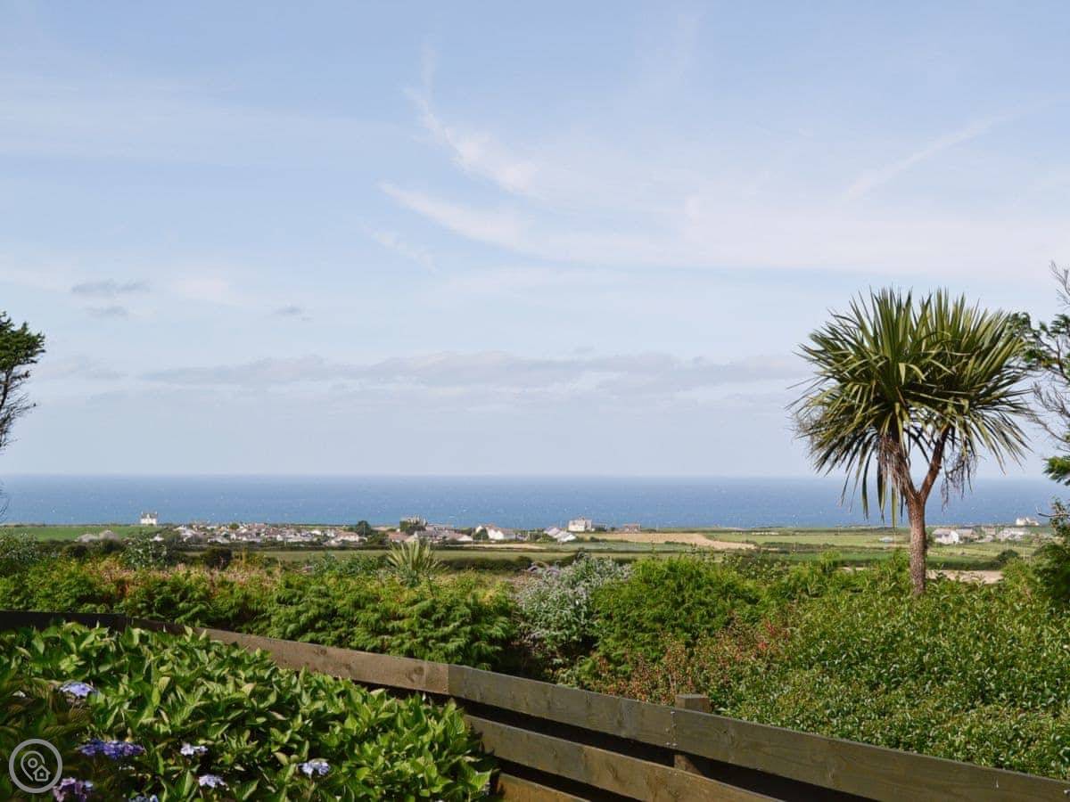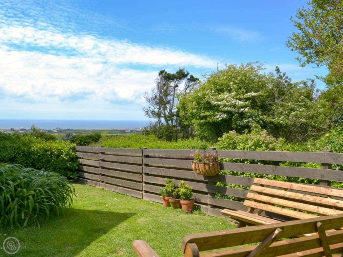 The thing about it is the view. You get a proper sea view from the main windows, looking out over the village towards the ocean. There's a small fenced garden at the front with a bench to sit on. Out the back there's a patio area too.