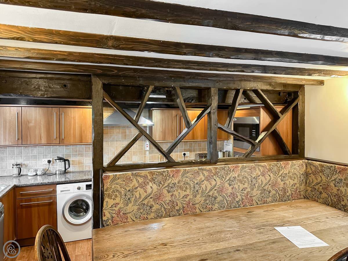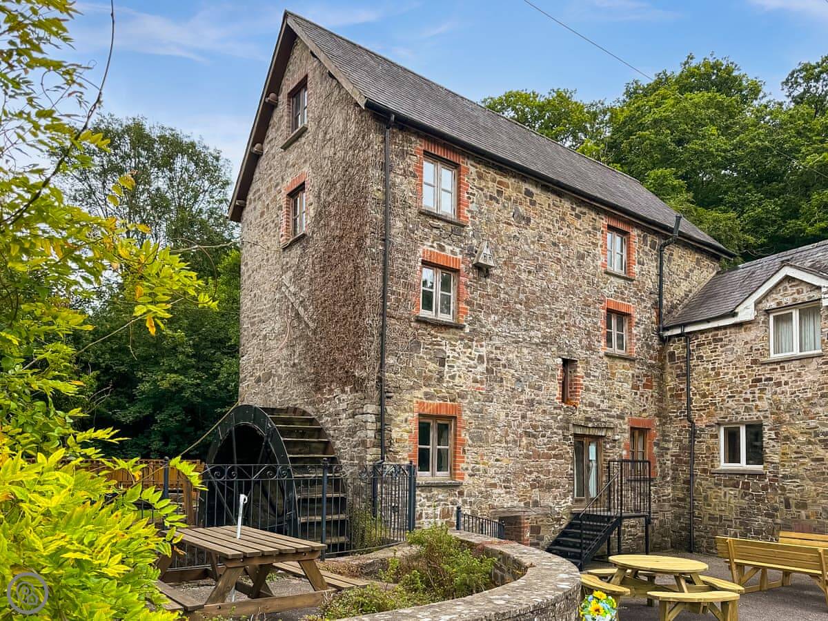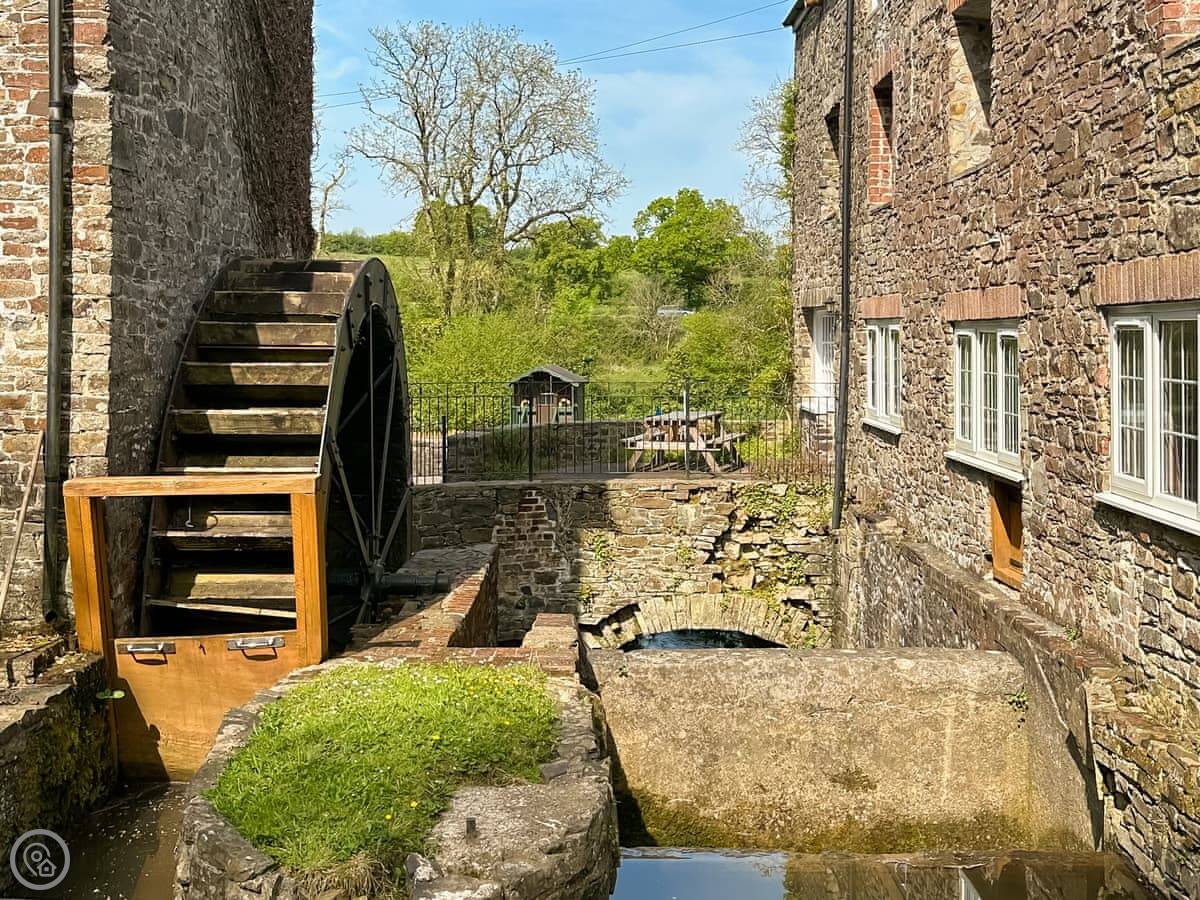 The building was a grain mill and is Grade II listed. The waterwheel is still on the side. You go in on the ground floor to a big open living and dining area. The kitchen is there too. It's got proper stuff in it, like decent pans and an extra fridge for drinks. The windows at the back look over the river and the fields.