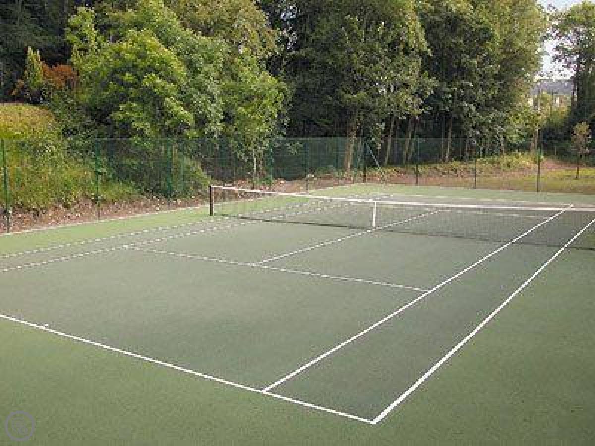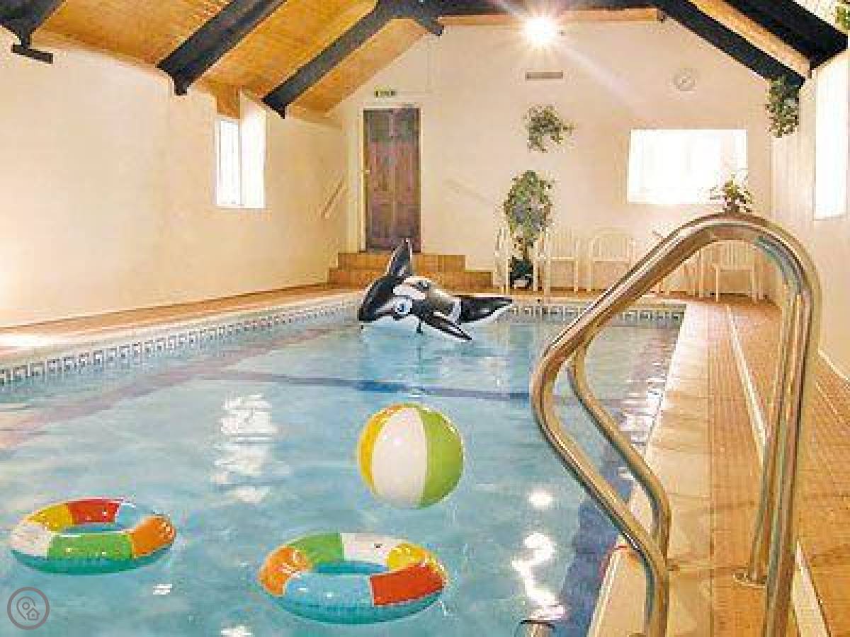 The site has a few shared things. There's an indoor swimming pool, kept warm. You can book it for just your group. There's a games room with a pool table and table football. Outside, there's a kids' play area with swings and a slide, down by the river but safely fenced. Sometimes peacocks wander around the garden.