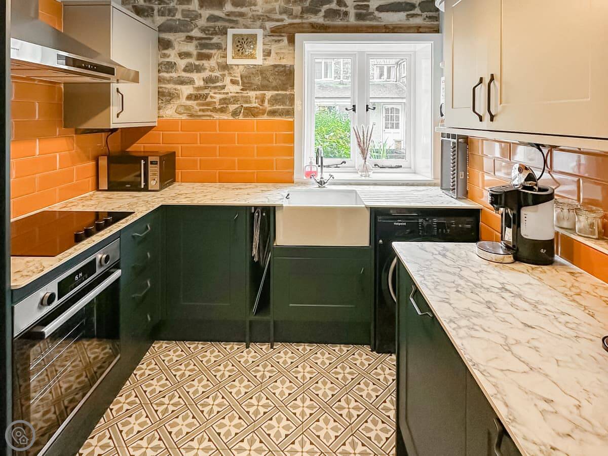 Inside, the main room is open-plan with a big inglenook fireplace and a wood burner. The kitchen looks out into the courtyard. The front door opens onto the main garden.