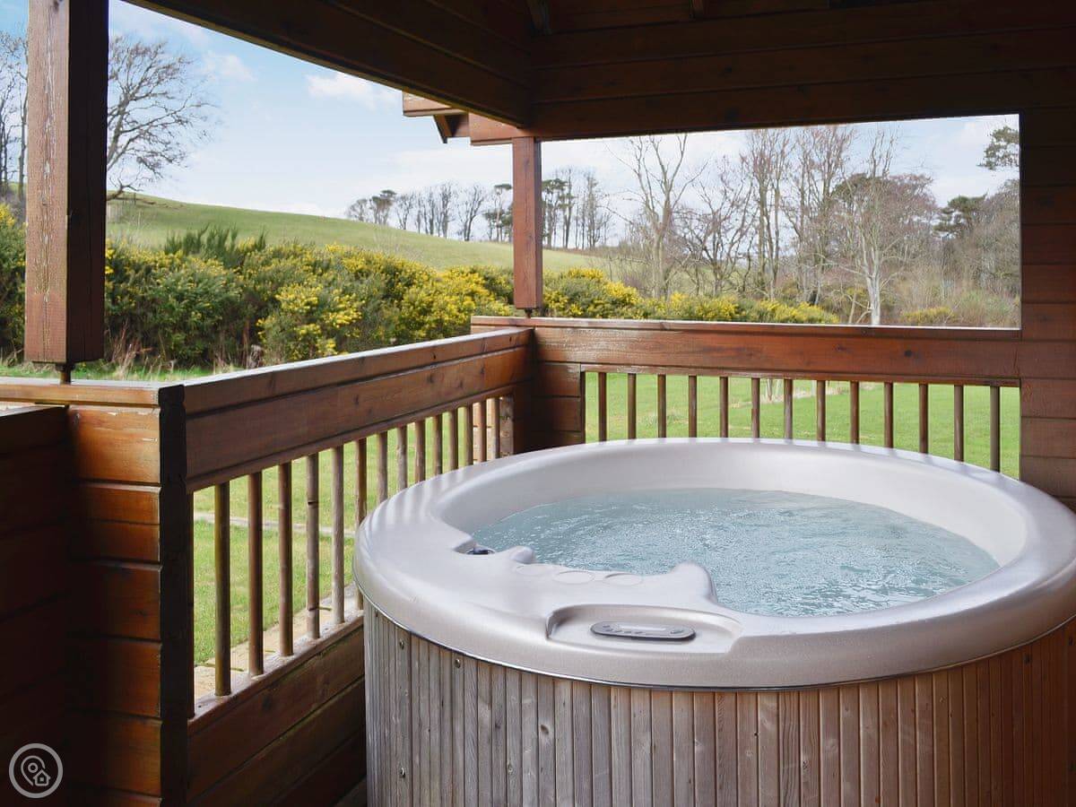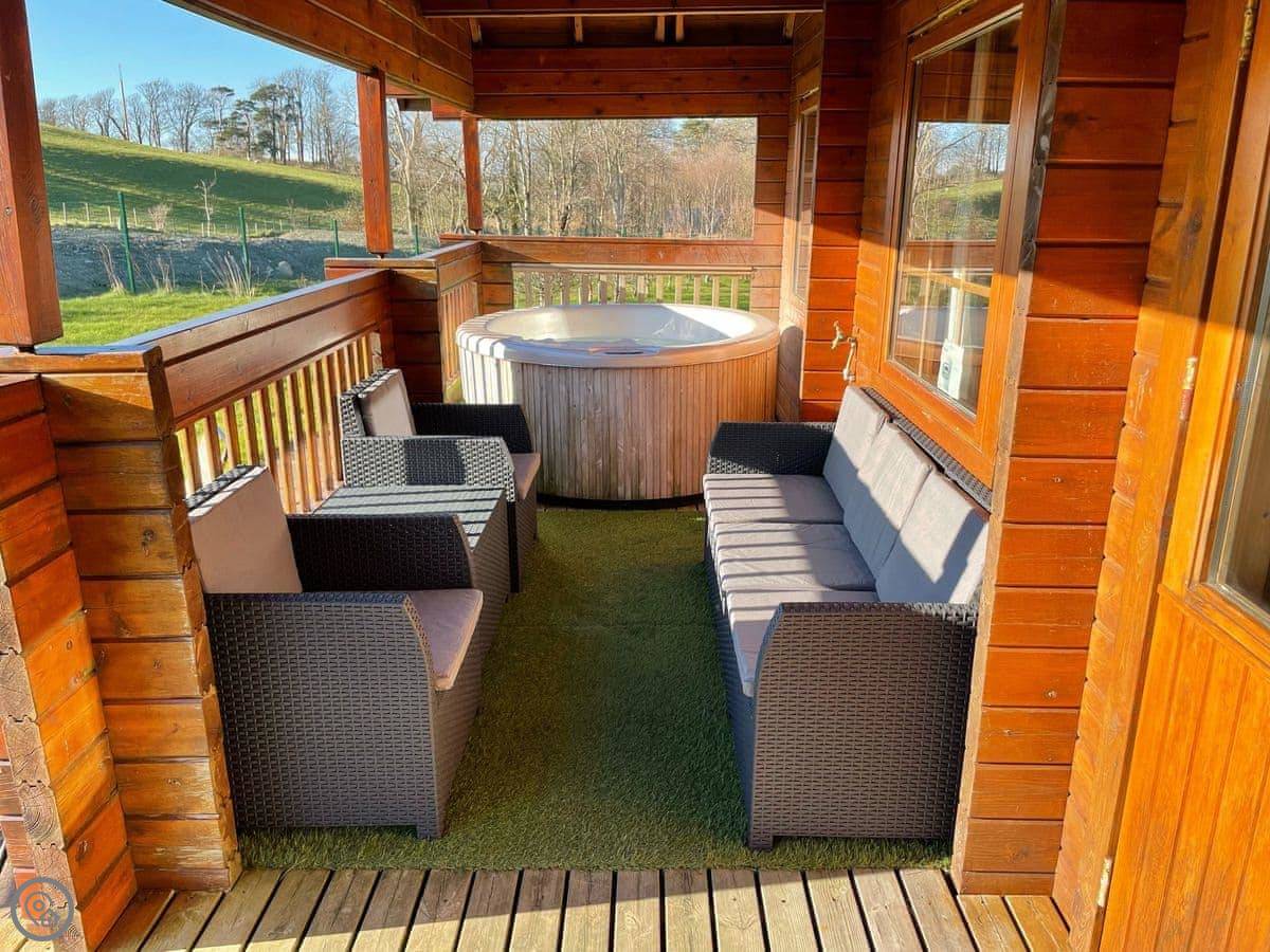 This is Sun Rise Lodge No 10, in Llanbedr. It's a modern, single-storey lodge in a quiet, private park of similar properties. It's detached, so no shared walls. You've got your own patio and garden area, and the hot tub is right out there.