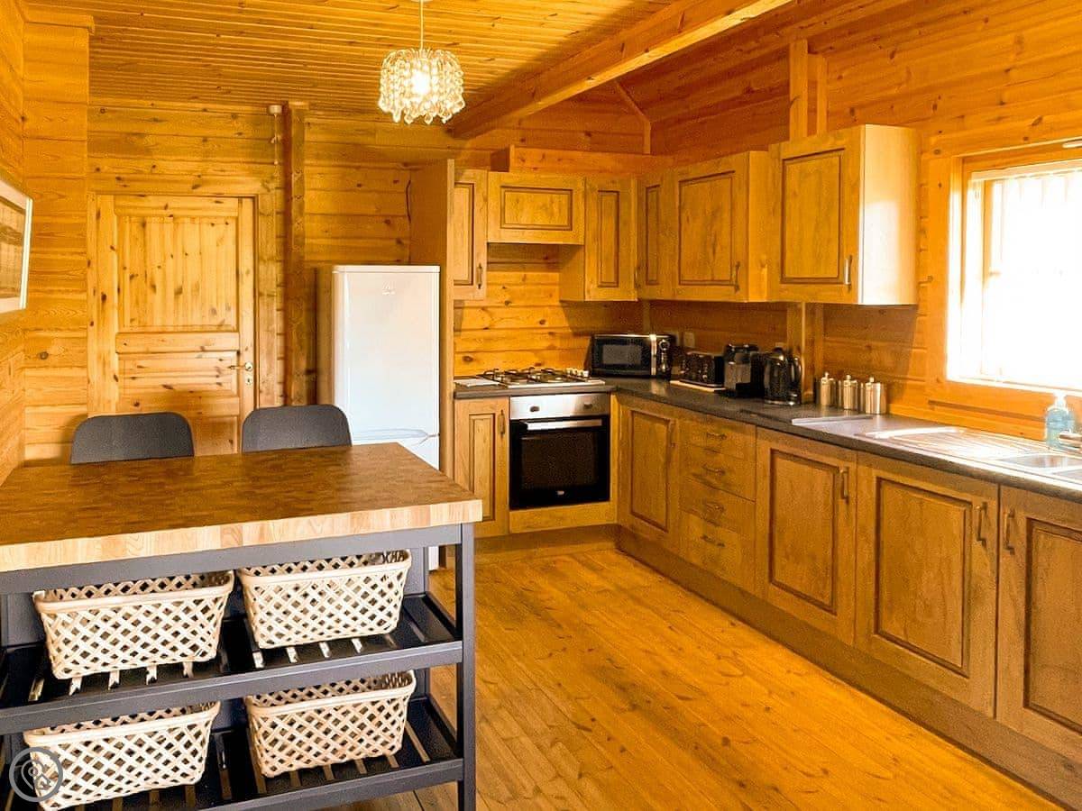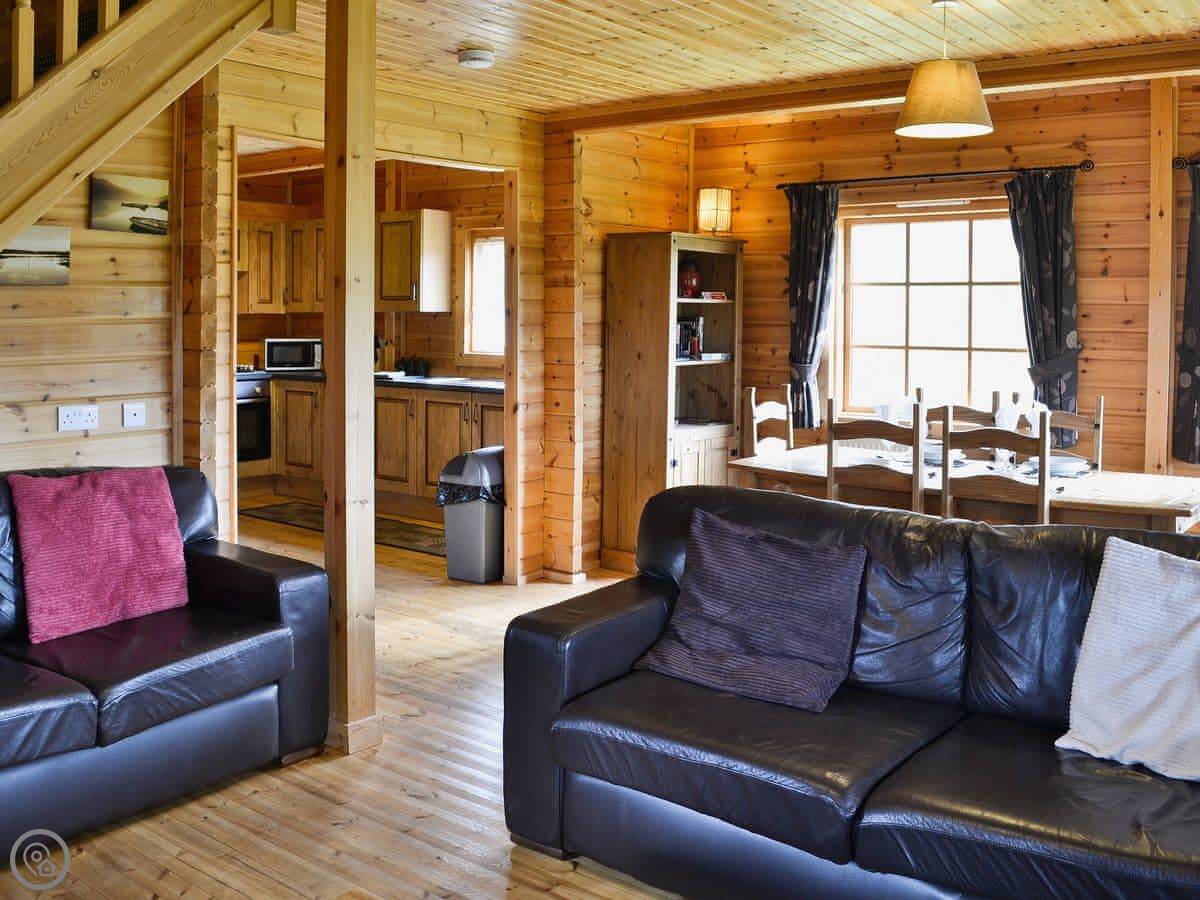 The place is very open plan inside. Kitchen, dining area, and living space all in one big room. It's got a dishwasher and a washing machine. Bedding and towels are included. There's a cot and a highchair if you need them. Parking is right outside.