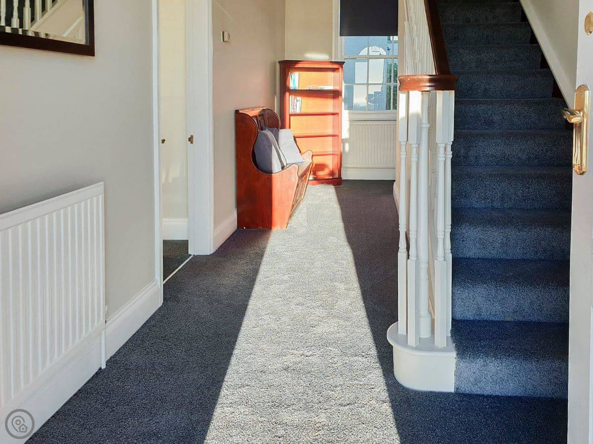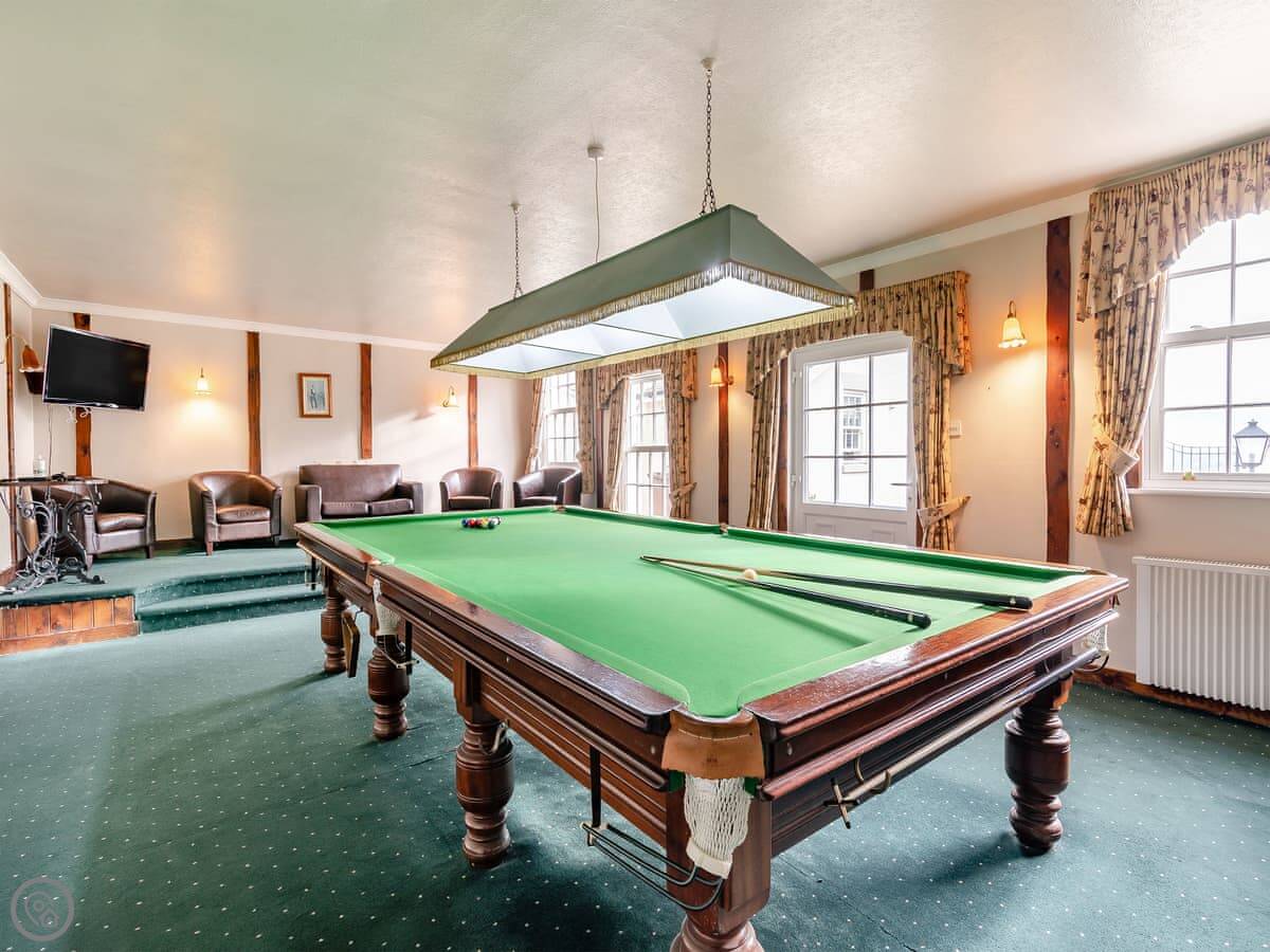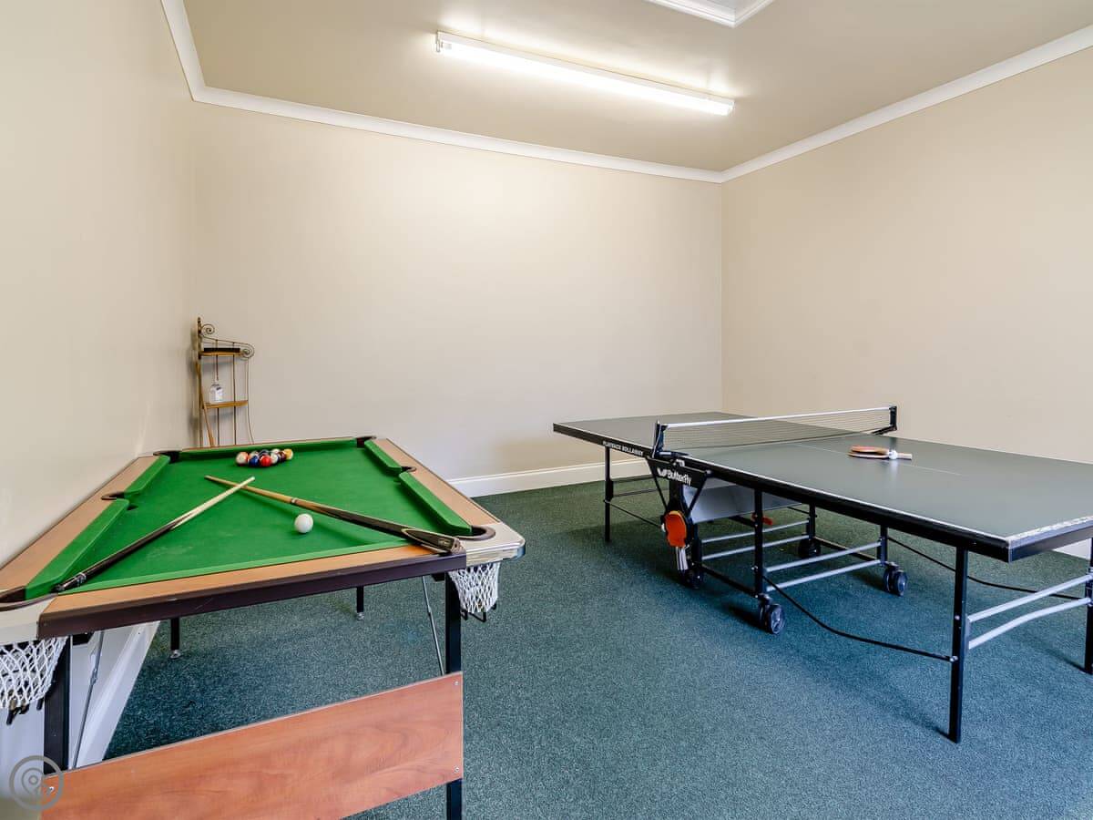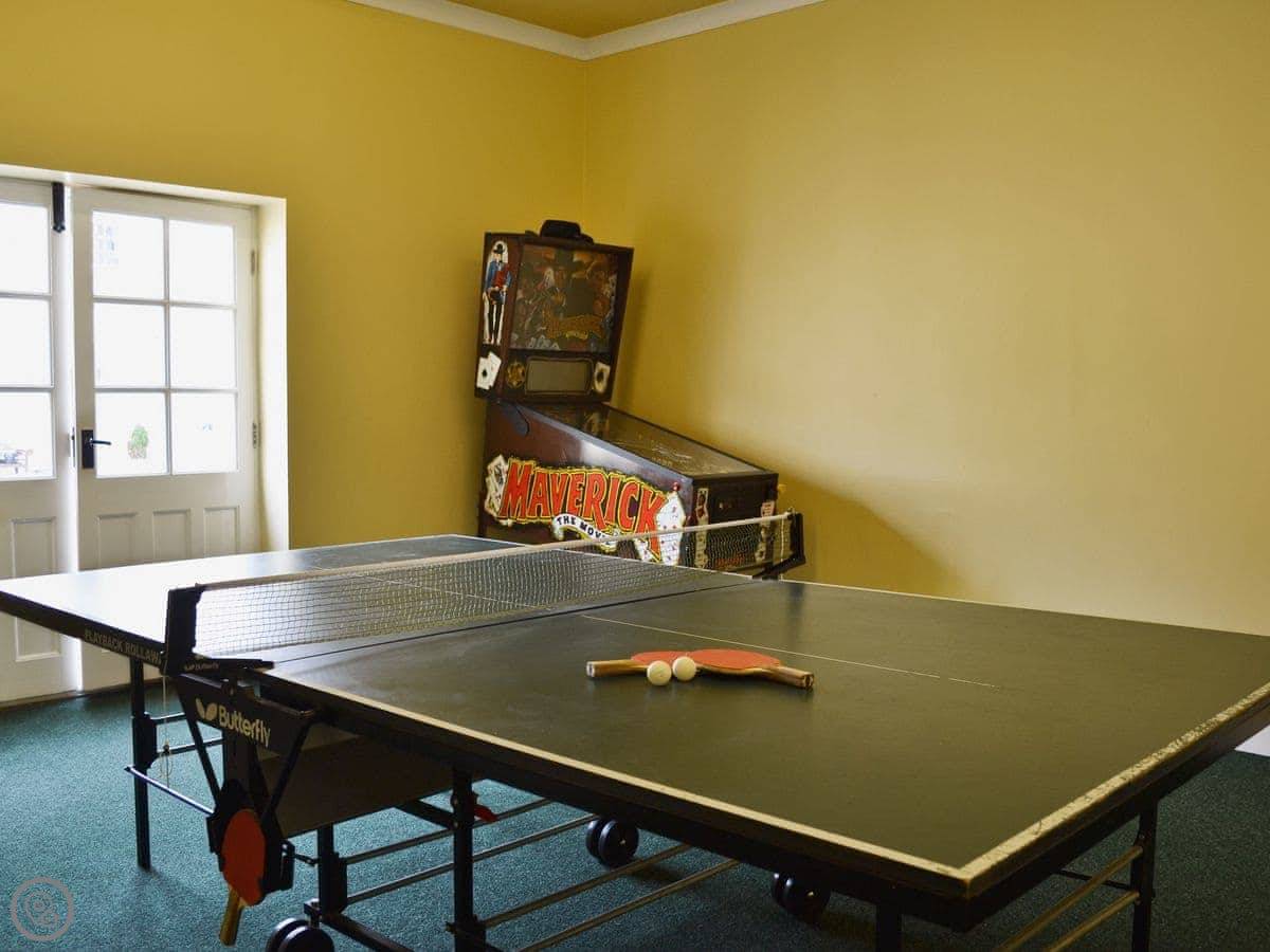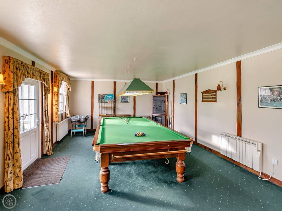 It sleeps ten. Five bedrooms, two bathrooms. It's a 4 Star property, so it's well-equipped and comfortable. The stairs are fine, just normal stairs. There’s a games room in the outbuilding with a pool table.