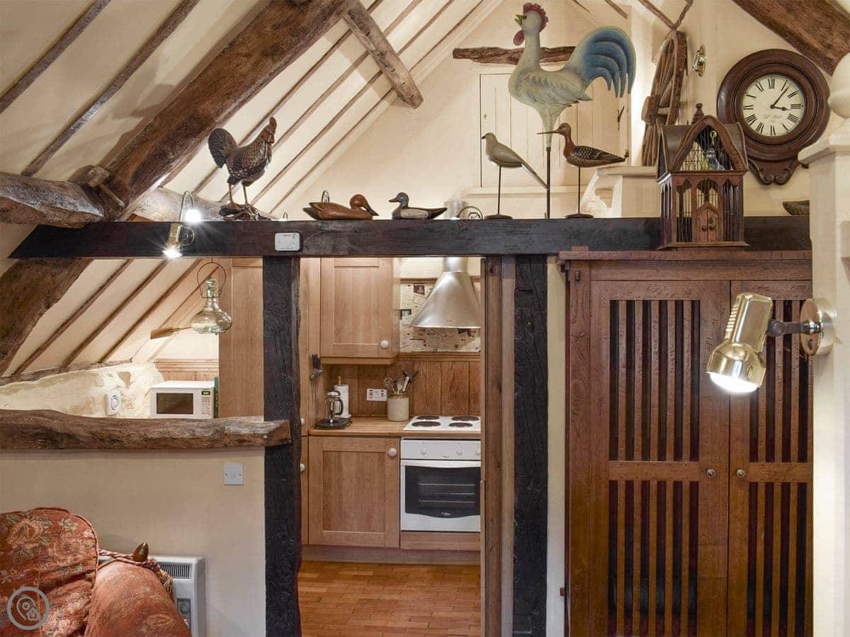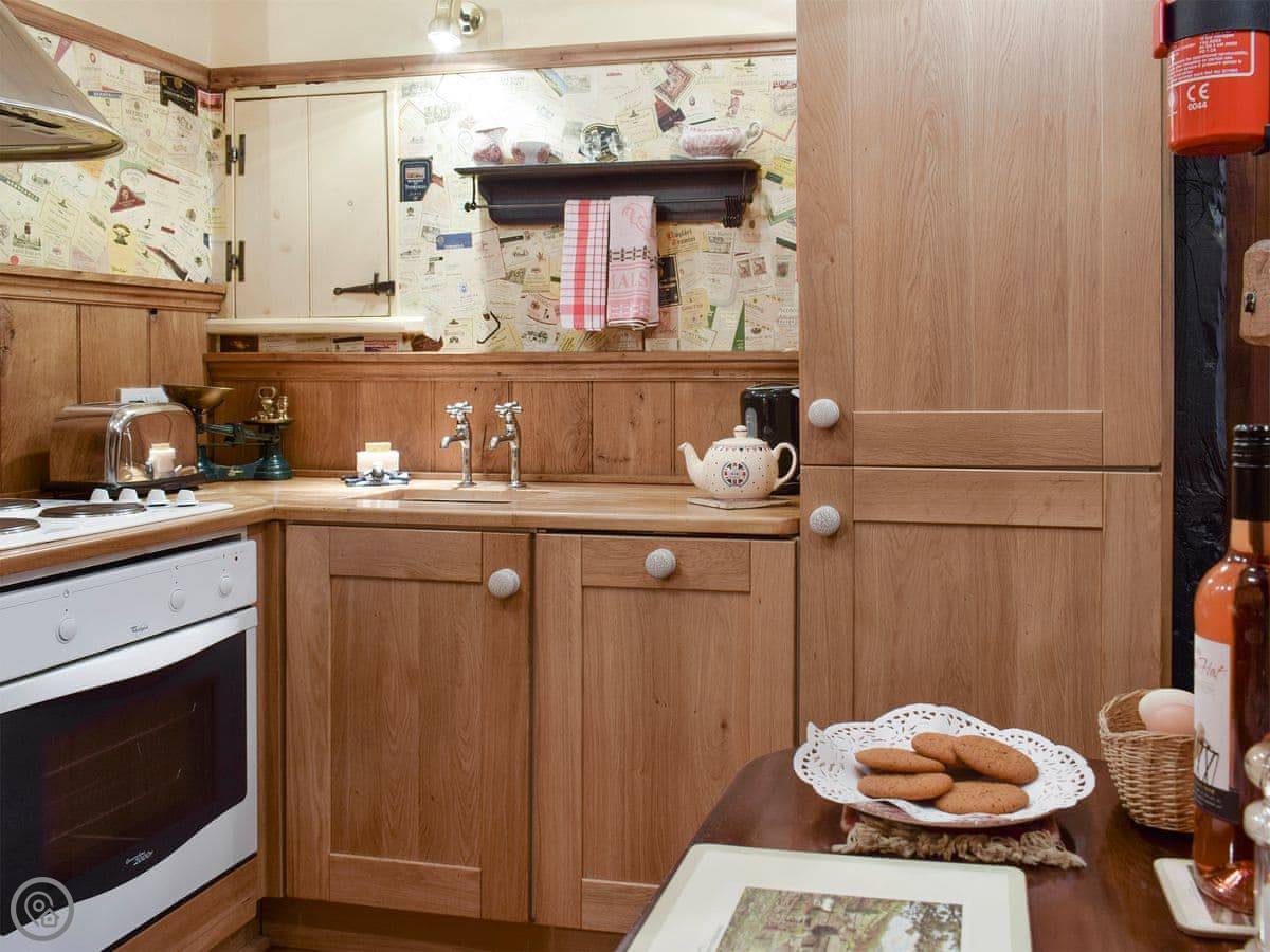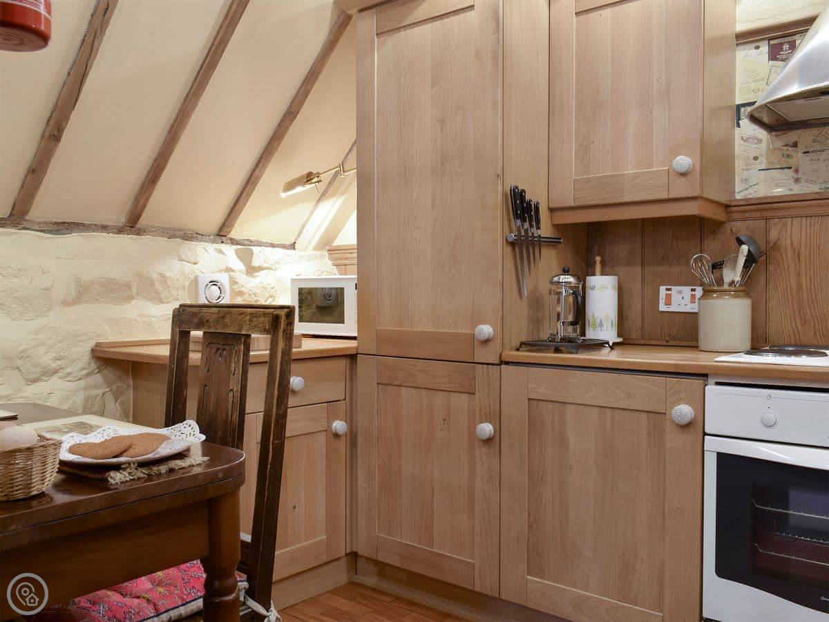 The room is all one space, so the double bed is in the same area as the sofa and kitchen. It works fine but there's no separate bedroom. The bathroom has a shower. It's got a wood burner which makes it really cosy in the winter.