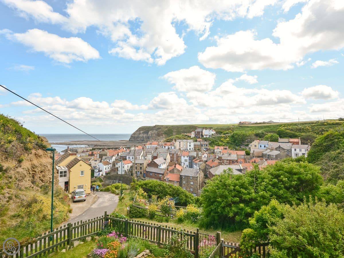 Tucked away on a hillside along a quiet lane, this 150-year-old holiday cottage enjoys enviable panoramic sea views over the picturesque fishing village of Staithes. Adjoining another property, it emanates a spacious and airy feel and has been furnished and equipped to a very good standard. Complemented by a wood burner and pretty cottage garden, it also has its own adjacent parking place. The quaint cobbled streets of Staithes, with tearooms, restaurants and pubs, are just a 2-minute stroll away. Beach 400 yards. Pub and restaurant 160 yards.