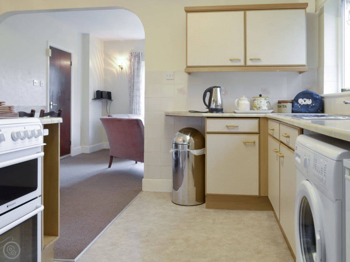 The living area is open plan. There's a wood burning stove for cooler evenings, and the kitchen has what you need. The garden is enclosed, with a patio area and a BBQ. You can bring one well-behaved dog.