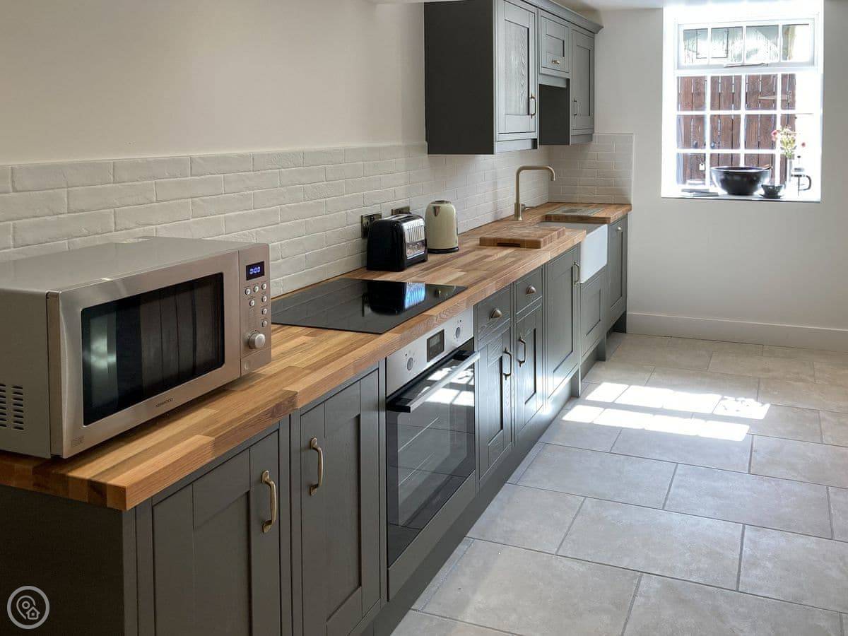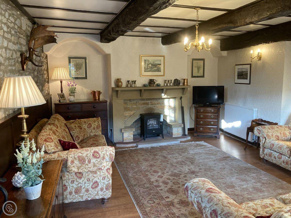 It sleeps seven in three bedrooms and has two bathrooms, which helps with a group that size. It’s got a 4 Star rating. There are a lot of original features, so you'll see exposed beams and a big stone fireplace with a multi-fuel burner. The stairs are typical cottage stairs, so they’re steep. Stairgates are fitted.