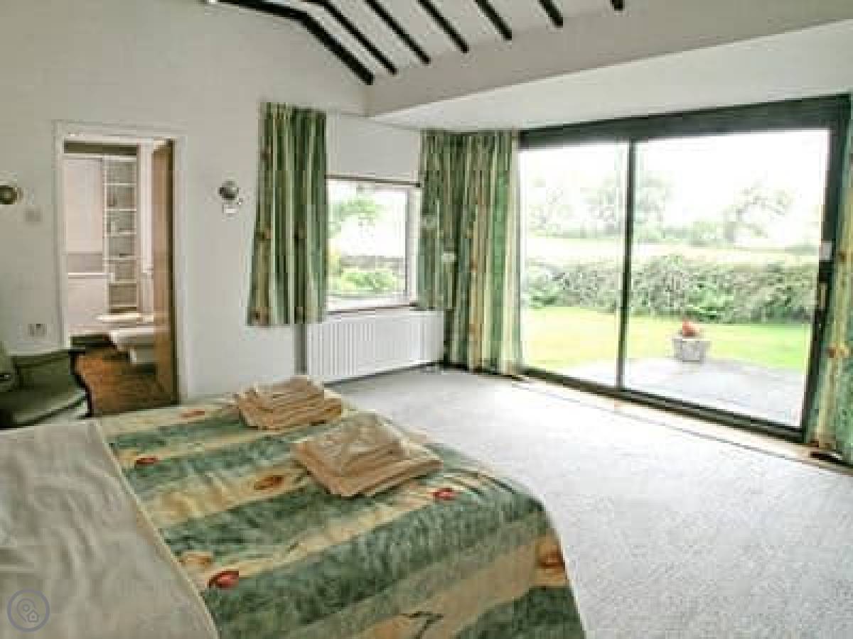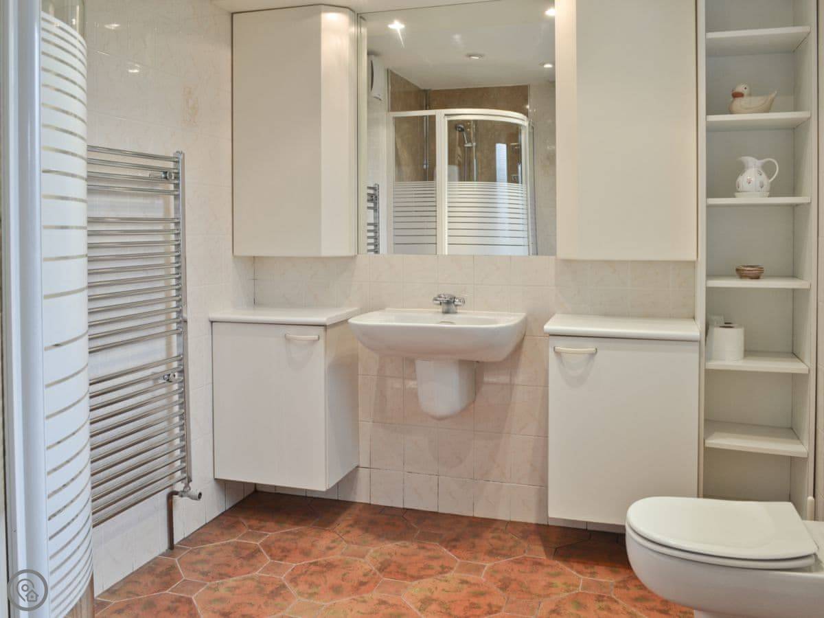 It sleeps four. Two bedrooms, both doubles, and each has its own bathroom. One has a power shower over the bath, the other just a walk-in shower. It feels light in there. We did it up in that simple Danish style, so it's tidy and clean, not cluttered.