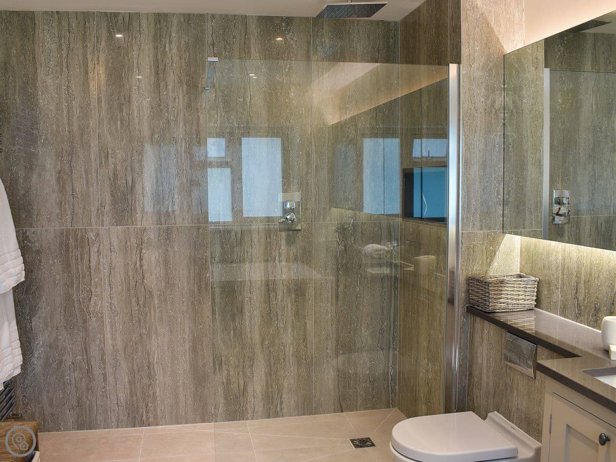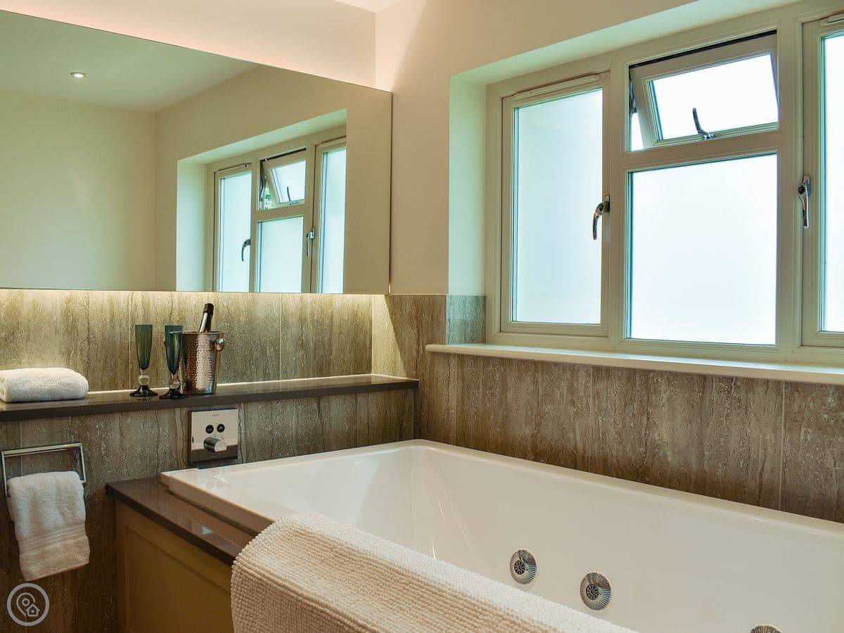 The bathroom has a walk-in shower and a double jacuzzi bath. It's a proper hot tub sort of bath, but inside.