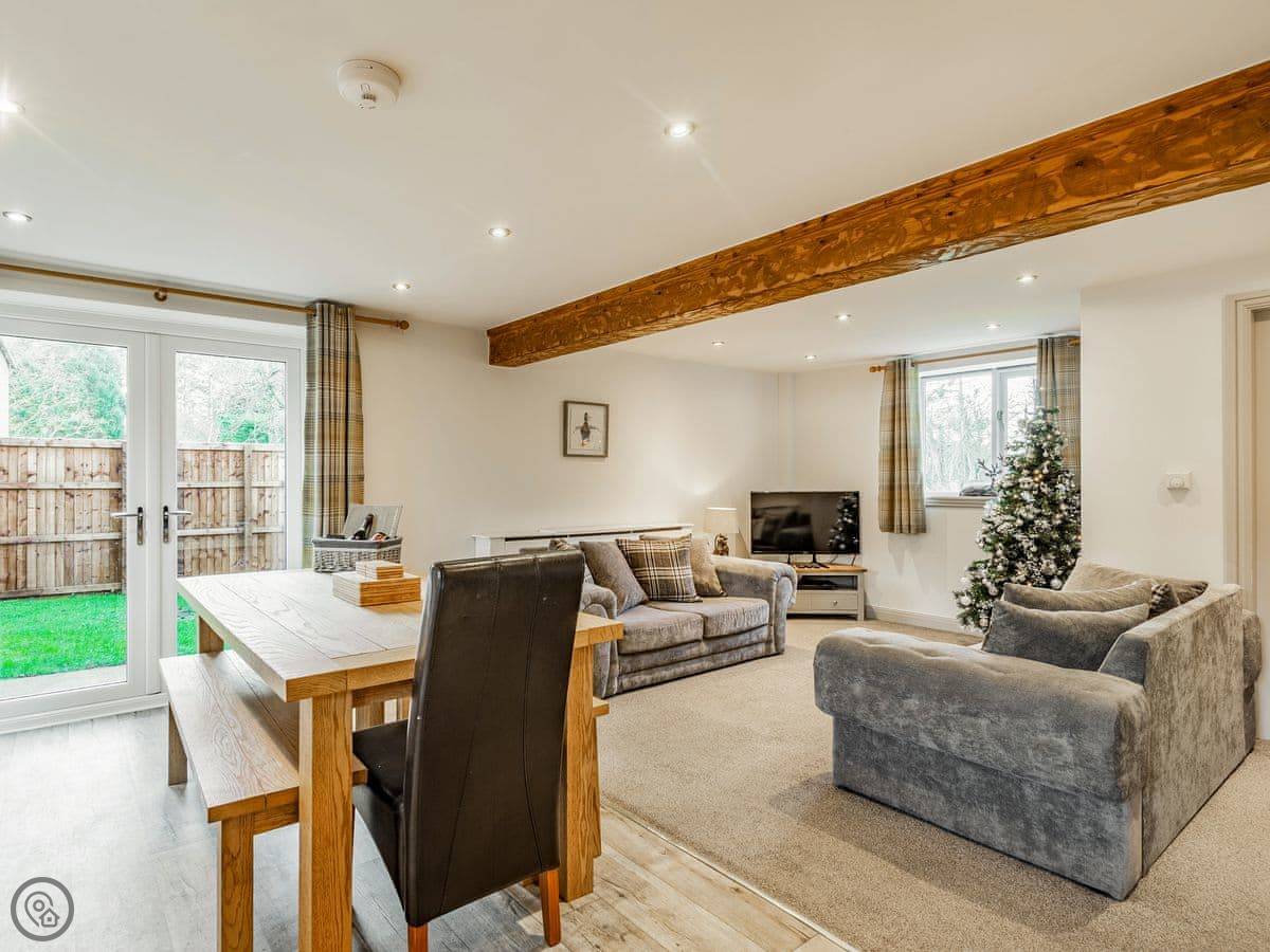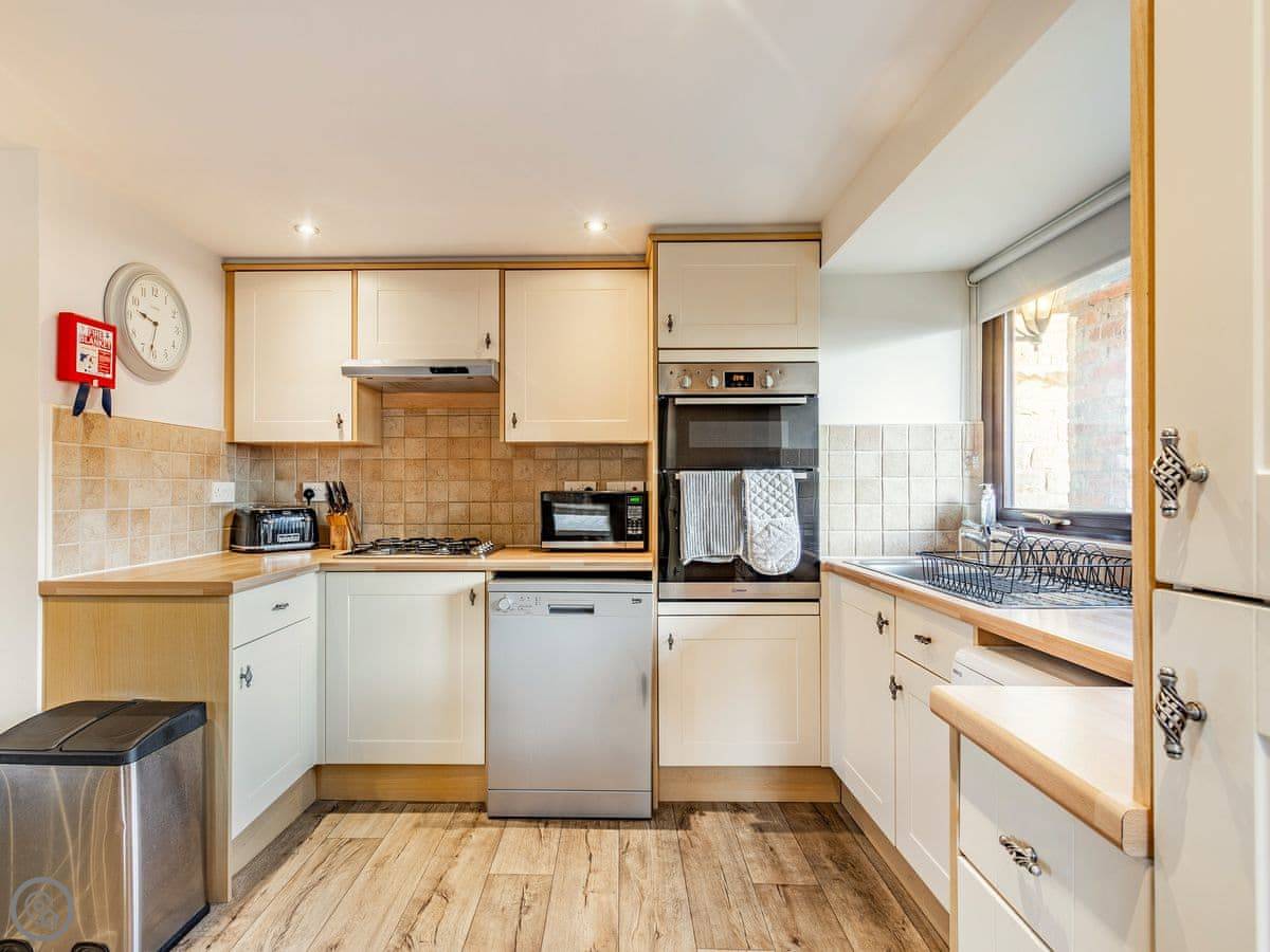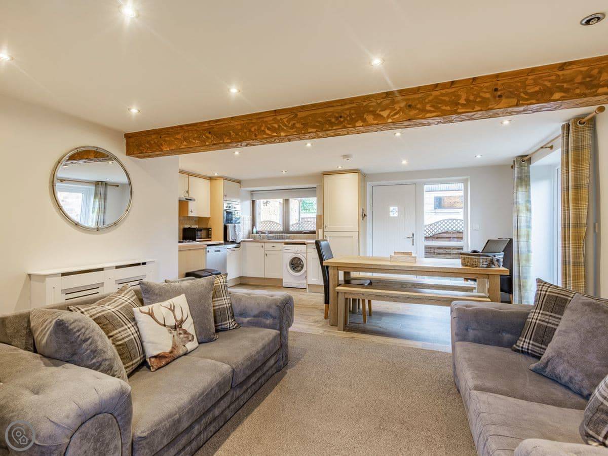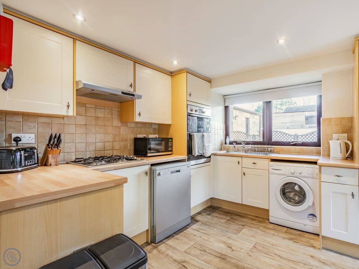 Inside, it's open plan on the ground floor. There's a dishwasher, washing machine, TV, and WiFi. Bedding and towels are included. We can provide a cot and highchair. There's parking right outside.