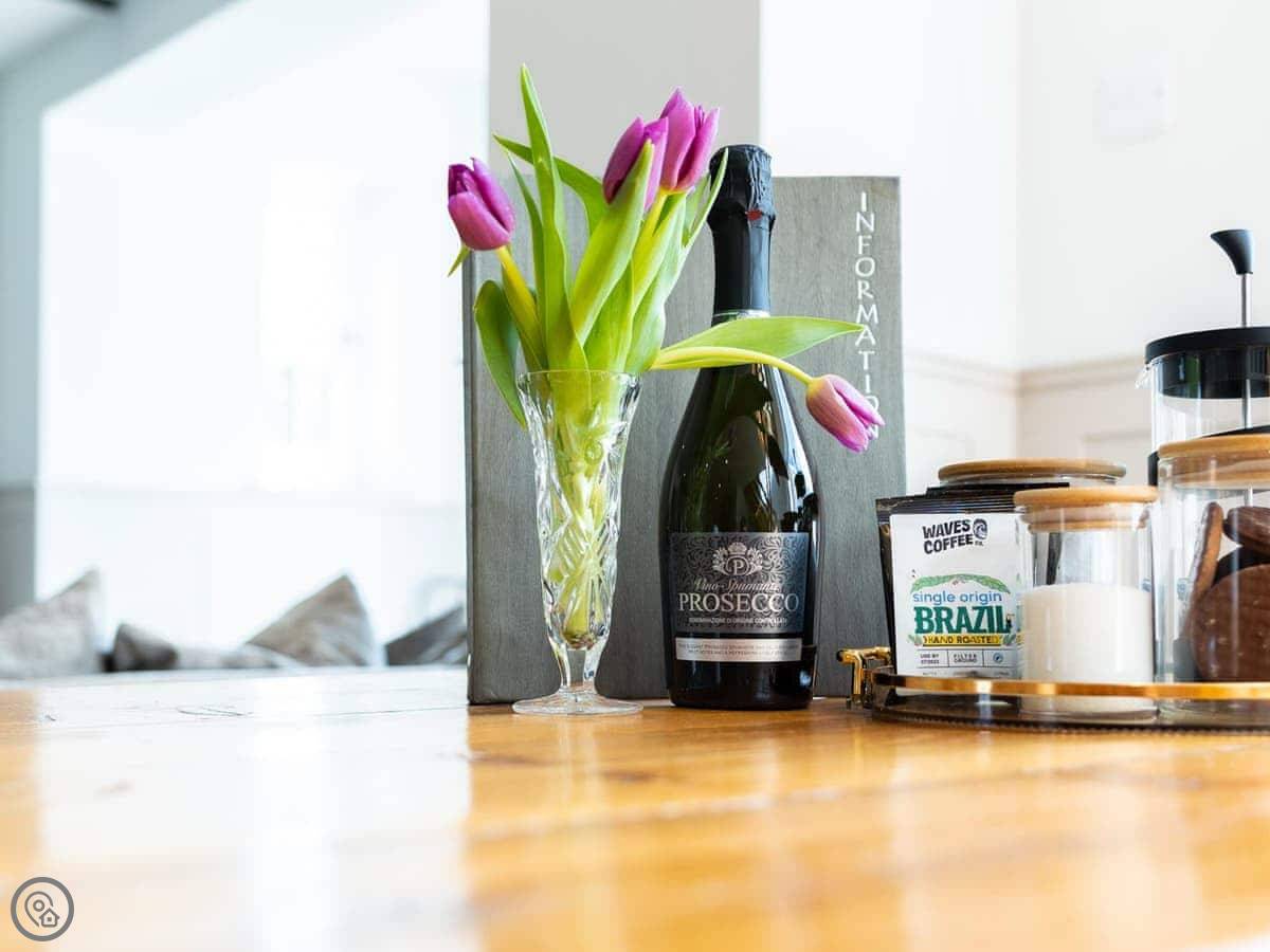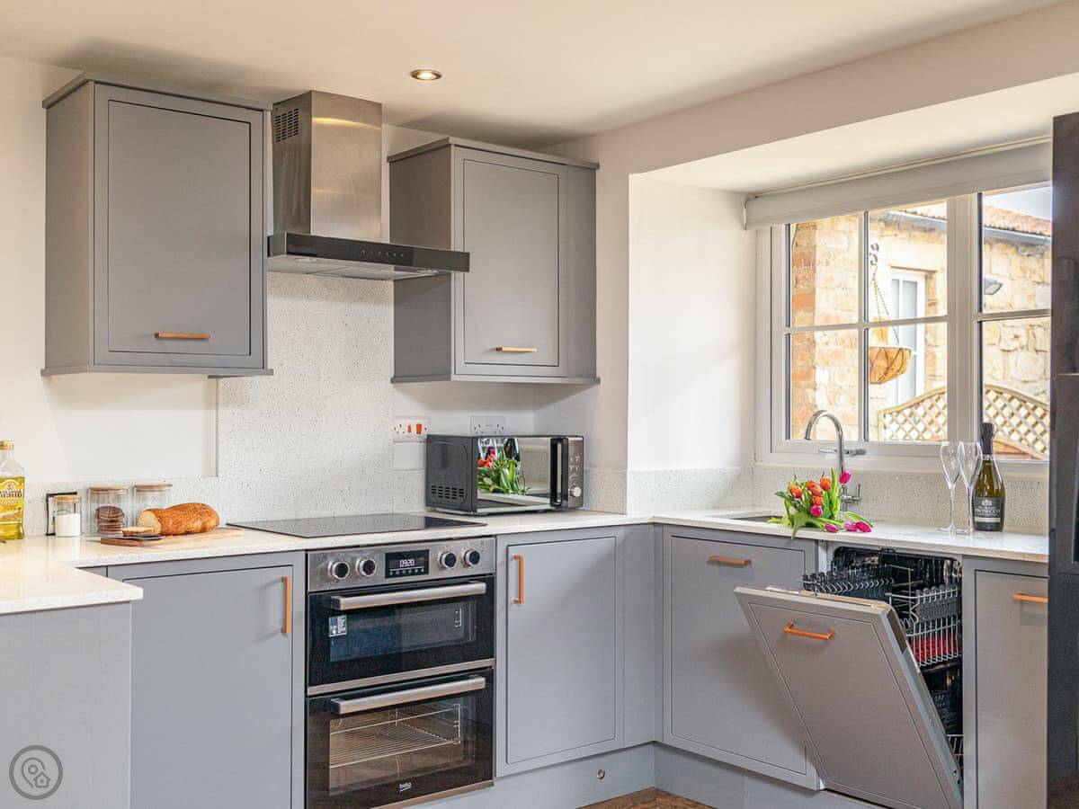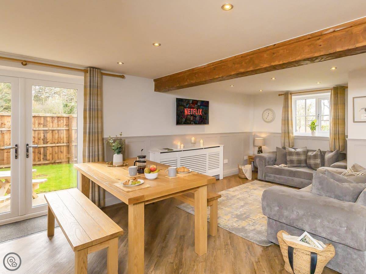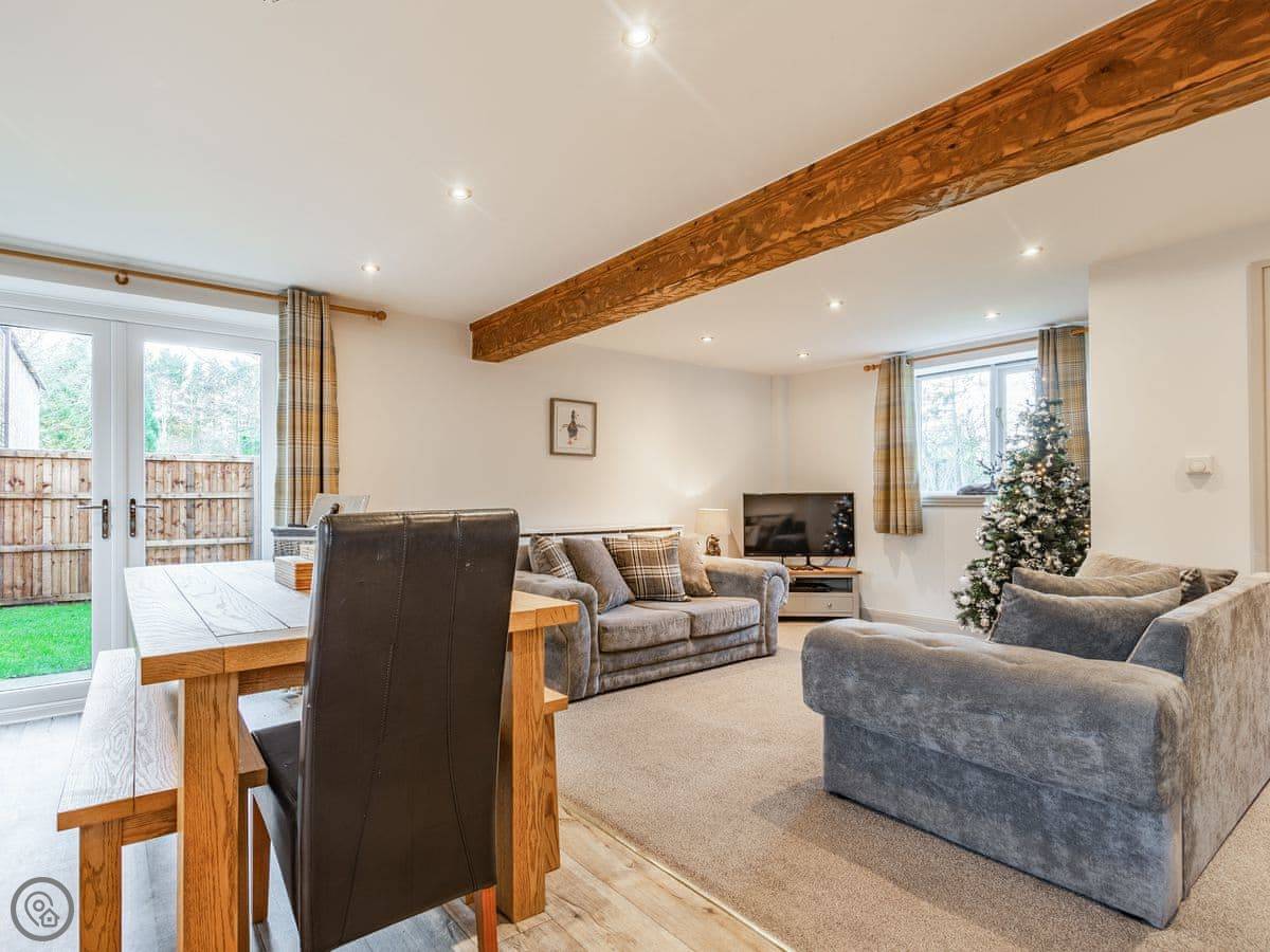 Inside, it's open plan on the ground floor. There's a dishwasher, washing machine, TV, and WiFi. Bedding and towels are included. We can provide a cot and highchair. There's parking right outside.