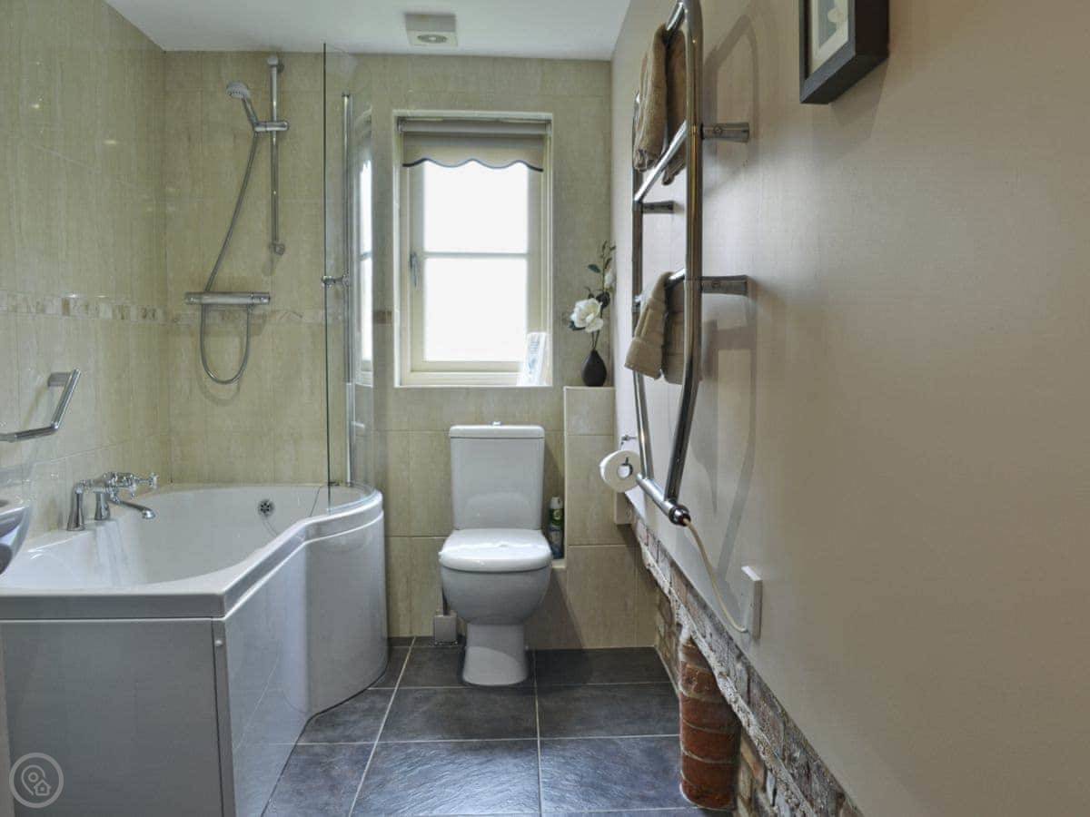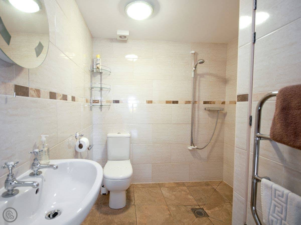 It’s all on one level inside, no steps. The doorways are wide and the shower is walk-in with a seat and rails. There’s a good level of access if you need it.
