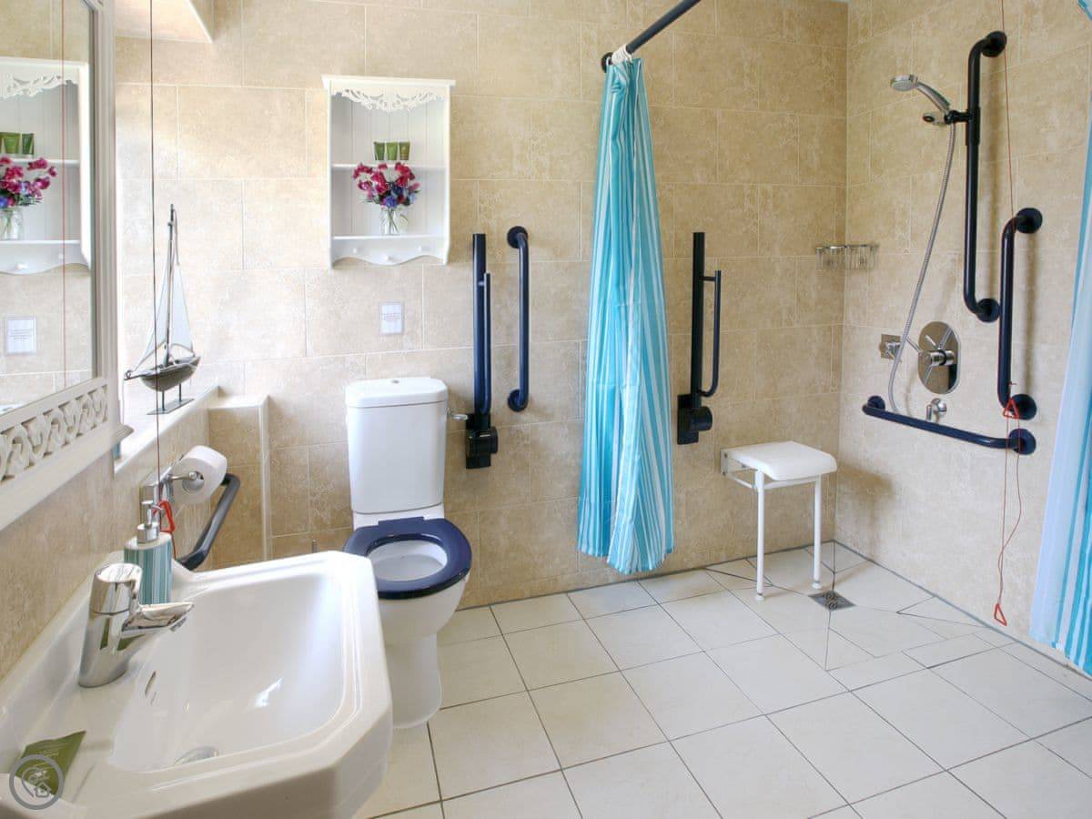 It sleeps four. Two bedrooms, one bathroom. The bathroom has a walk-in shower with a seat and grab rails. It's got a 5 Star rating. That means it's well finished and comfortable. It's open plan, so the living, dining, and kitchen area is all one space. There's a wood burning stove.