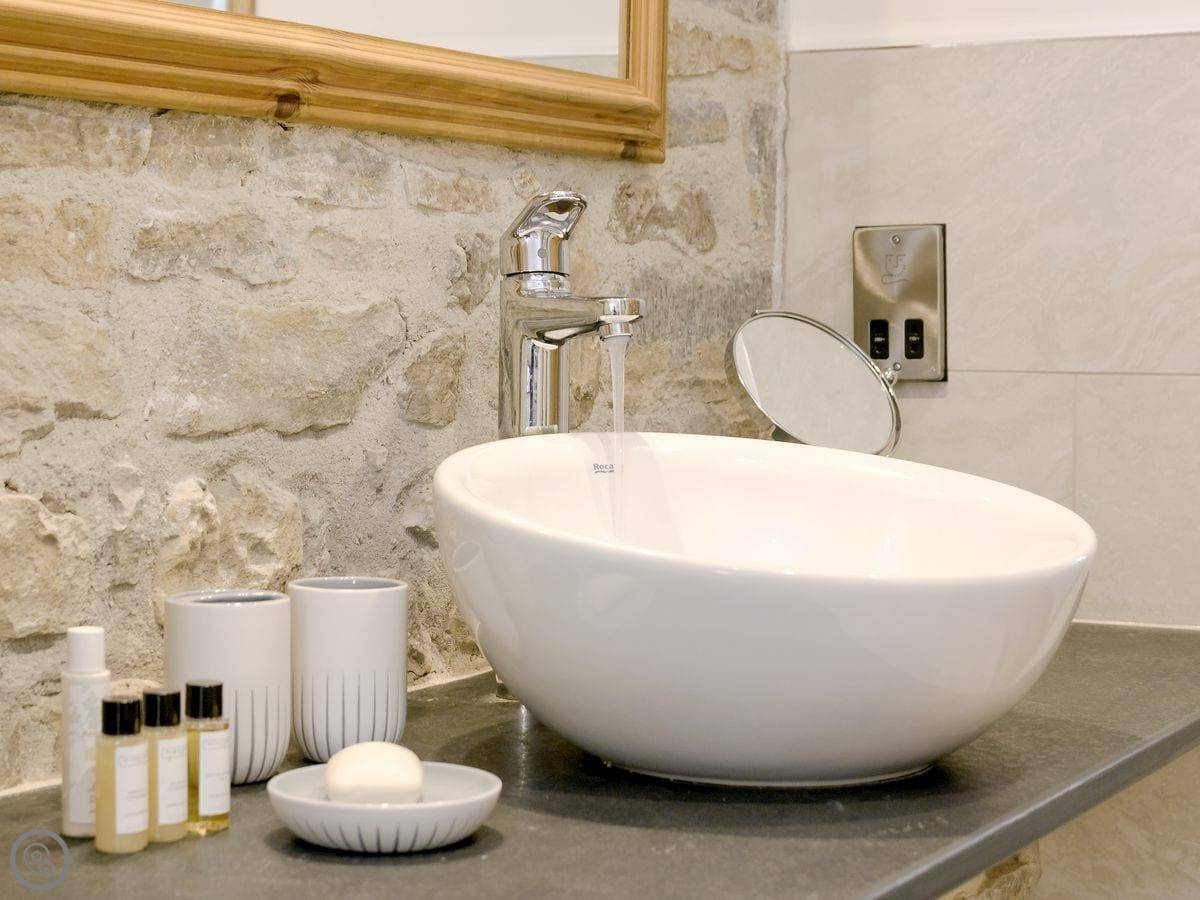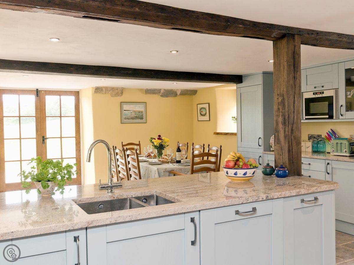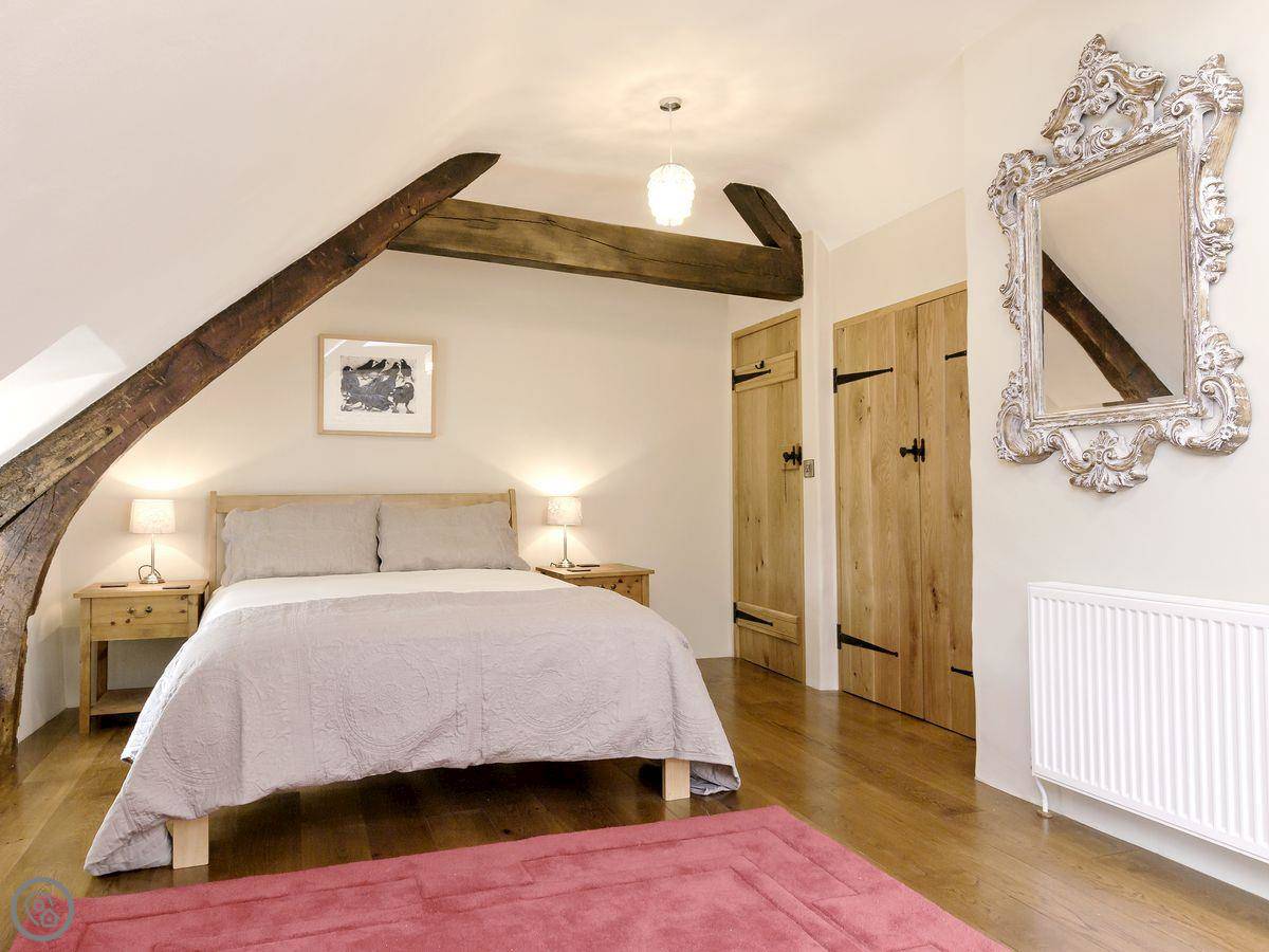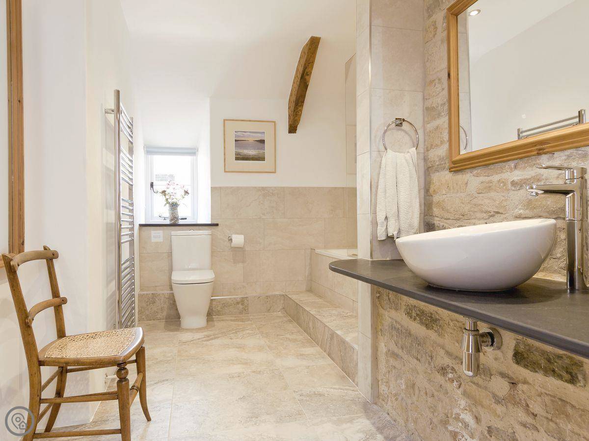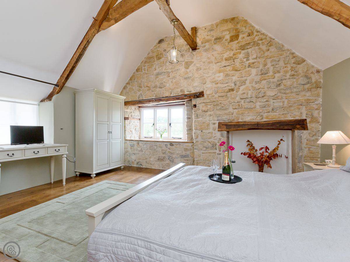 It sleeps six. There are three bedrooms and each one has its own bathroom, which is handy. It's got a 5 Star rating, which means it's been done to a high standard. They've kept old things like the big fireplace and beams, but put in modern comforts too.