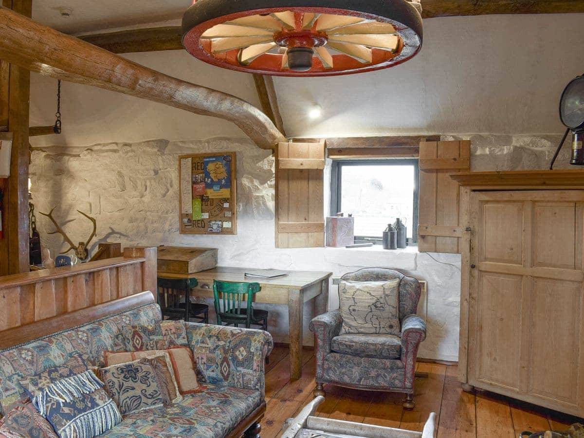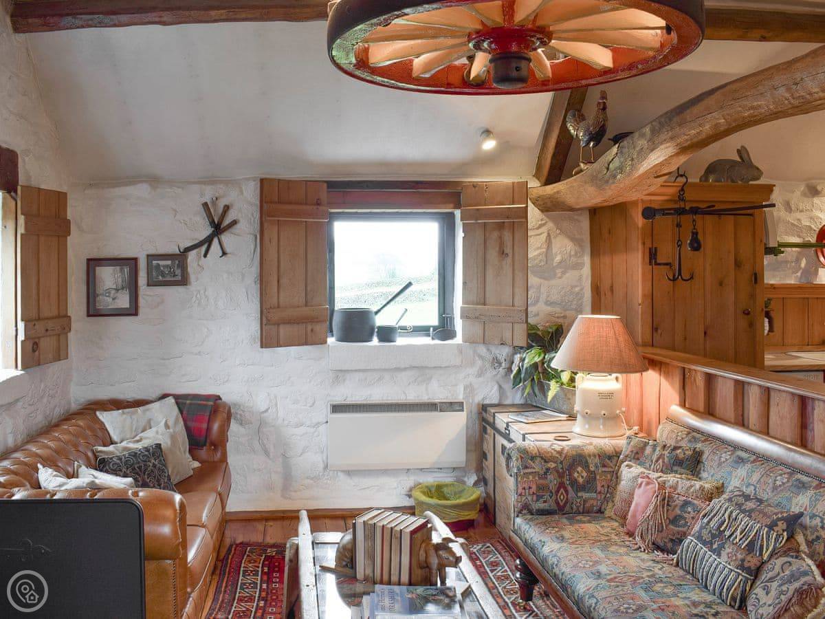 It sleeps four. Two bedrooms, one bathroom. It has a 4 Star rating. The main room is open plan, with a kitchen, dining area, and living space. There's a wood-burning stove. It's an old building, so the floors can be a bit uneven in places. That's normal for here.