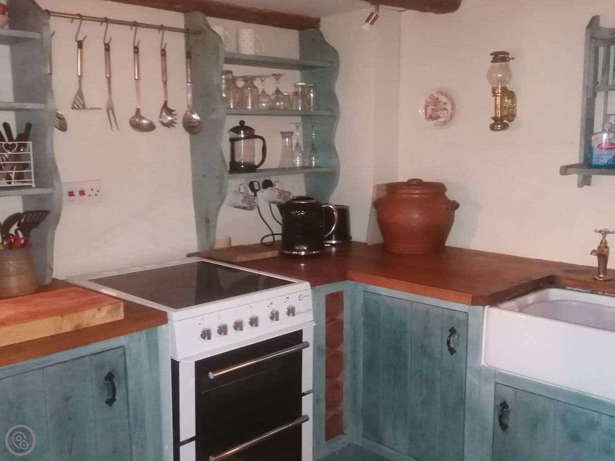 Inside, it's a proper old cottage with low beams. Mind your head. There's a woodburning stove for colder nights, a TV, wifi, and a washing machine. All the bedding and towels are included.