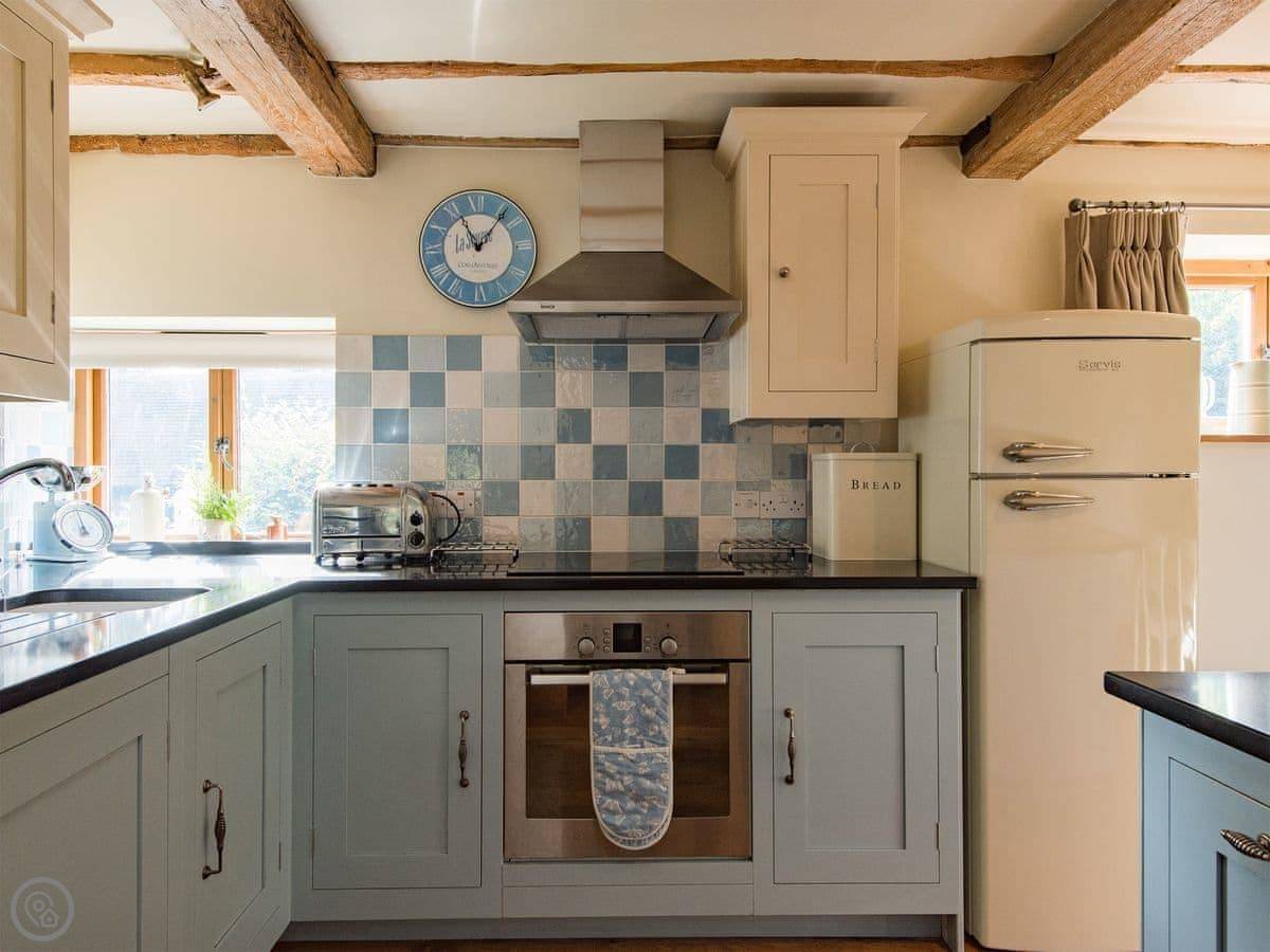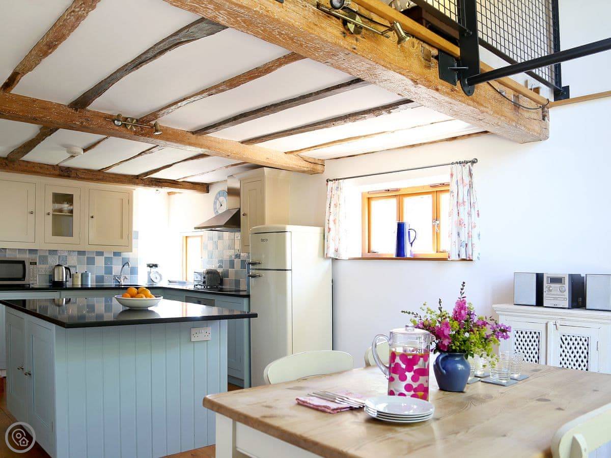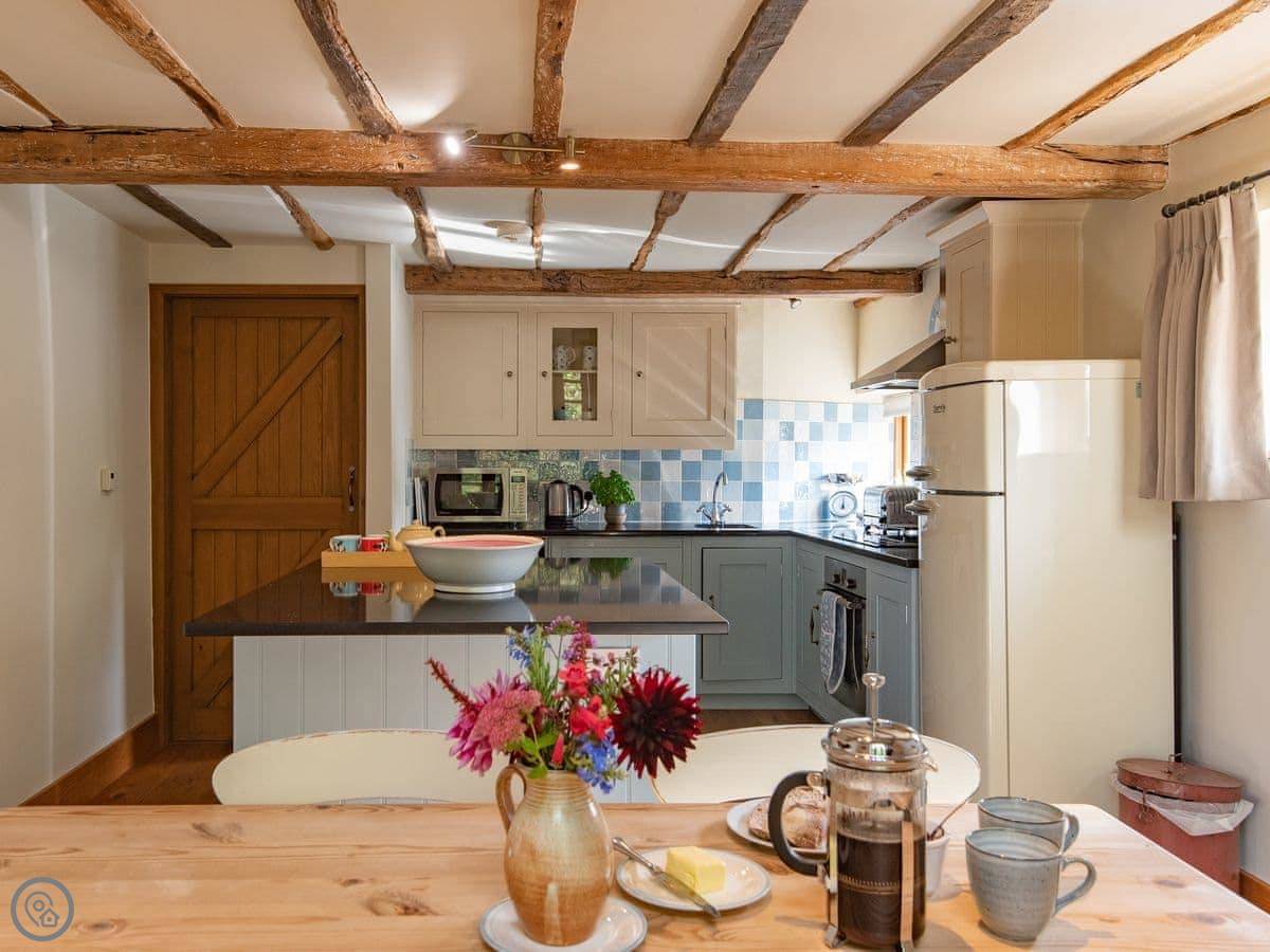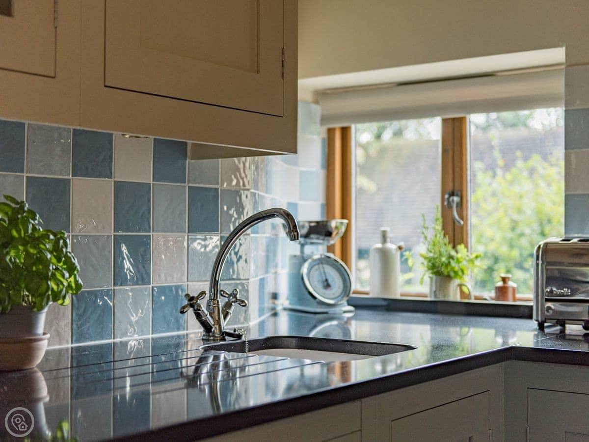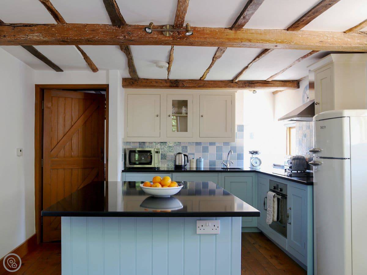 Inside, it's got underfloor heating. The kitchen has a big granite island. There's a washing machine, dishwasher, WiFi, and Sky TV. Bedding and towels are included. There's a cot if you need it.
