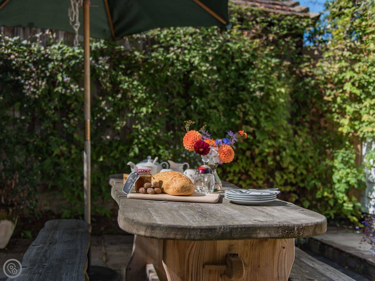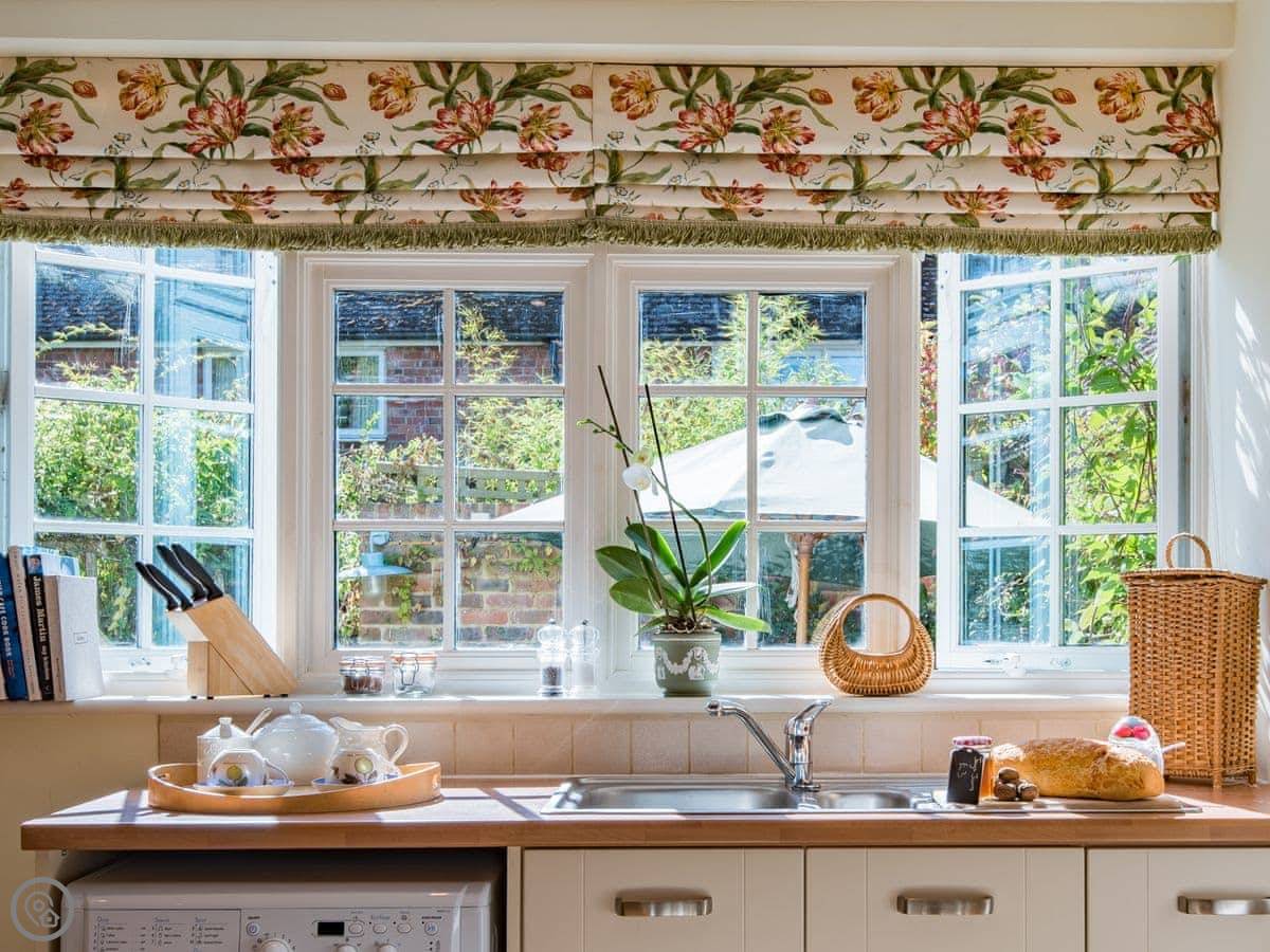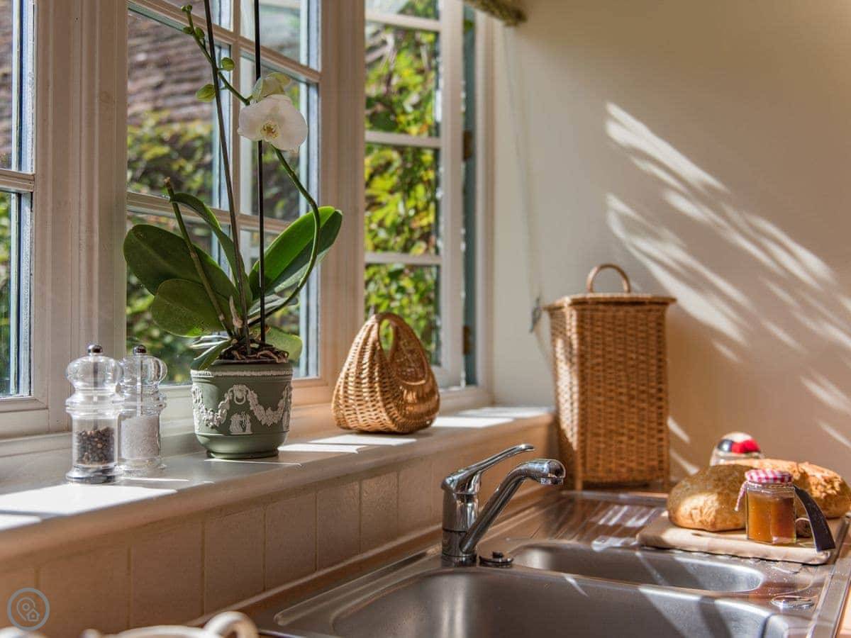 The kitchen's been updated. It's got a butler sink and a washing machine. The main sitting area is open with the kitchen, so it feels spacious. There's a patio and garden area outside that's yours.