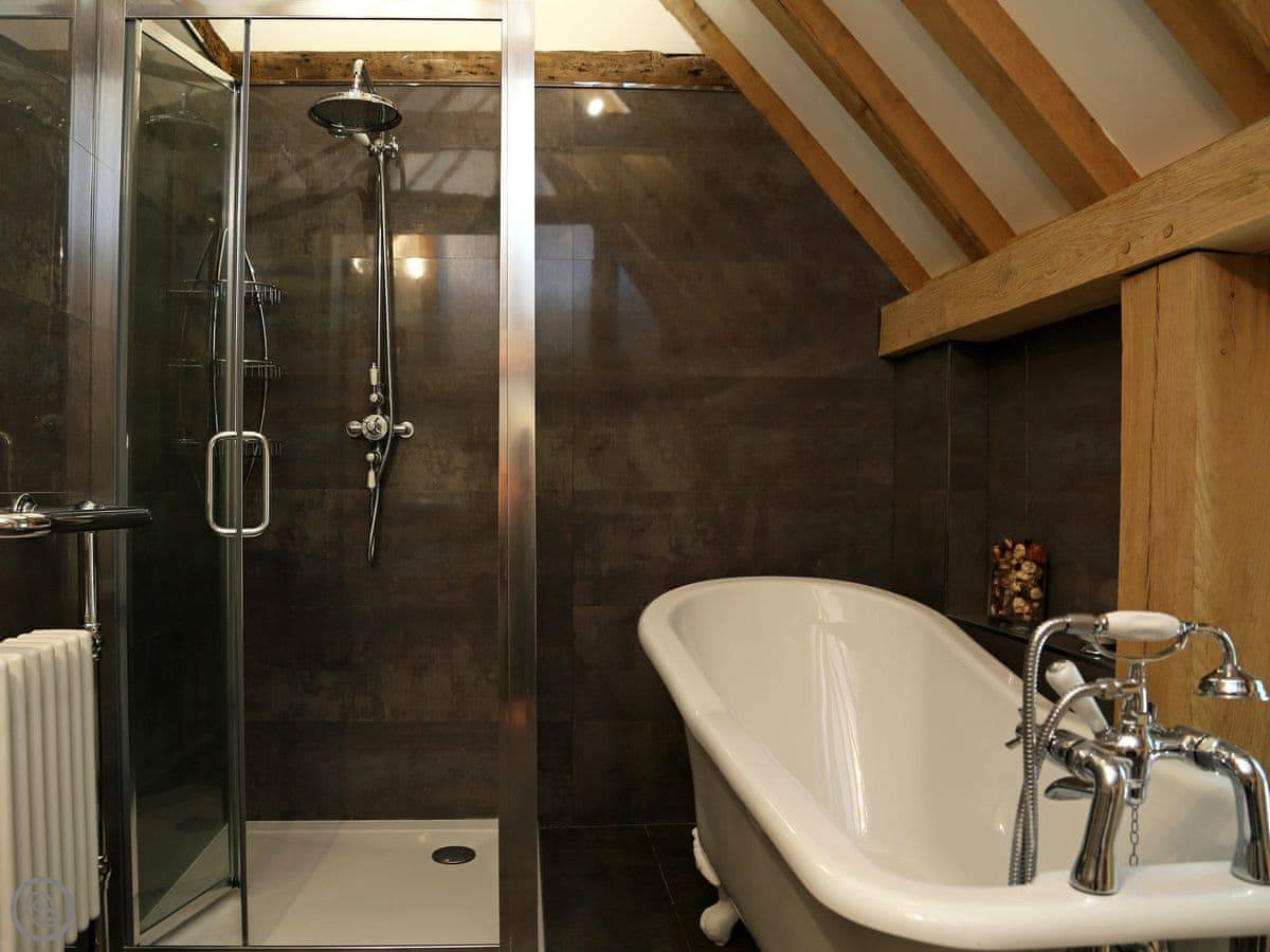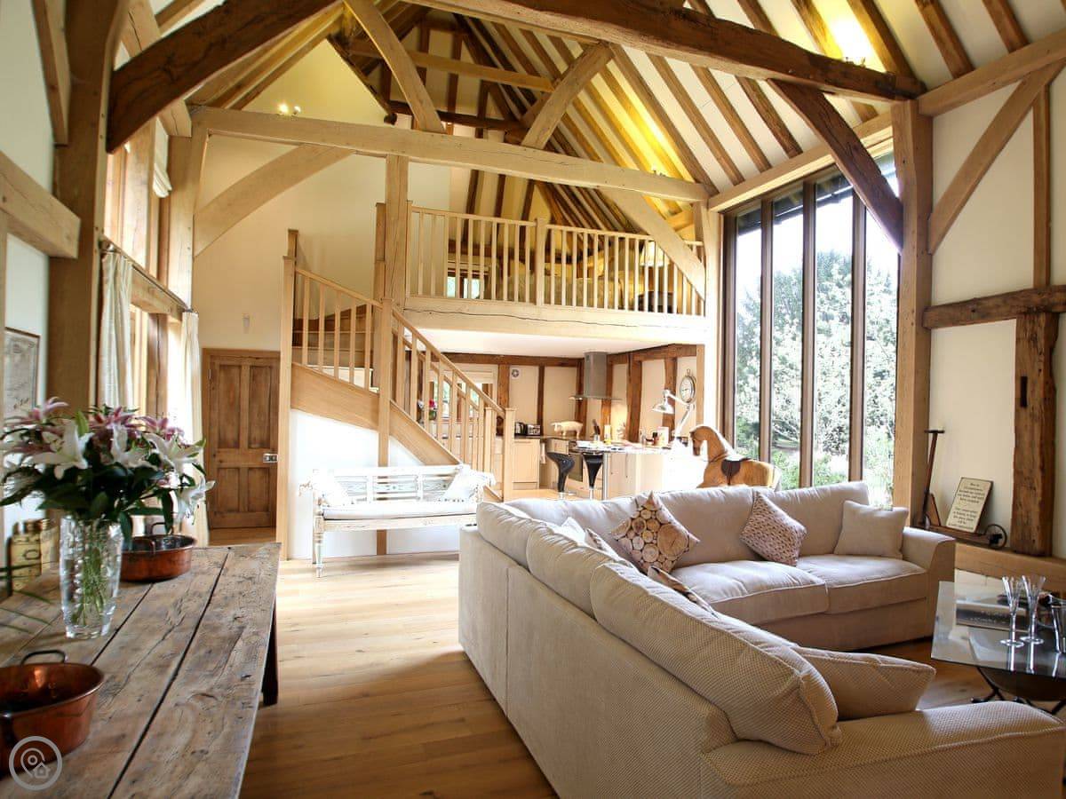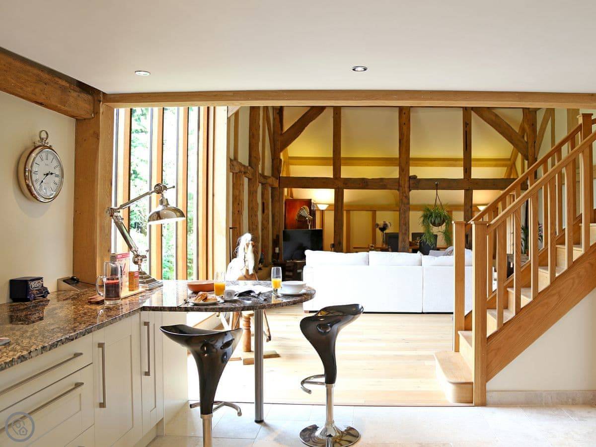 The accommodation is in a detached barn that sits proudly within the grounds of the adjacent main house. It has been recently re-built using the utmost quality and care. Many of the oak beams have been repaired or replaced by master craftsmen - from the same company responsible for the rebuilding of Shakespeare’s Globe Theatre! The high ceiling and wooden beam structure are a particular feature. The bedroom is on a galleried mezzanine level accessed via a beautiful oak staircase and has a magnificent 2 metre superking size bed; hand crafted using ancient beams from the old barn. Customer comfort is very much at the heart of the design.