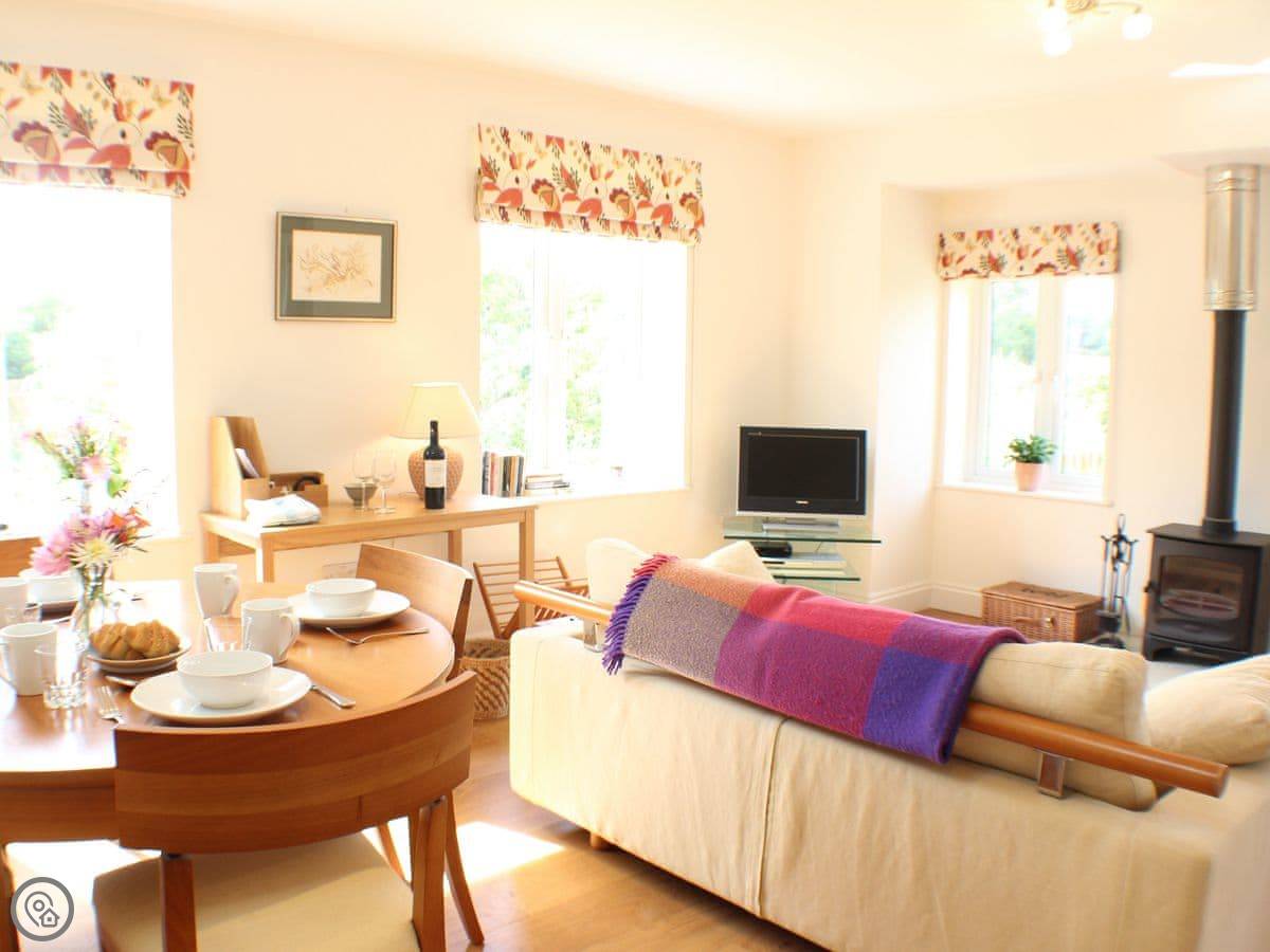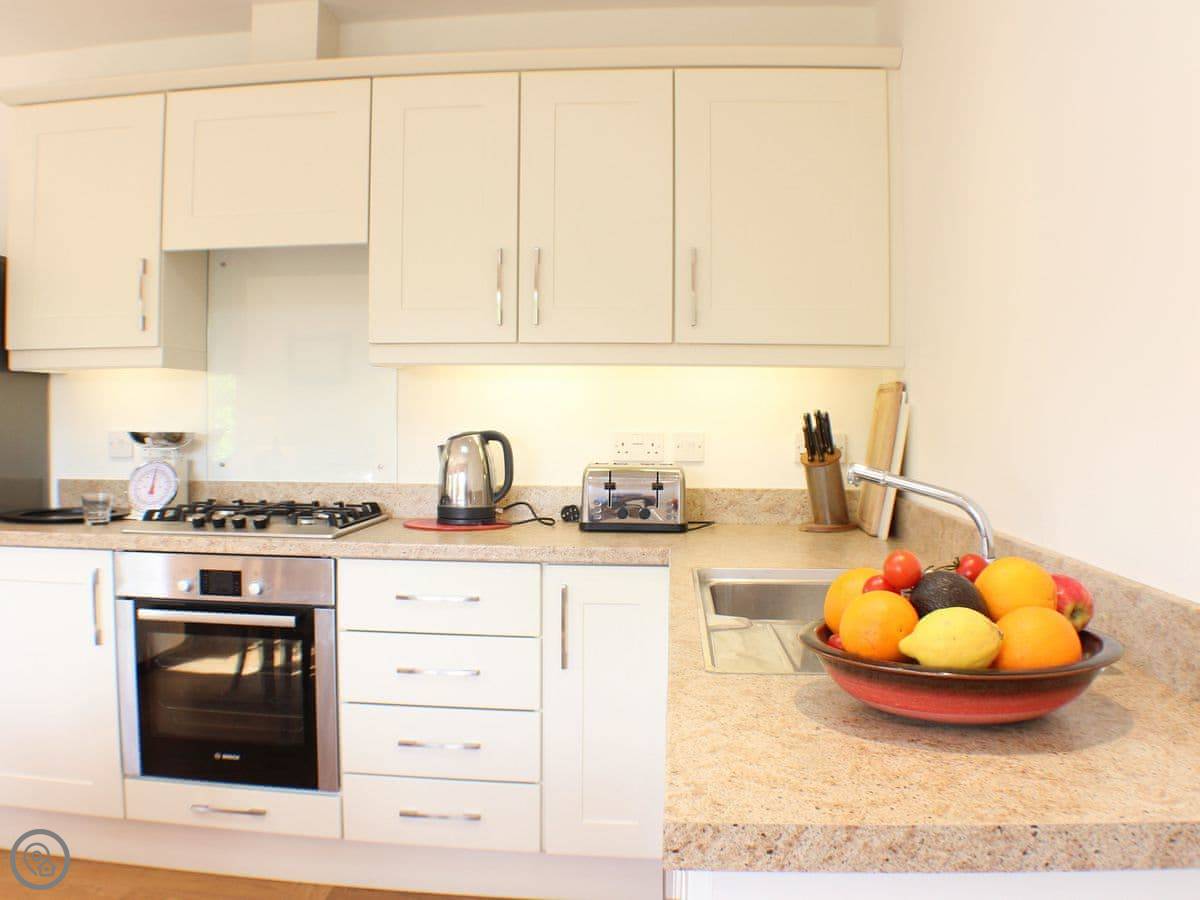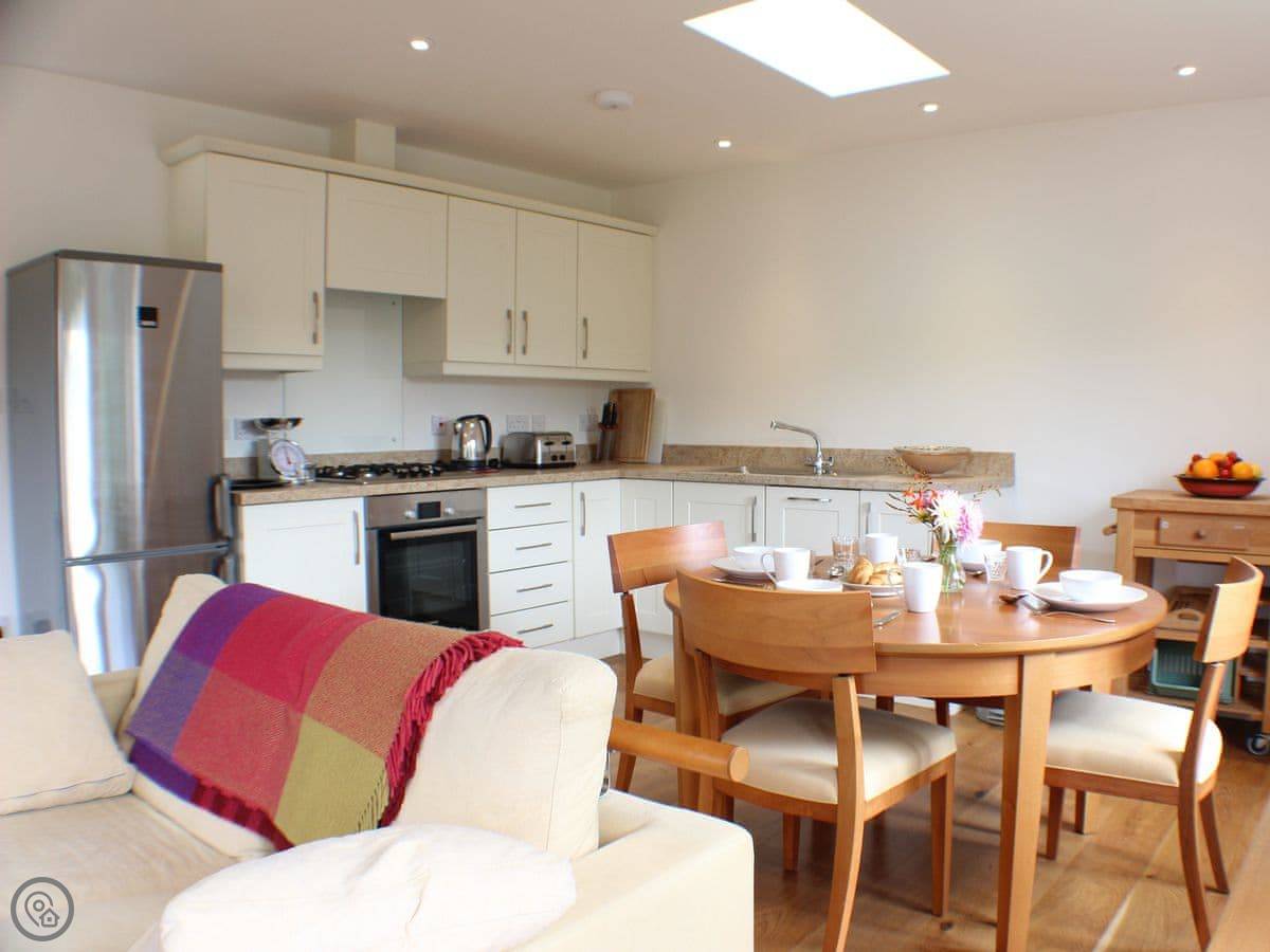 It's for two people. One bedroom, one bathroom. It's got a 4 Star rating – it's modern and well-equipped. Everything's open plan. It's bright, with a wood burner, and there's a new kitchen fitted with a dishwasher.