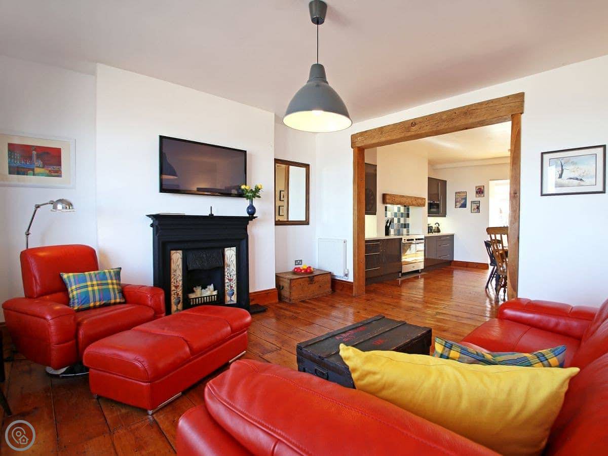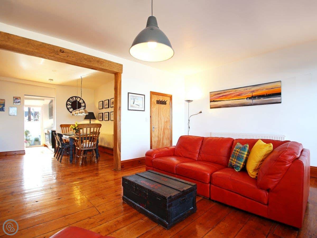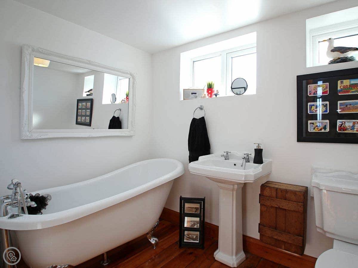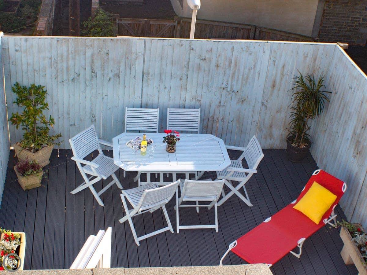 It sleeps six. There are three bedrooms and two bathrooms upstairs. One bathroom has a roll-top bath. It's got a 4 Star rating. The place has been renovated, so it's modern inside with wooden floors. The kitchen is open plan and leads out to a terrace. It's not huge, but it's private.