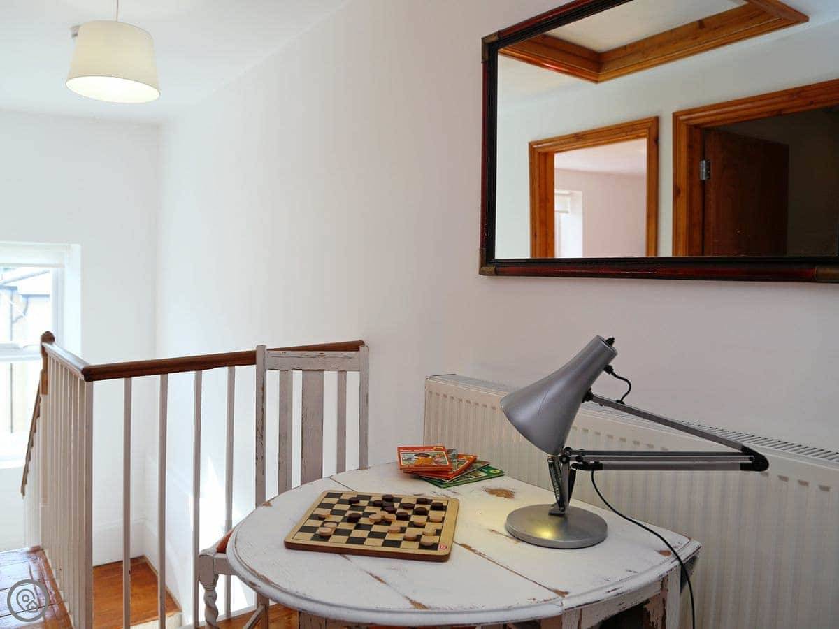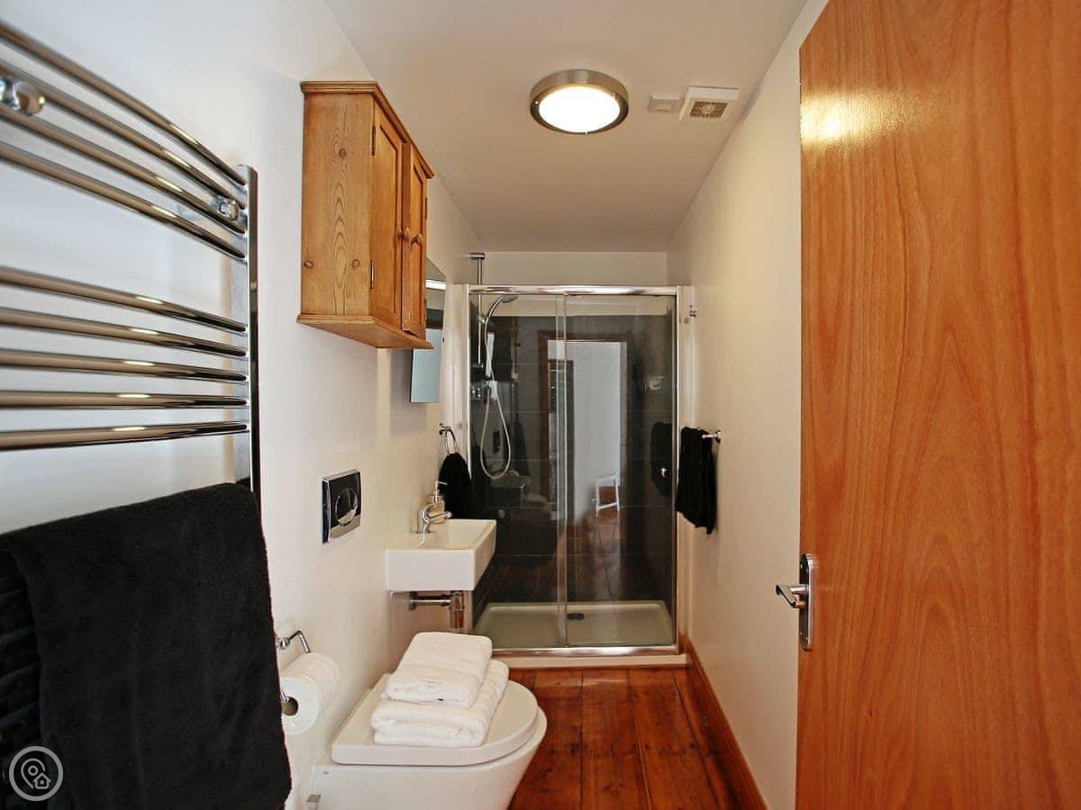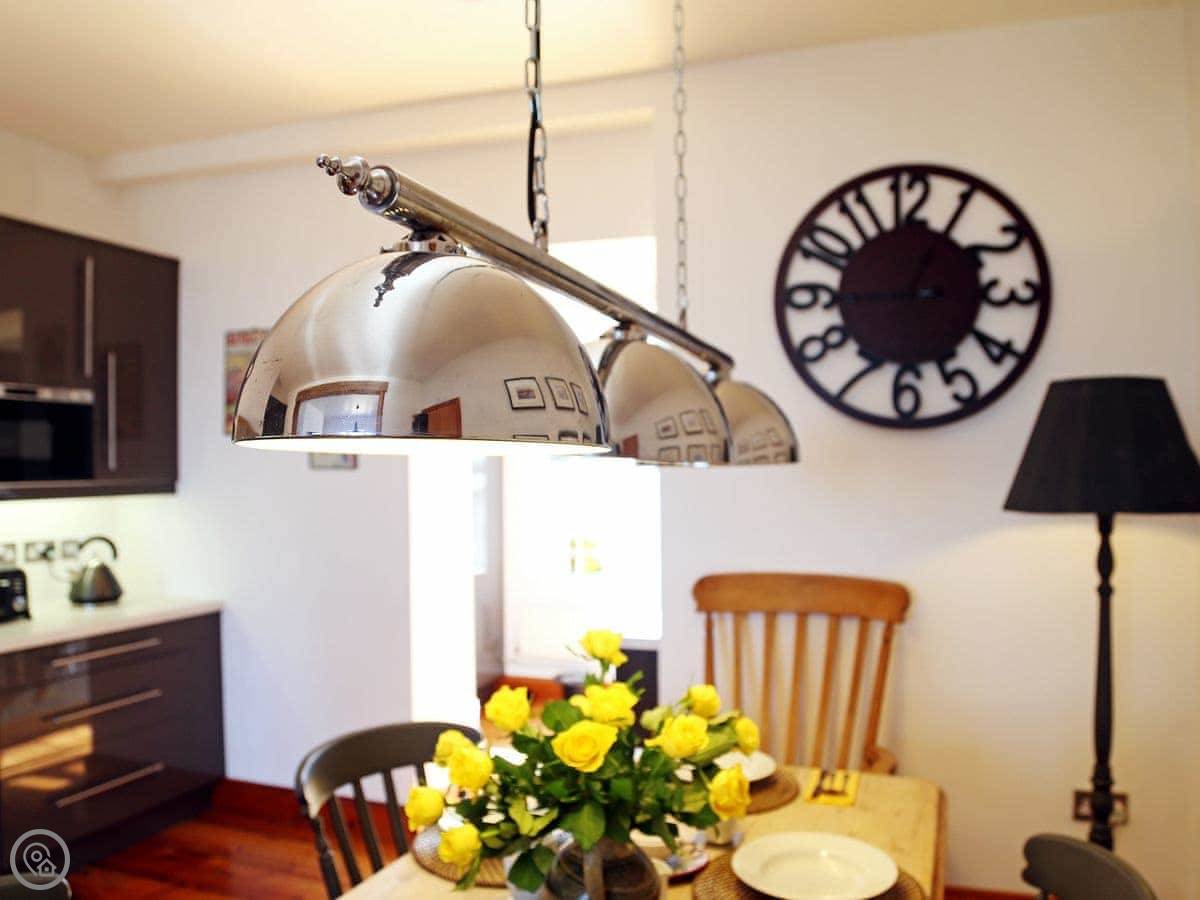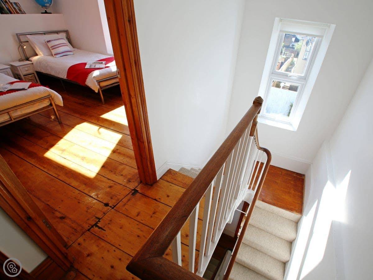 It sleeps six. There are three bedrooms and two bathrooms upstairs. One bathroom has a roll-top bath. It's got a 4 Star rating. The place has been renovated, so it's modern inside with wooden floors. The kitchen is open plan and leads out to a terrace. It's not huge, but it's private.