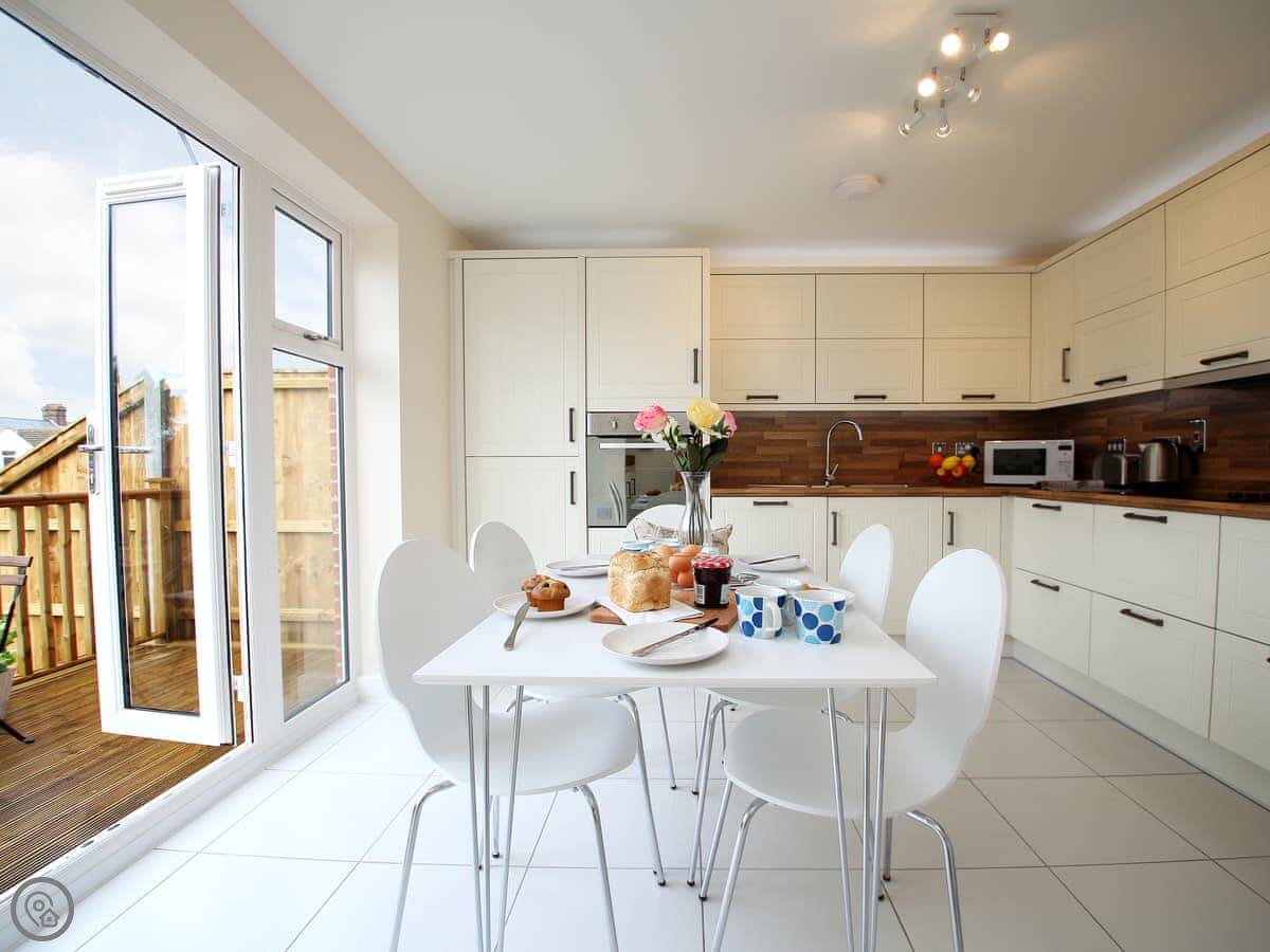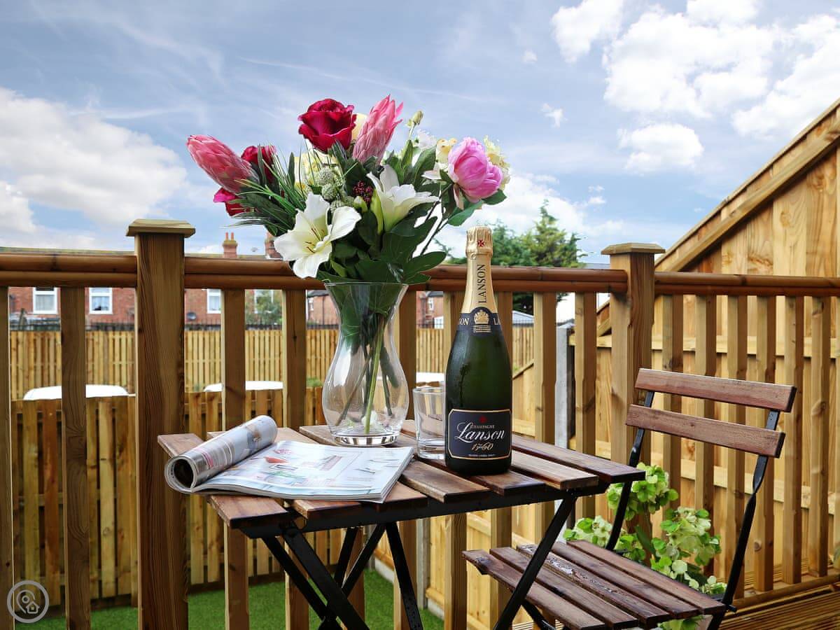 The back garden is decked and enclosed, so it's safe for kids. It gets the sun in the evening. You can step straight out from the kitchen.