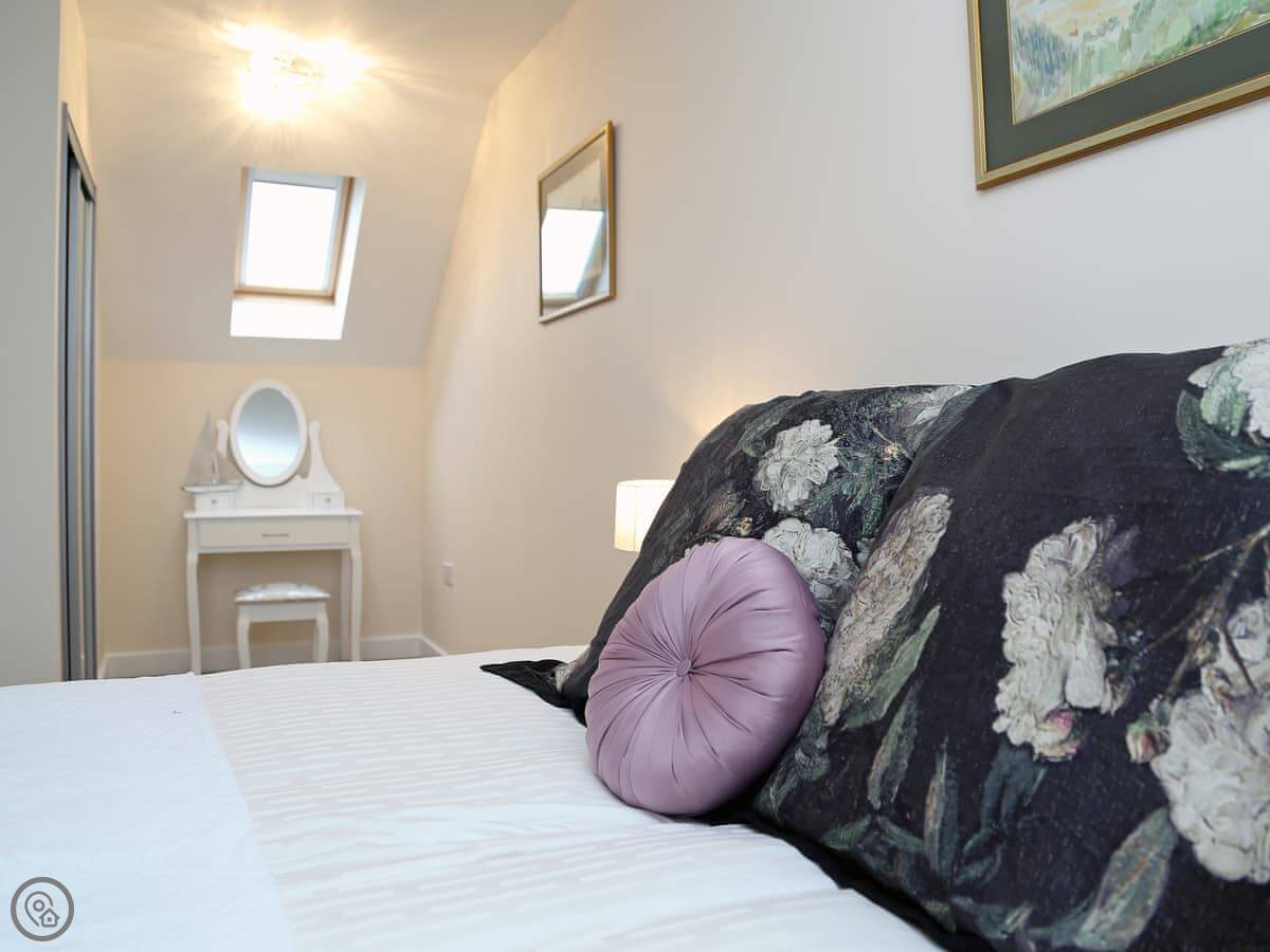 It sleeps six. Three bedrooms, two bathrooms. One bedroom is right at the top, in the eaves. It's got an en-suite and a good view of the sea. The other two are twins on the first floor. It's a 4 Star place, so it's well equipped and comfortable.