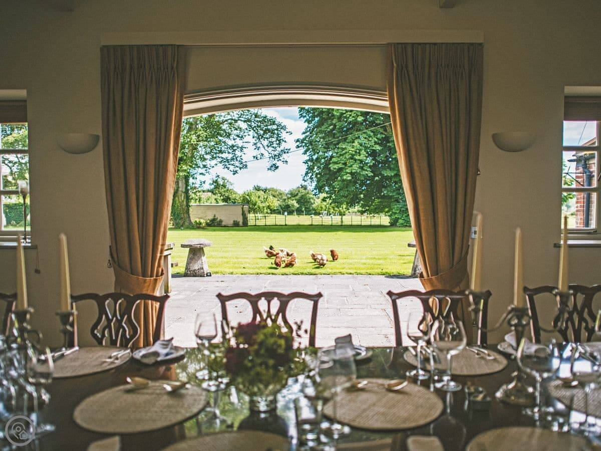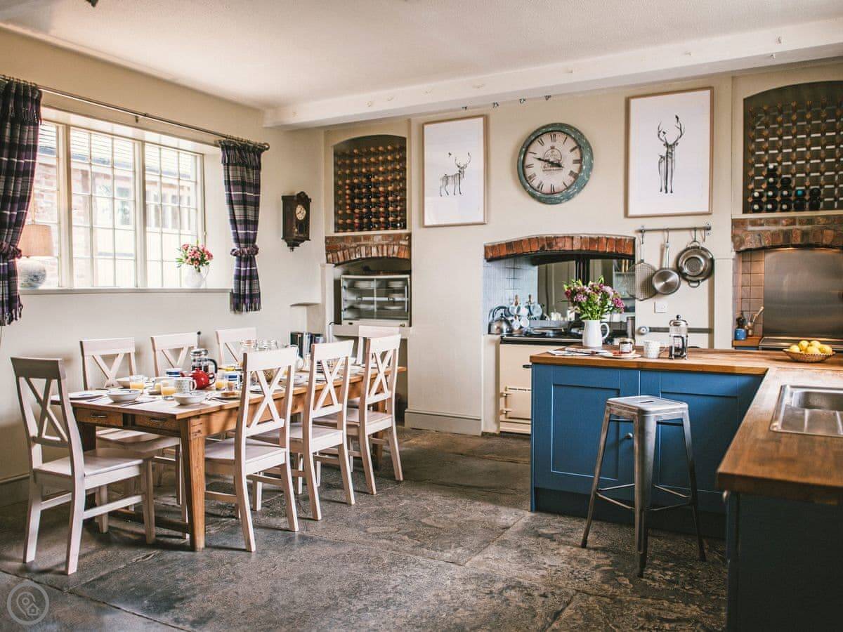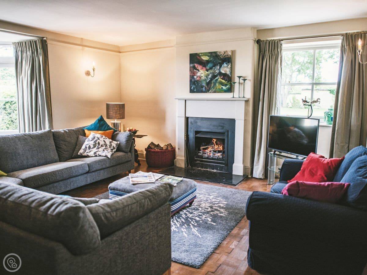 Inside, there's a kitchen with an Aga and all the kit. The dining room has big doors that open onto the terrace. The main living room has a huge sofa, an open fire, and a bar area. There's a separate sitting room too, a bit quieter.