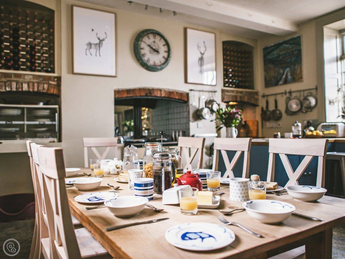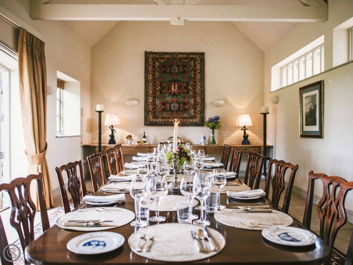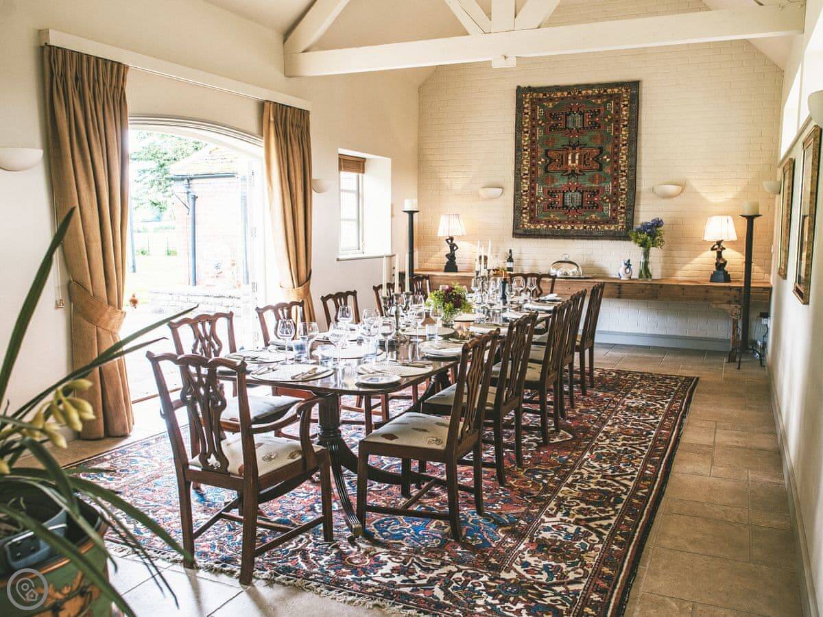 Inside, there's a kitchen with an Aga and all the kit. The dining room has big doors that open onto the terrace. The main living room has a huge sofa, an open fire, and a bar area. There's a separate sitting room too, a bit quieter.