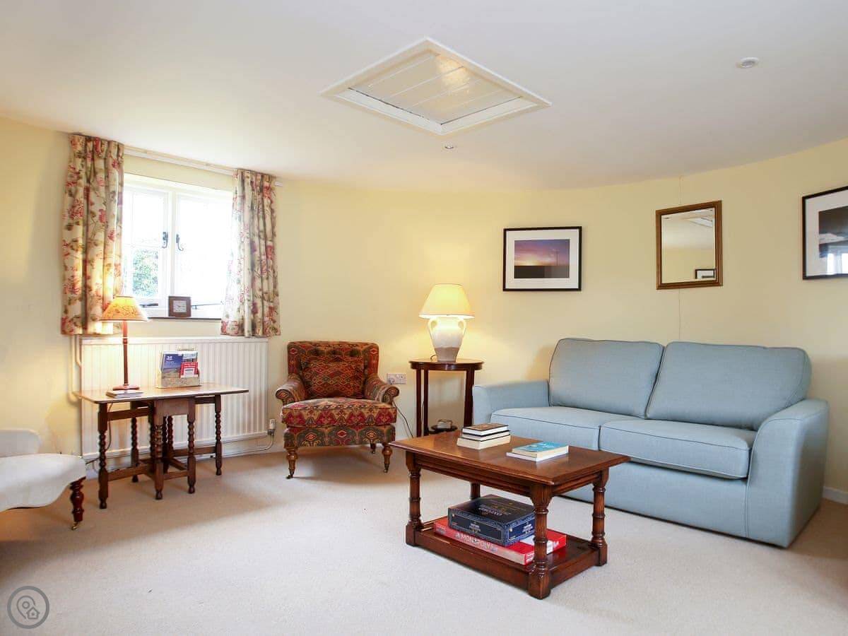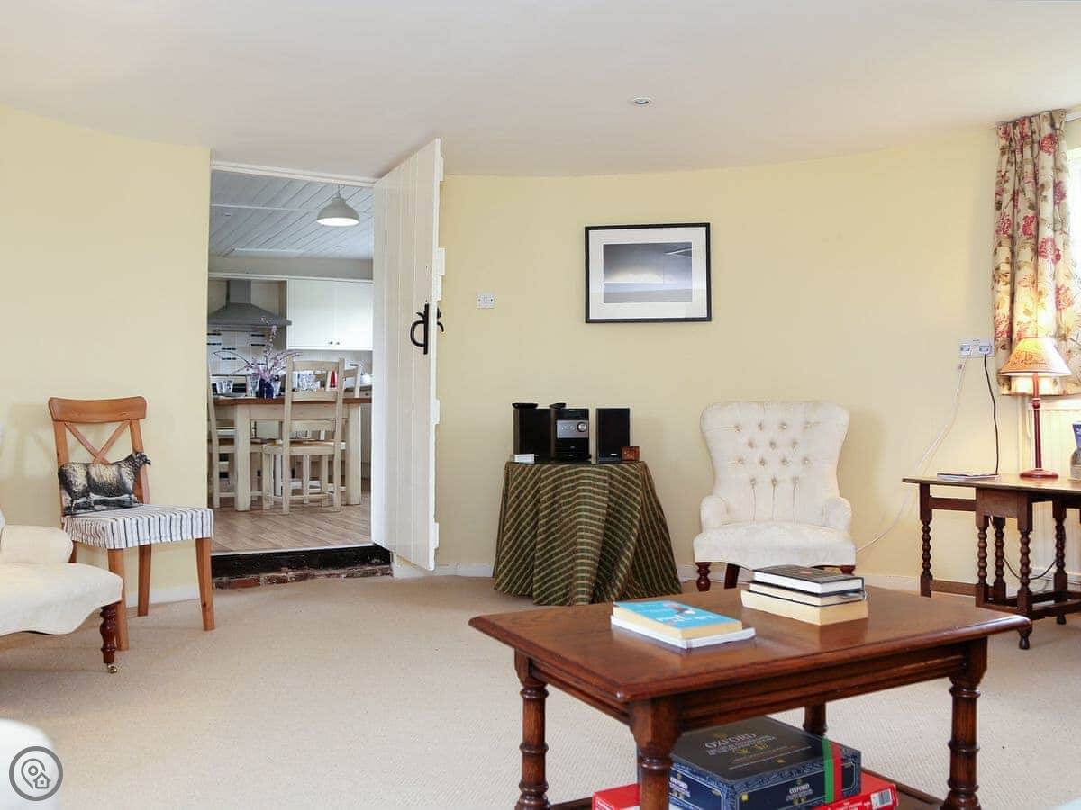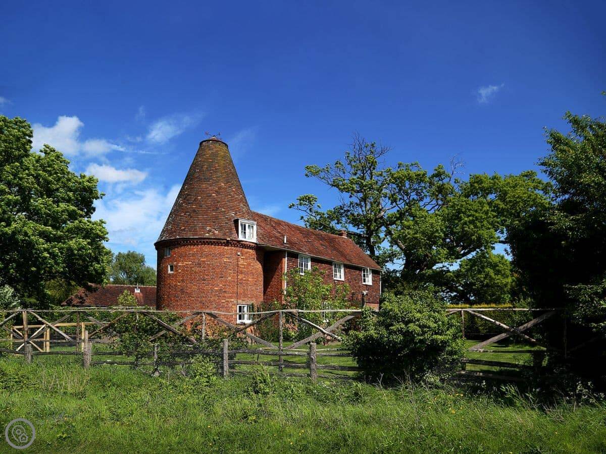This is Leacon Hall Oast. It's attached to our house, but you've got your own space. We live in a white farmhouse from the 1700s, and the Oast is in the grounds. It's a converted oast house, so the main living room and one bedroom are round.