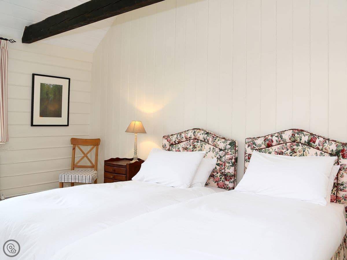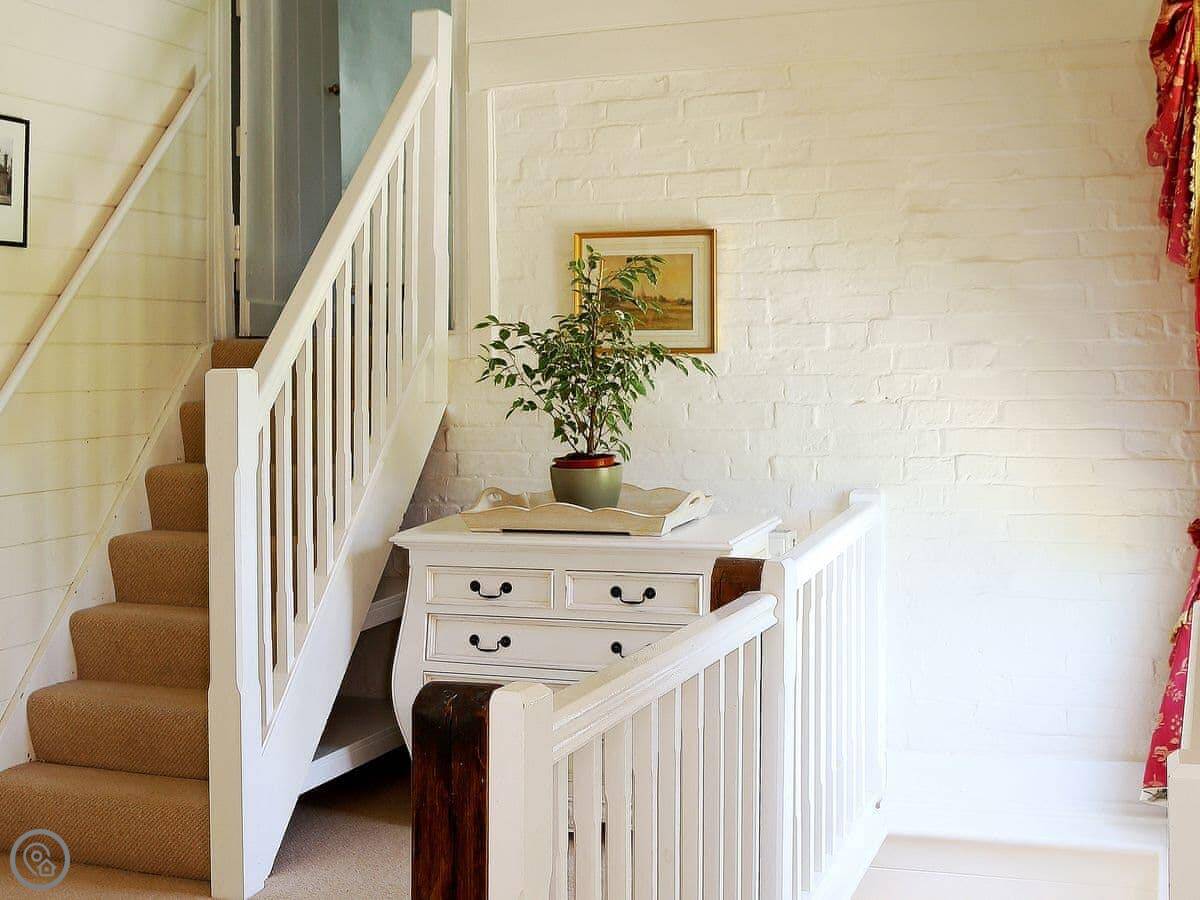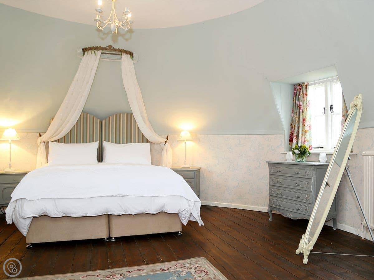 Upstairs, the master bedroom is in the round part of the oast. All the bedrooms look out over the fields. The stairs are a bit steeper than in a modern house, just so you know.