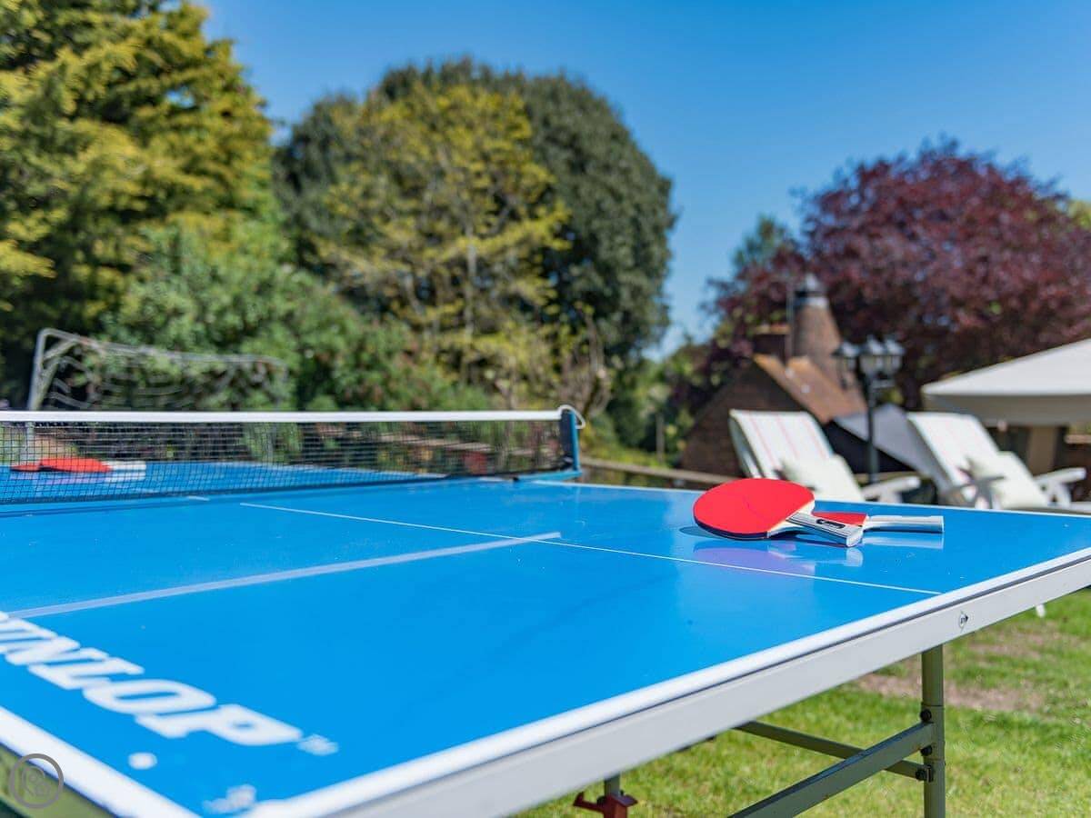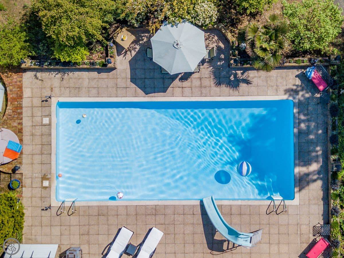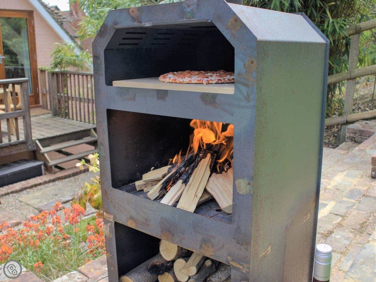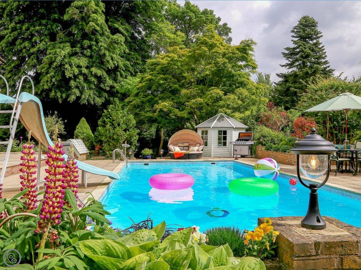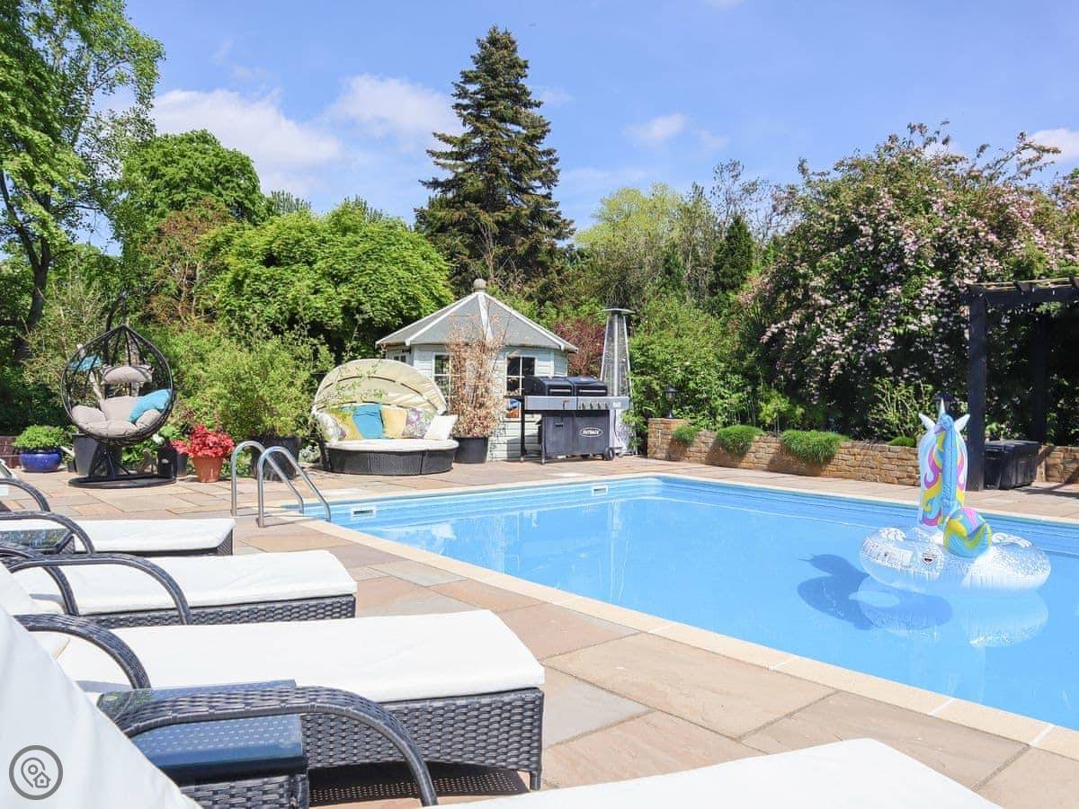 The garden has a heated swimming pool, a hot tub, a table tennis table, and a wood-fired pizza oven. There are two barbecues, one gas and one coal. The garden is enclosed.