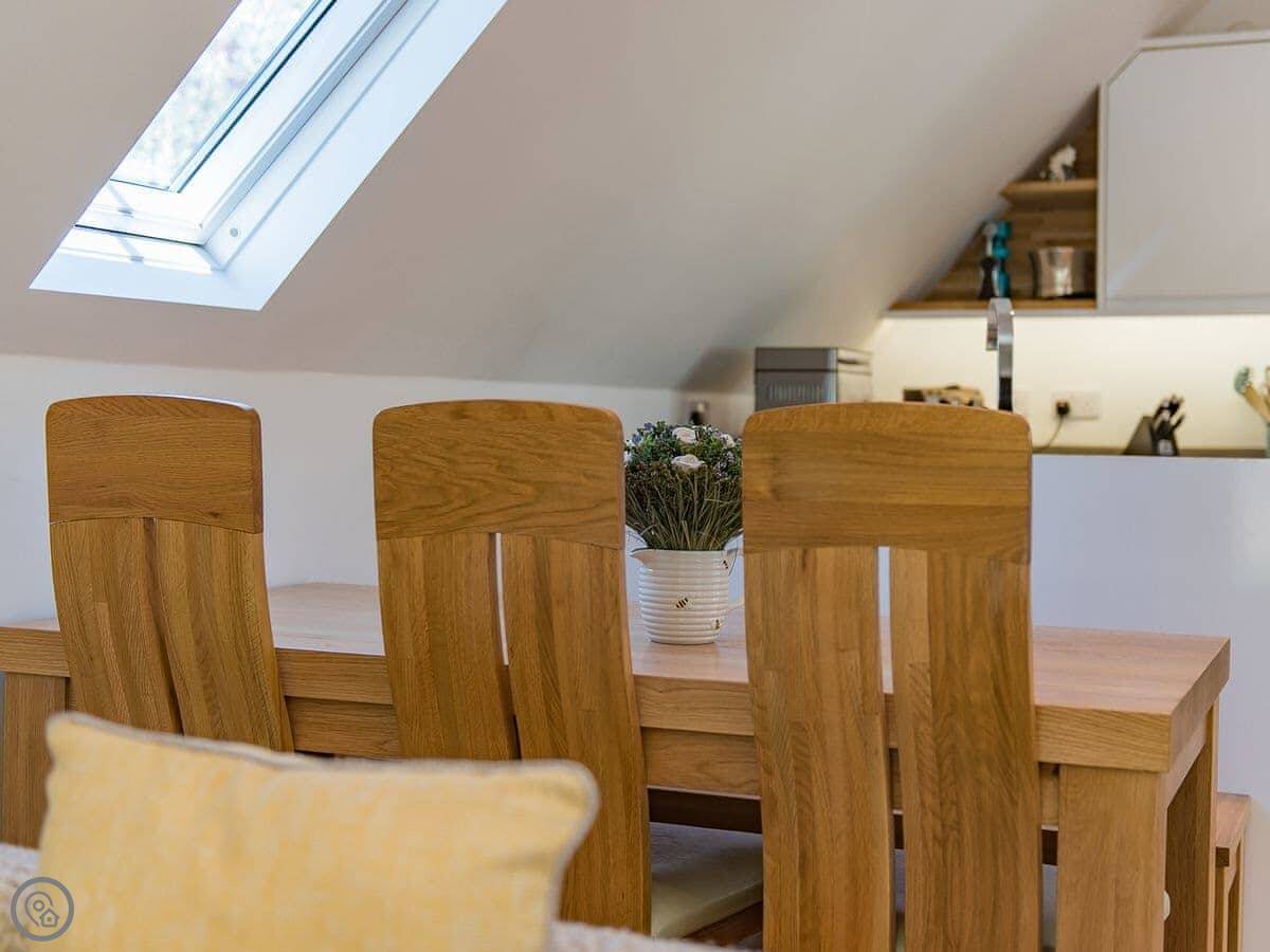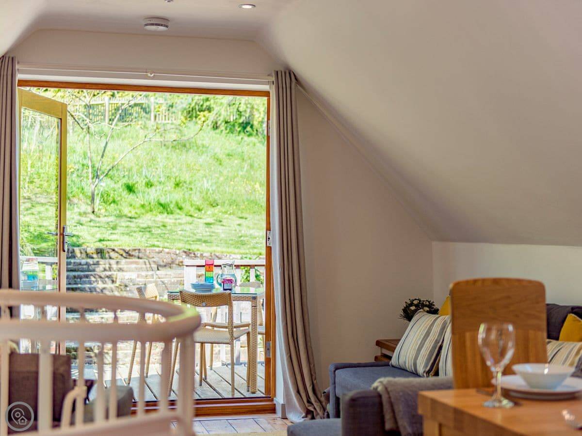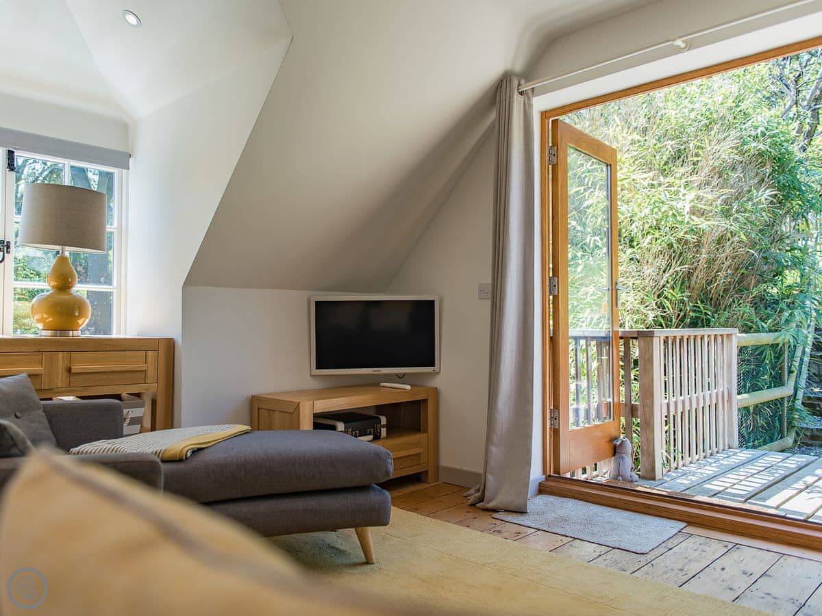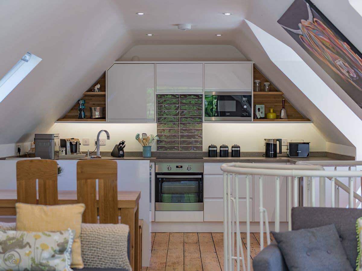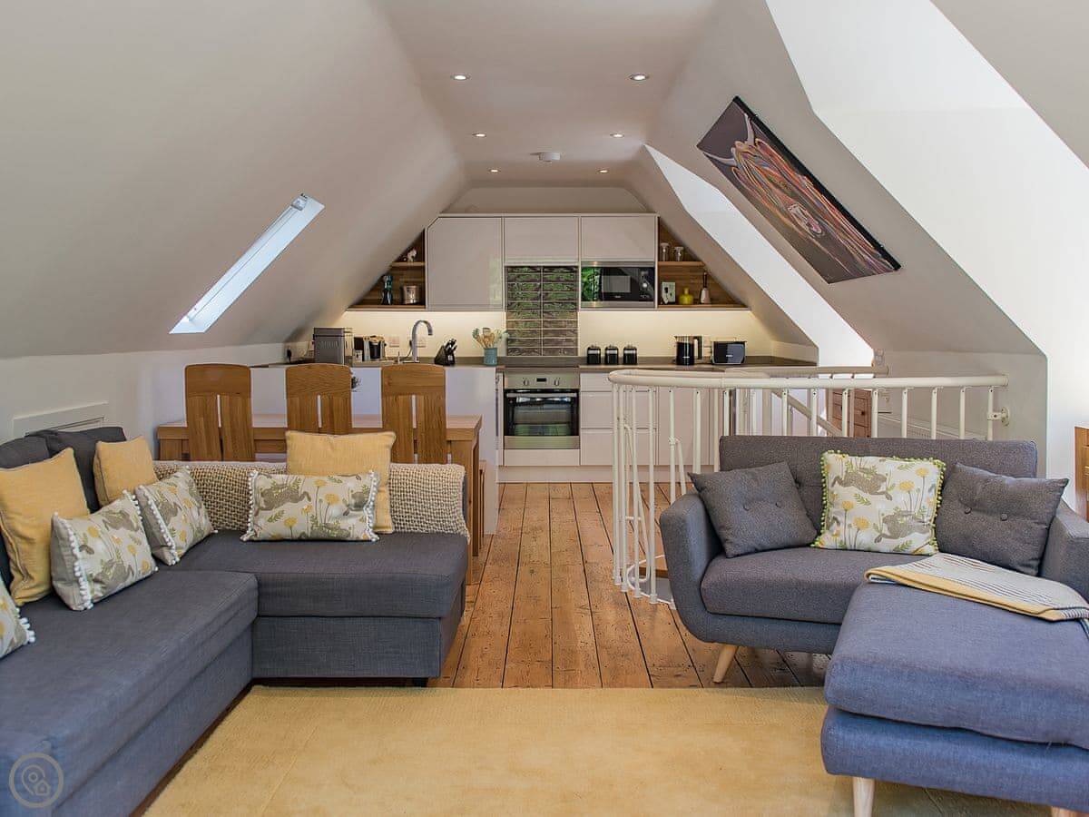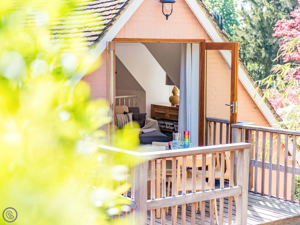 It sleeps six but in two bedrooms. Both are king size beds with their own en-suite bathrooms. There's also a sofa bed upstairs. The living space is on the first floor, so you go up a spiral staircase to get to it. That's where the kitchen, dining area, and sitting room are. It leads out onto a balcony overlooking the garden.
