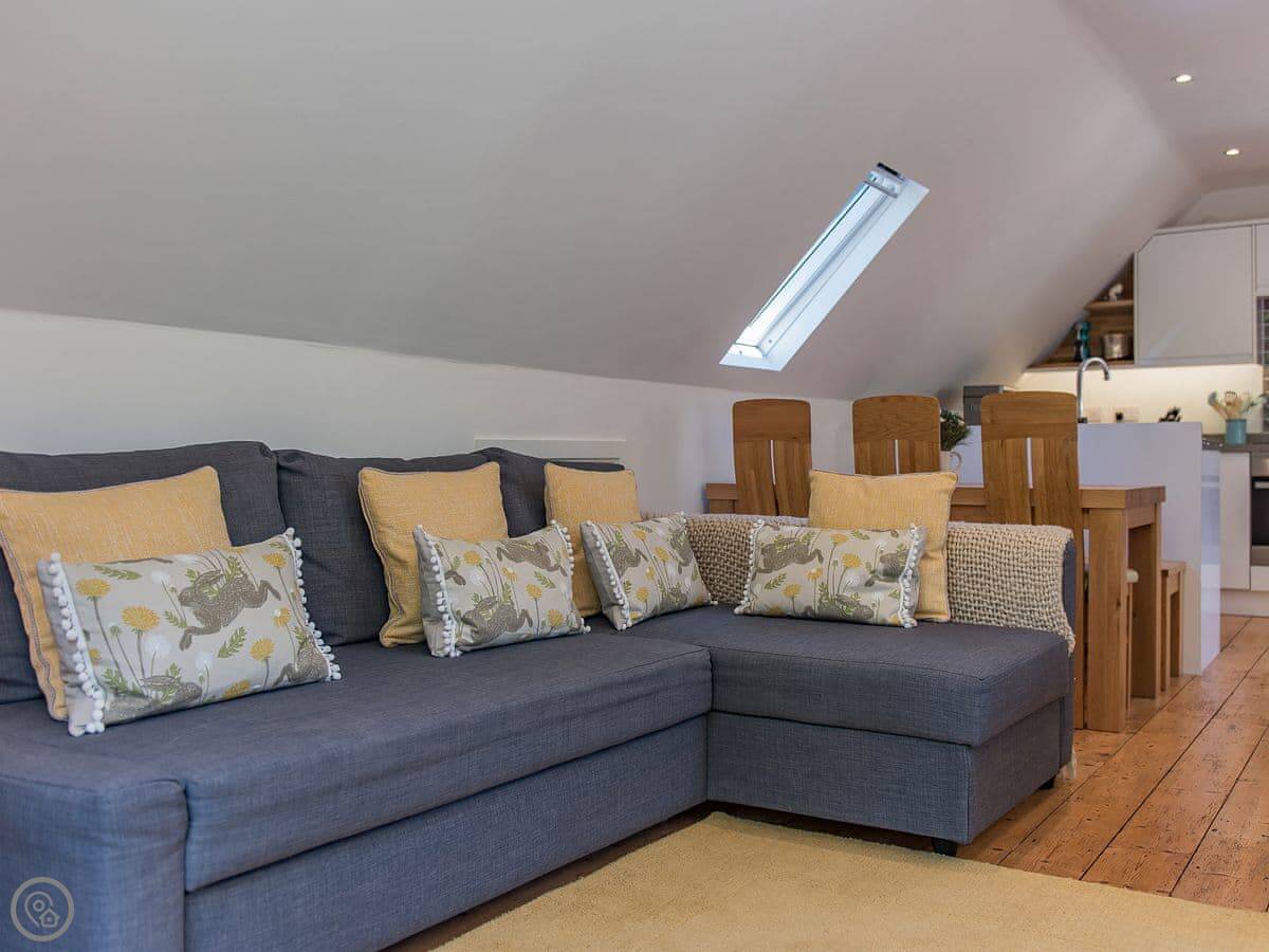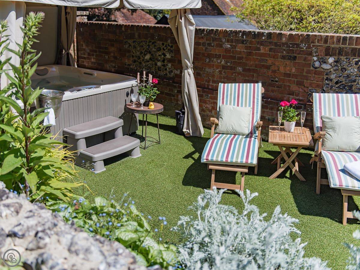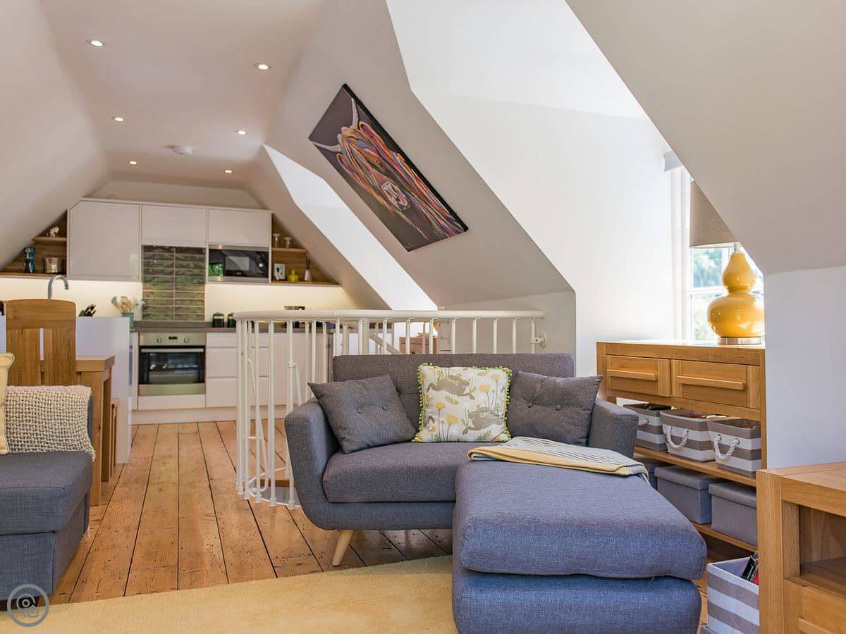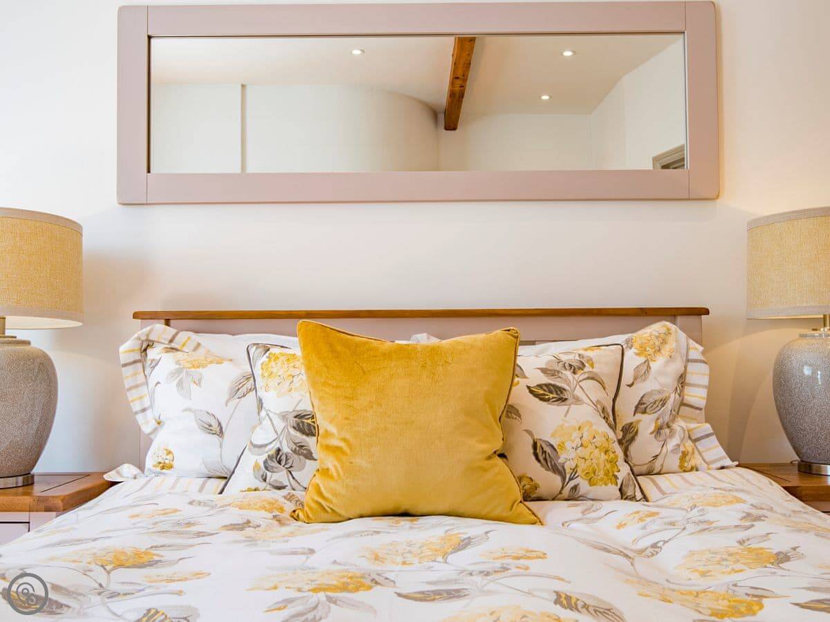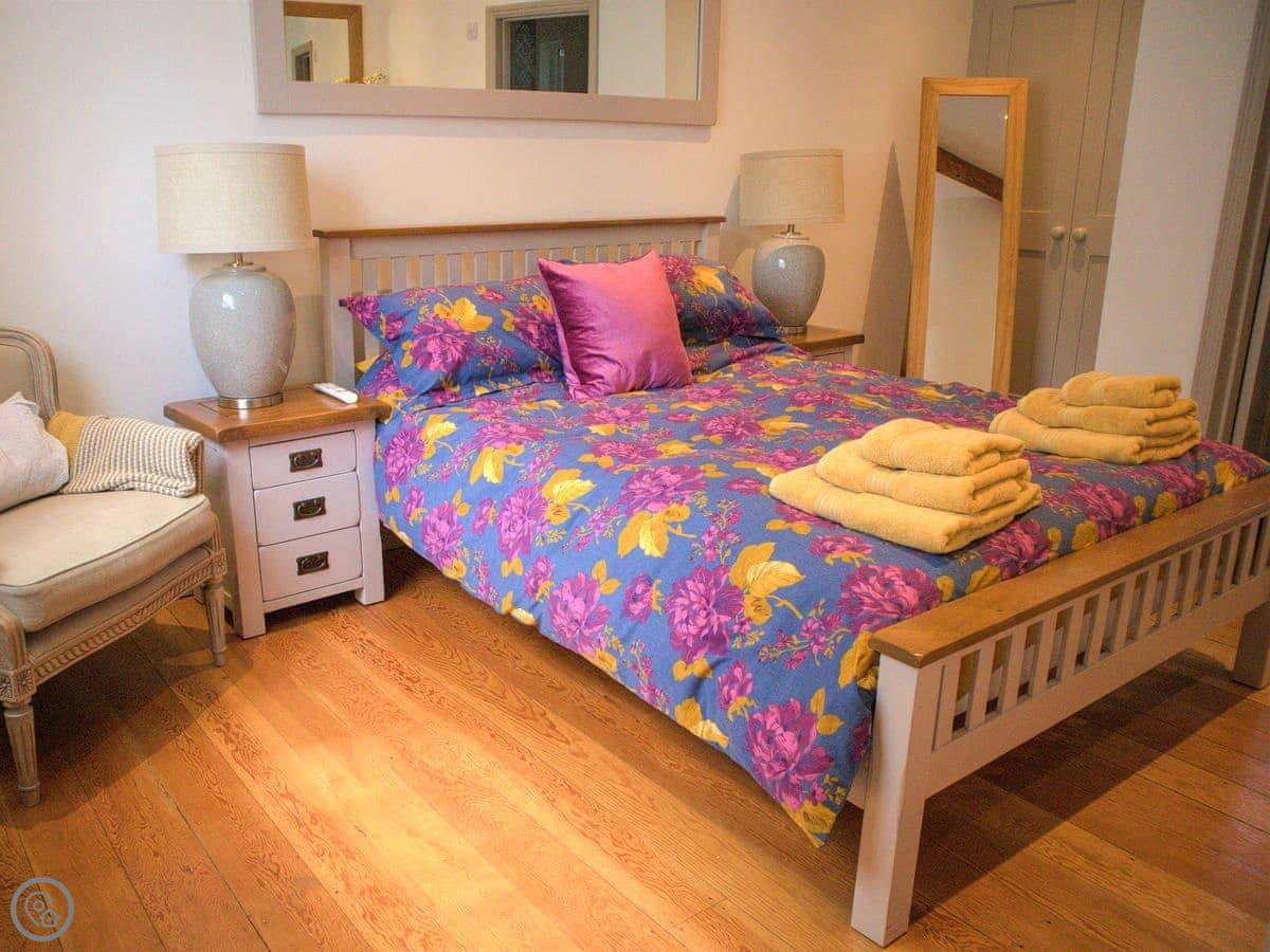It sleeps six but in two bedrooms. Both are king size beds with their own en-suite bathrooms. There's also a sofa bed upstairs. The living space is on the first floor, so you go up a spiral staircase to get to it. That's where the kitchen, dining area, and sitting room are. It leads out onto a balcony overlooking the garden.