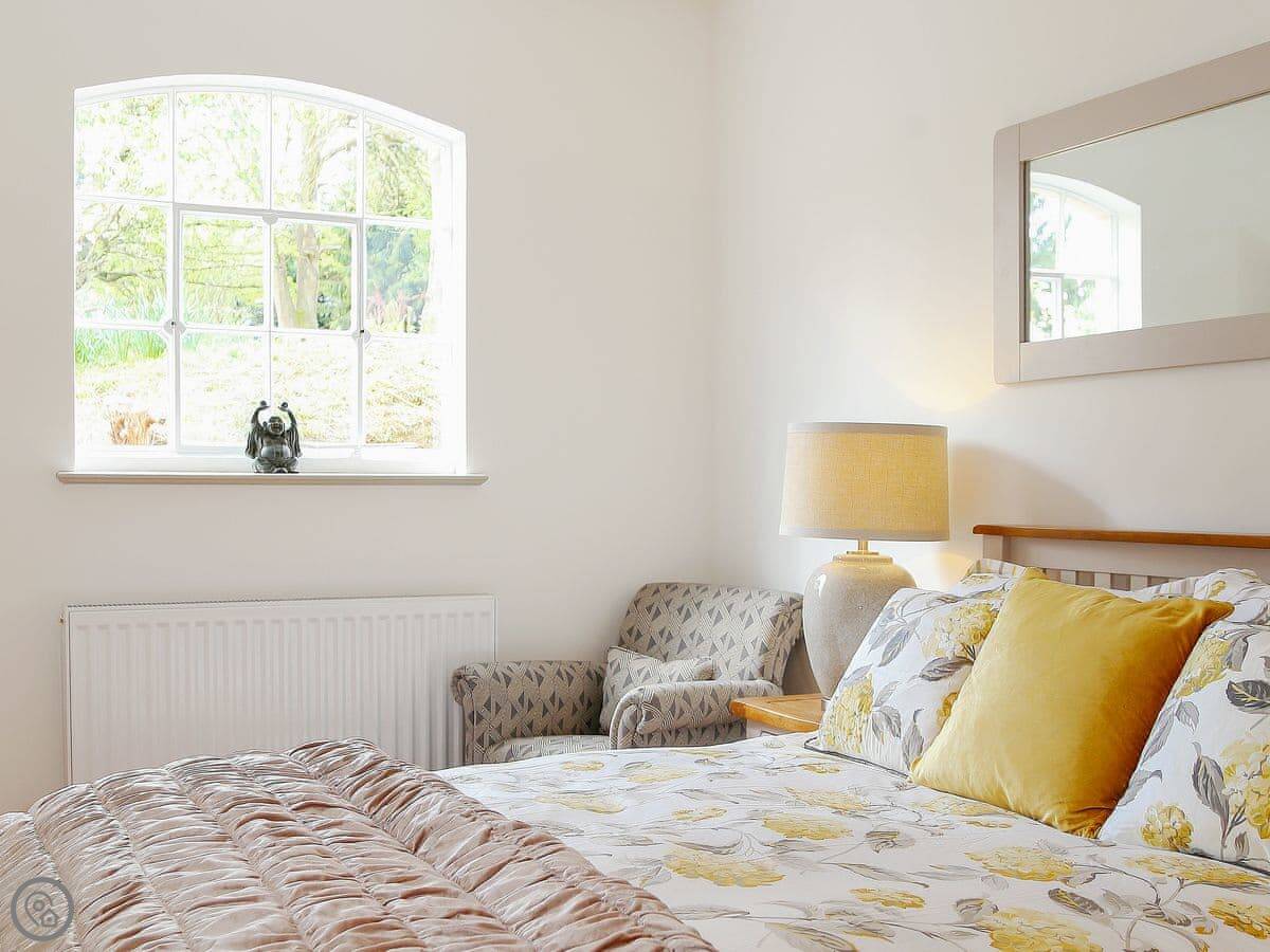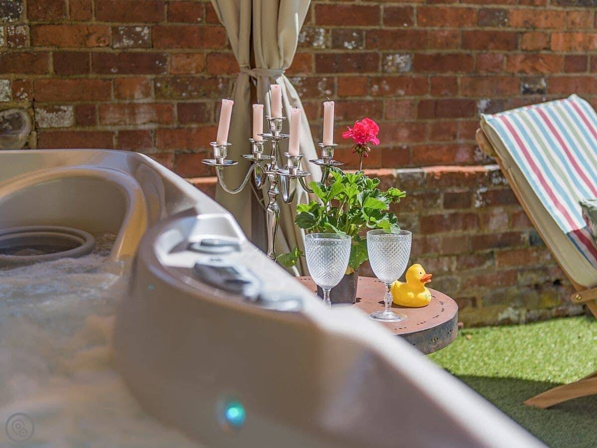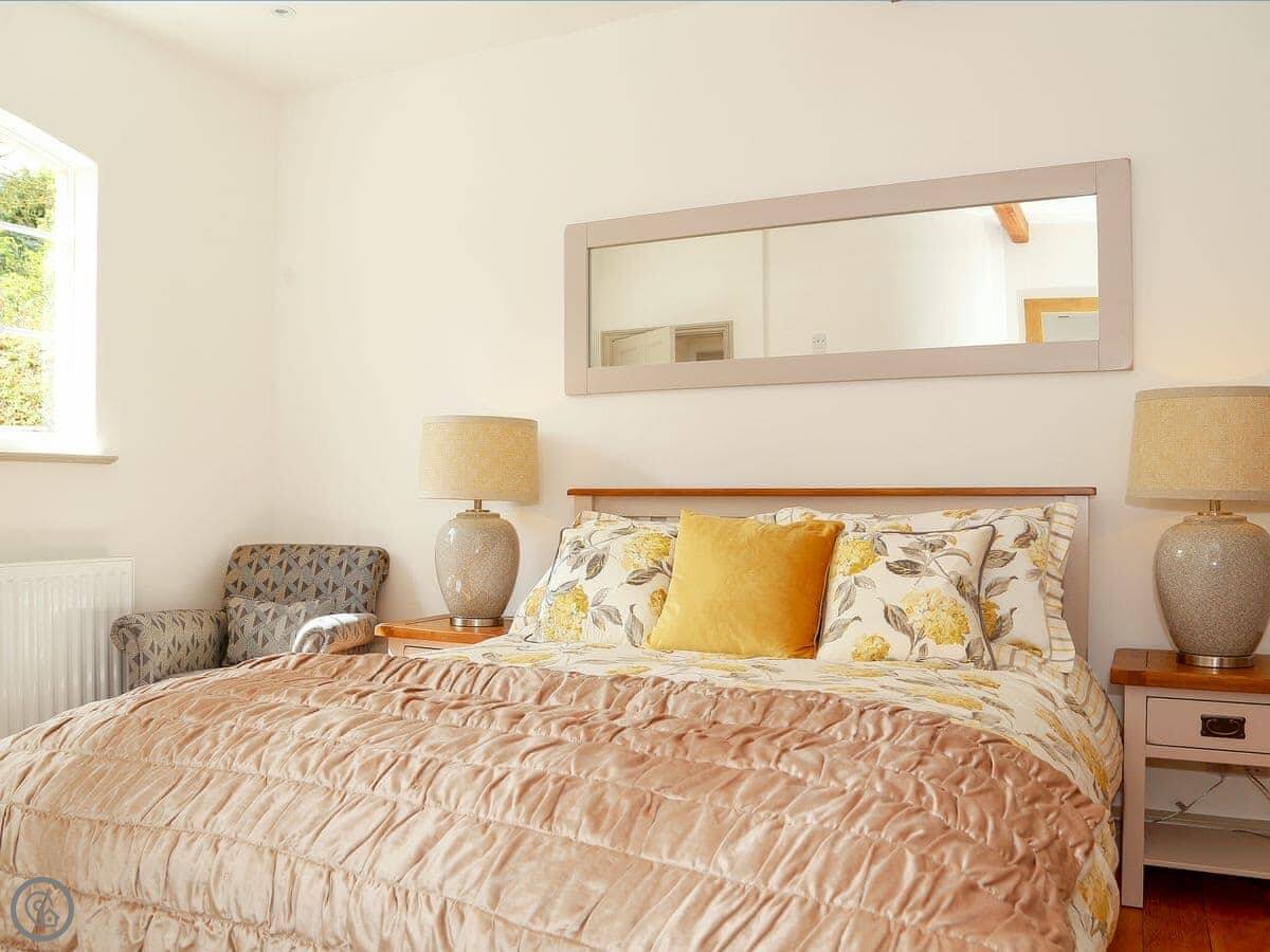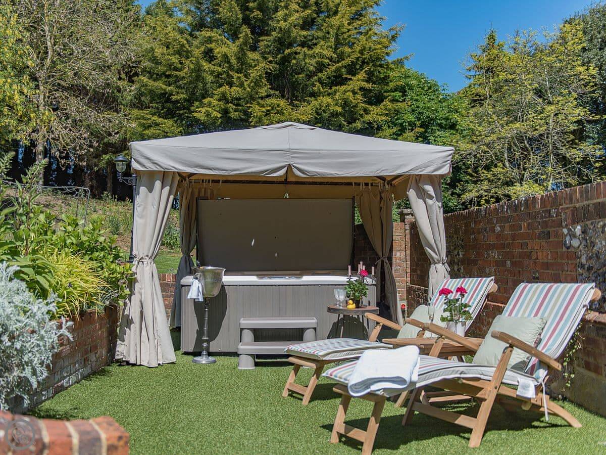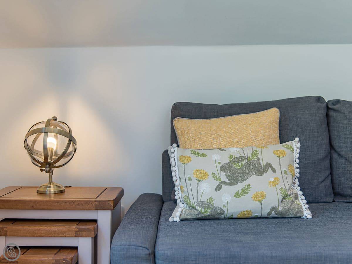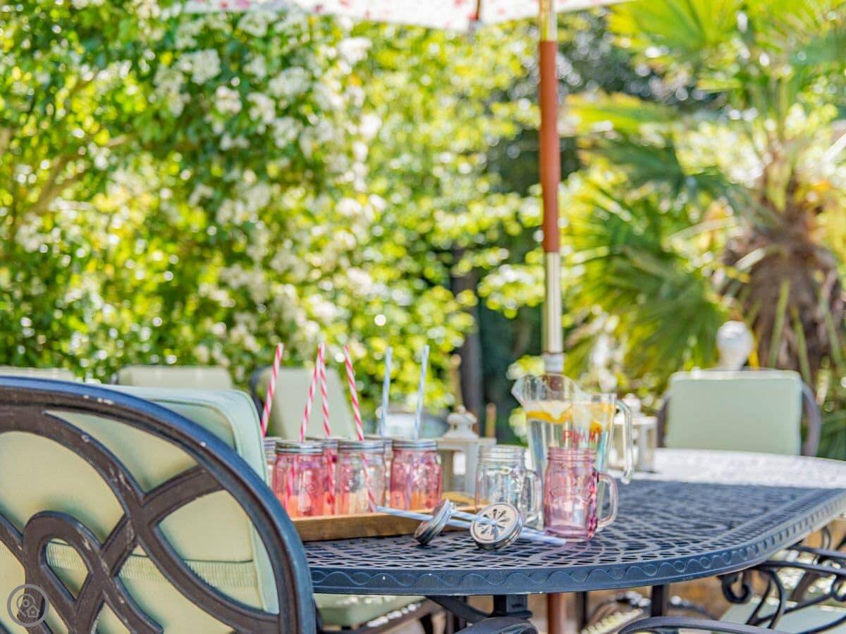 It sleeps six but in two bedrooms. Both are king size beds with their own en-suite bathrooms. There's also a sofa bed upstairs. The living space is on the first floor, so you go up a spiral staircase to get to it. That's where the kitchen, dining area, and sitting room are. It leads out onto a balcony overlooking the garden.