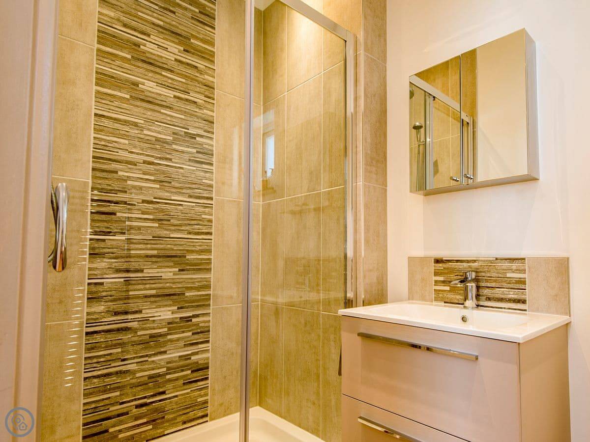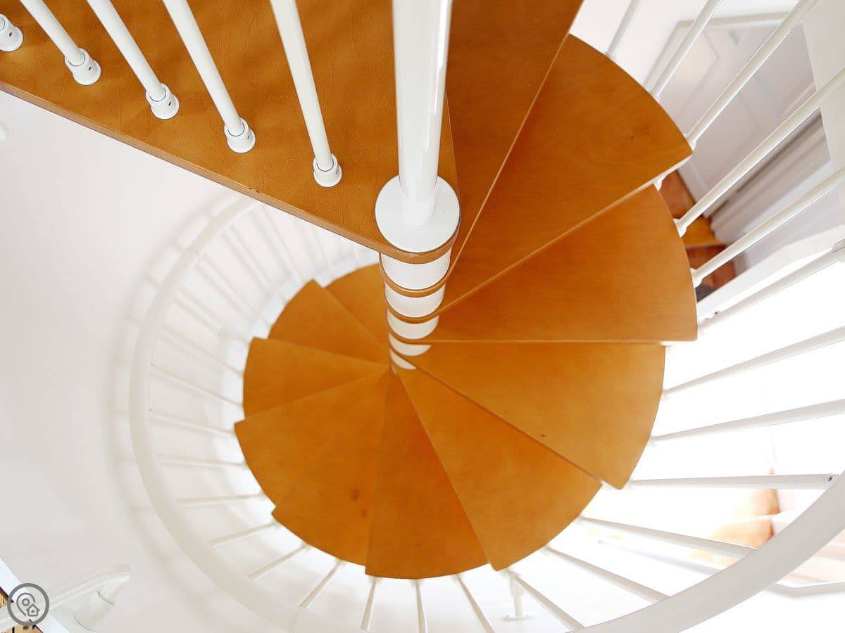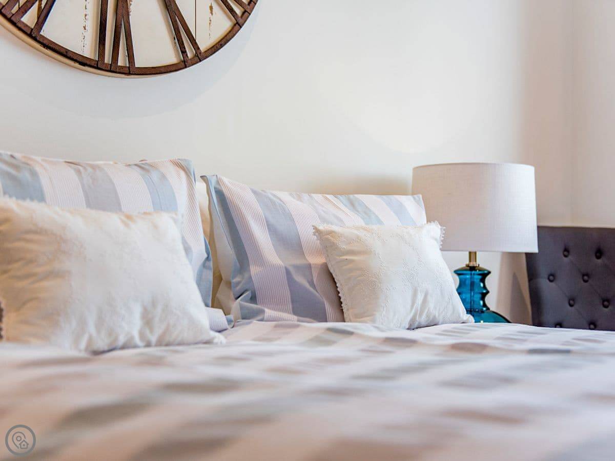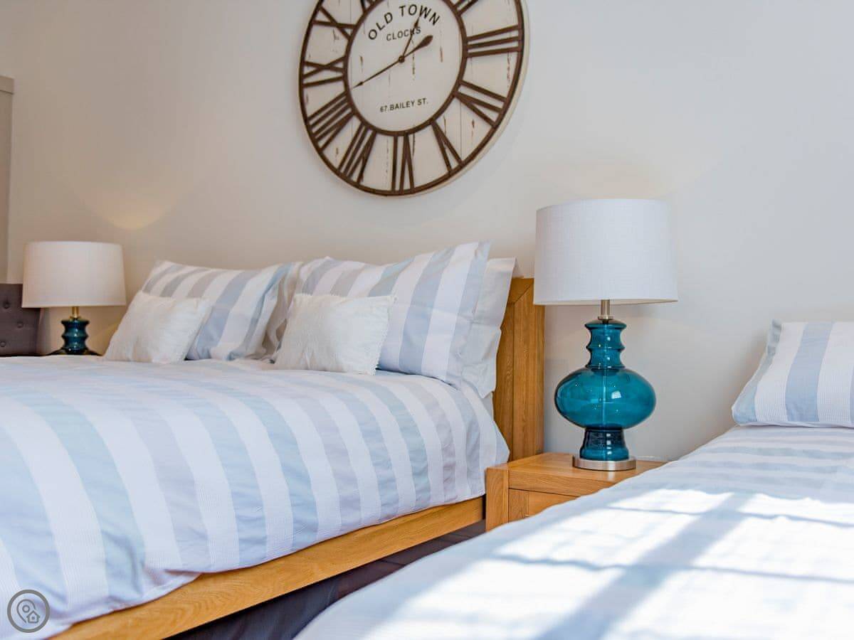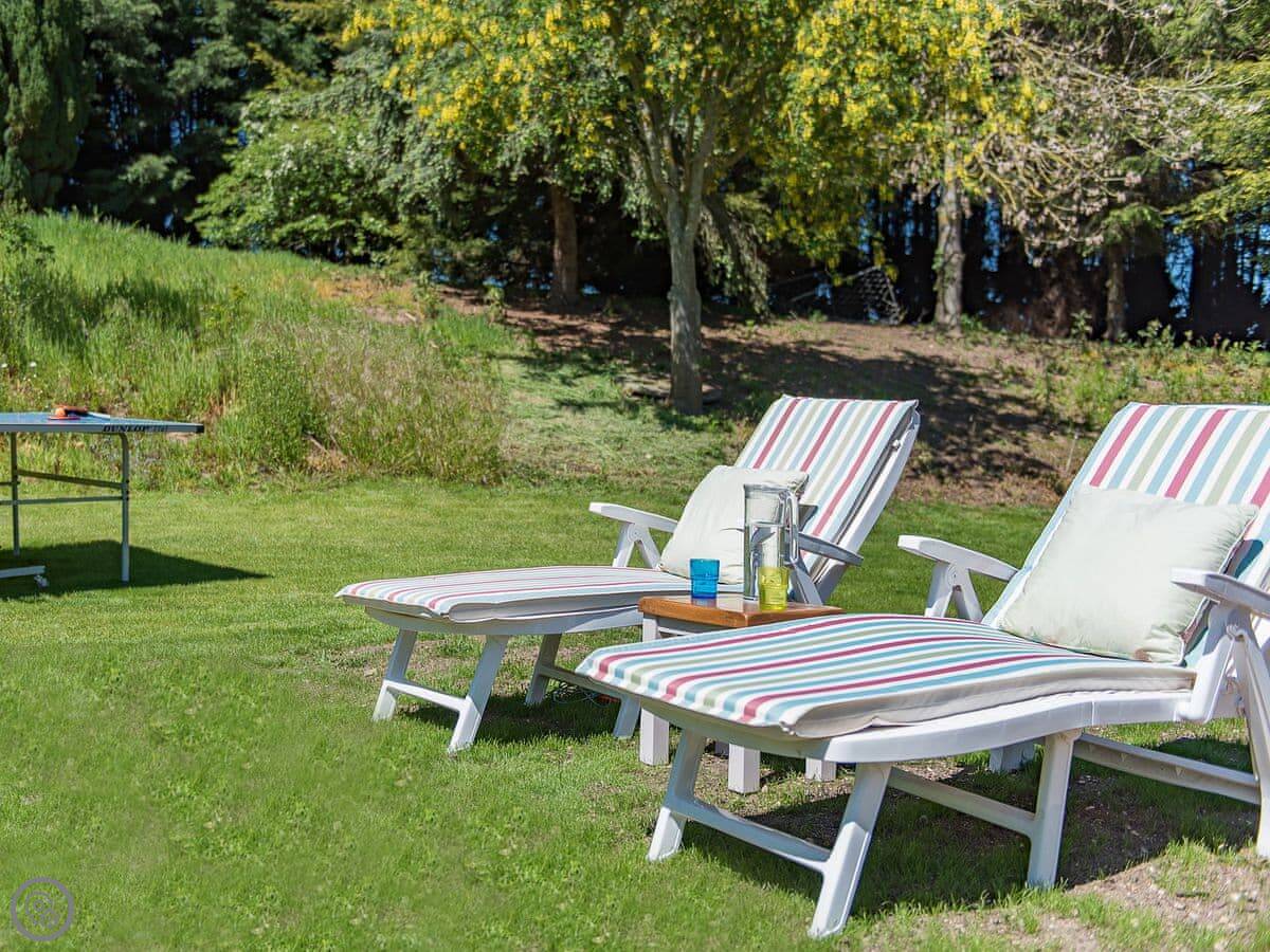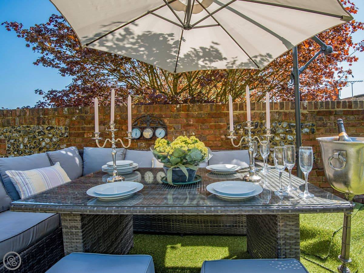 It sleeps six but in two bedrooms. Both are king size beds with their own en-suite bathrooms. There's also a sofa bed upstairs. The living space is on the first floor, so you go up a spiral staircase to get to it. That's where the kitchen, dining area, and sitting room are. It leads out onto a balcony overlooking the garden.