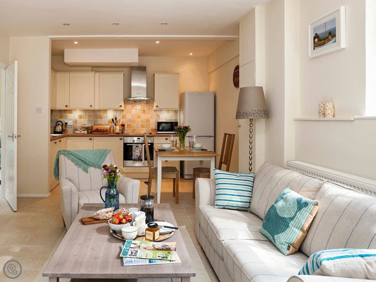 The beach is about five minutes' walk down the lane. It's a pebble beach in a bay, so it's quite sheltered. Good for rock pools when the tide's out. The Coastguard pub is right there on the beach.