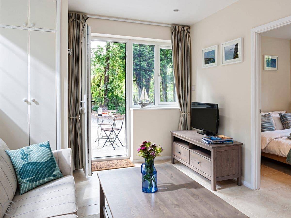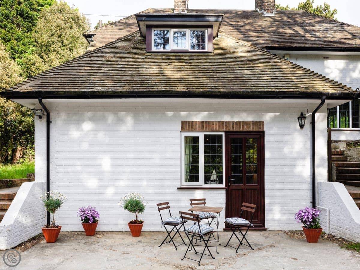 The living area is open plan and gets a good amount of light. Outside, there's a small courtyard at the front. It's quiet there, you can hear the birds. It looks over the Pines Garden across the lane.