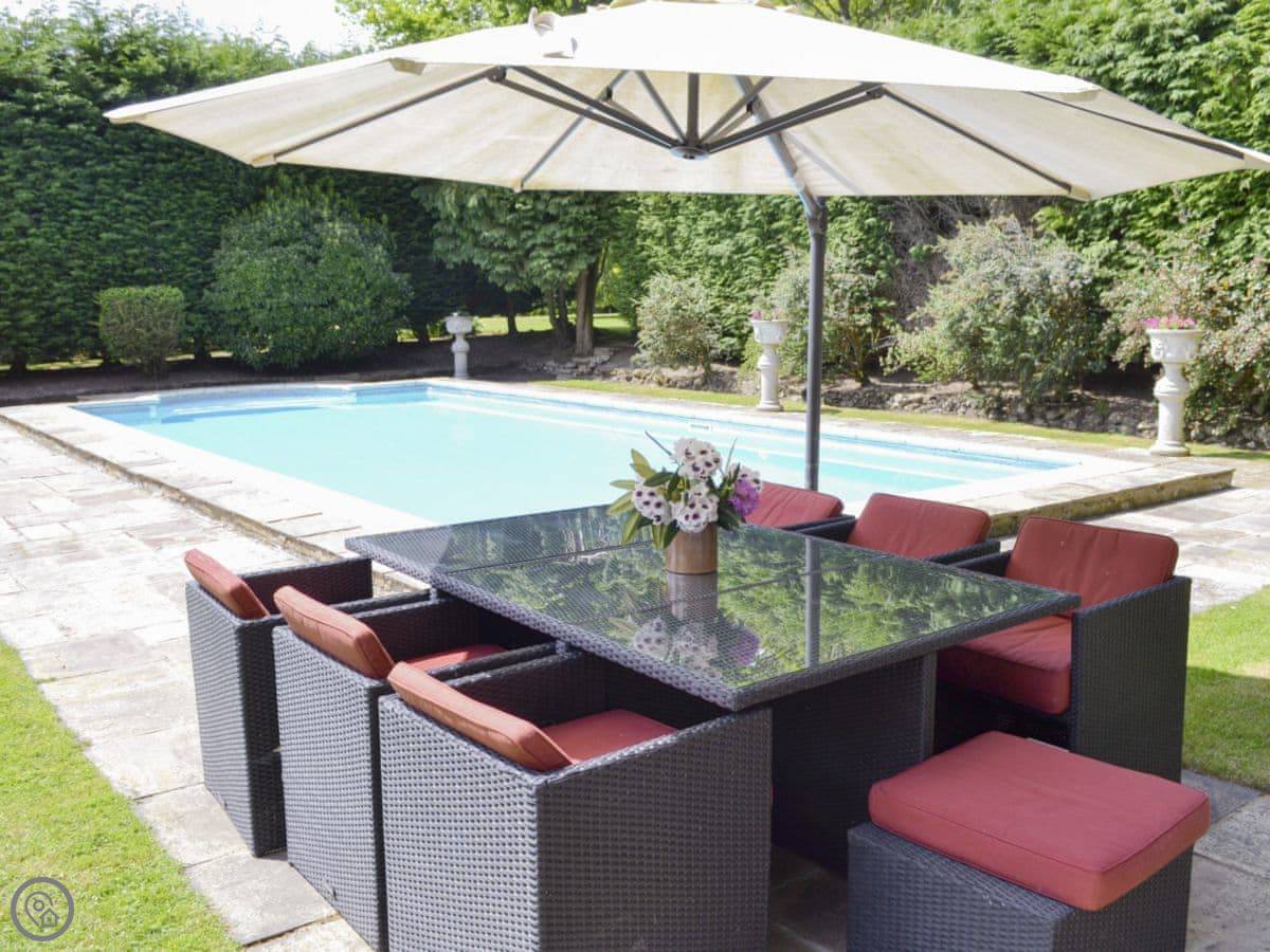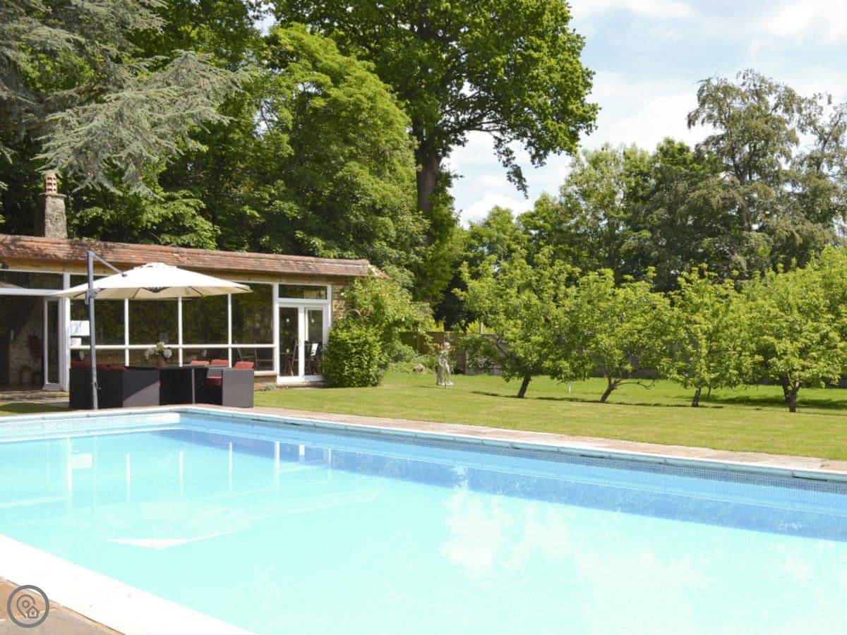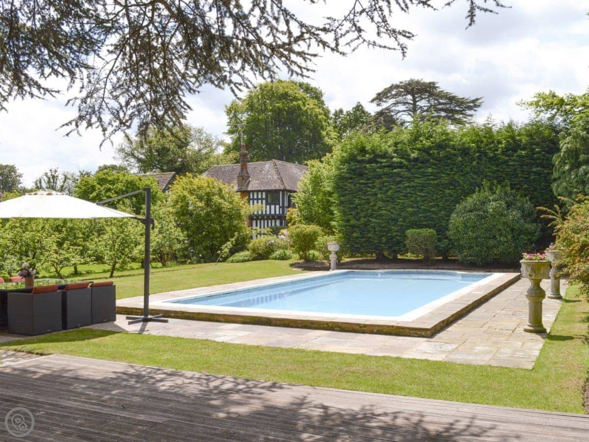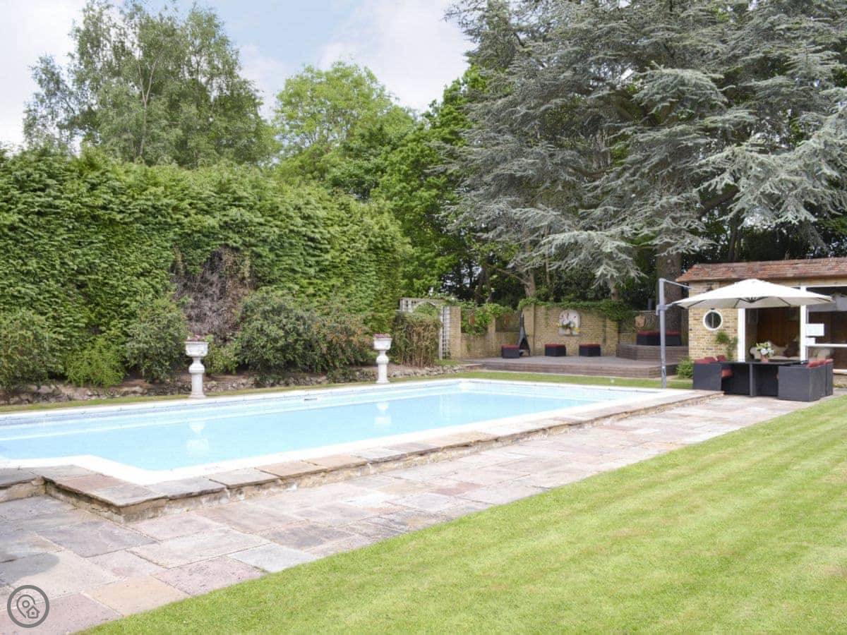 The house sits in about four acres of land. The gardens are big and open, with views across fields. There’s a patio and a barbecue area. The swimming pool is outdoors, so it’s only usable in the warmer months. There's also a separate summerhouse that we use as a games room.