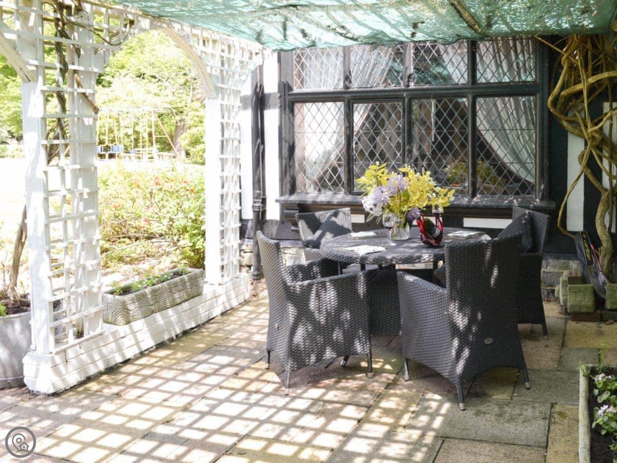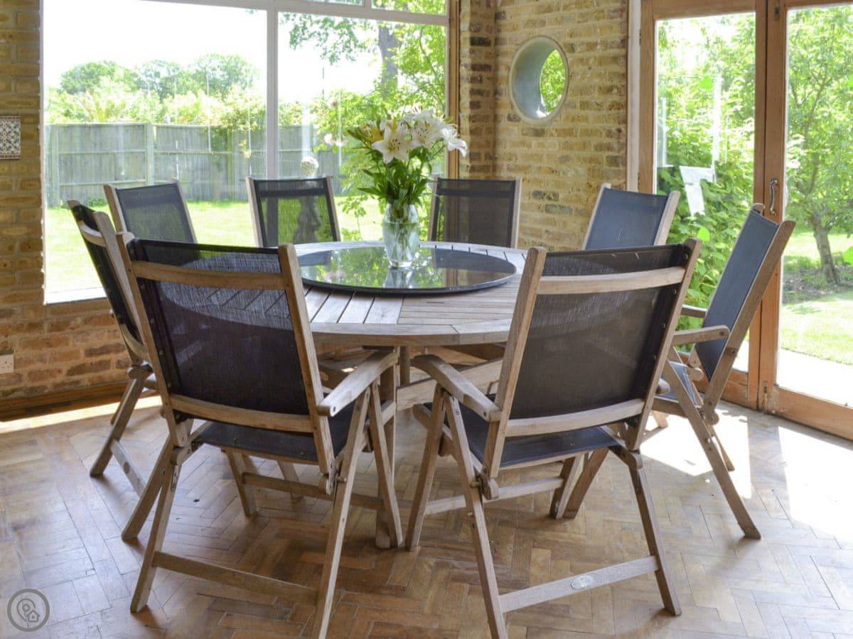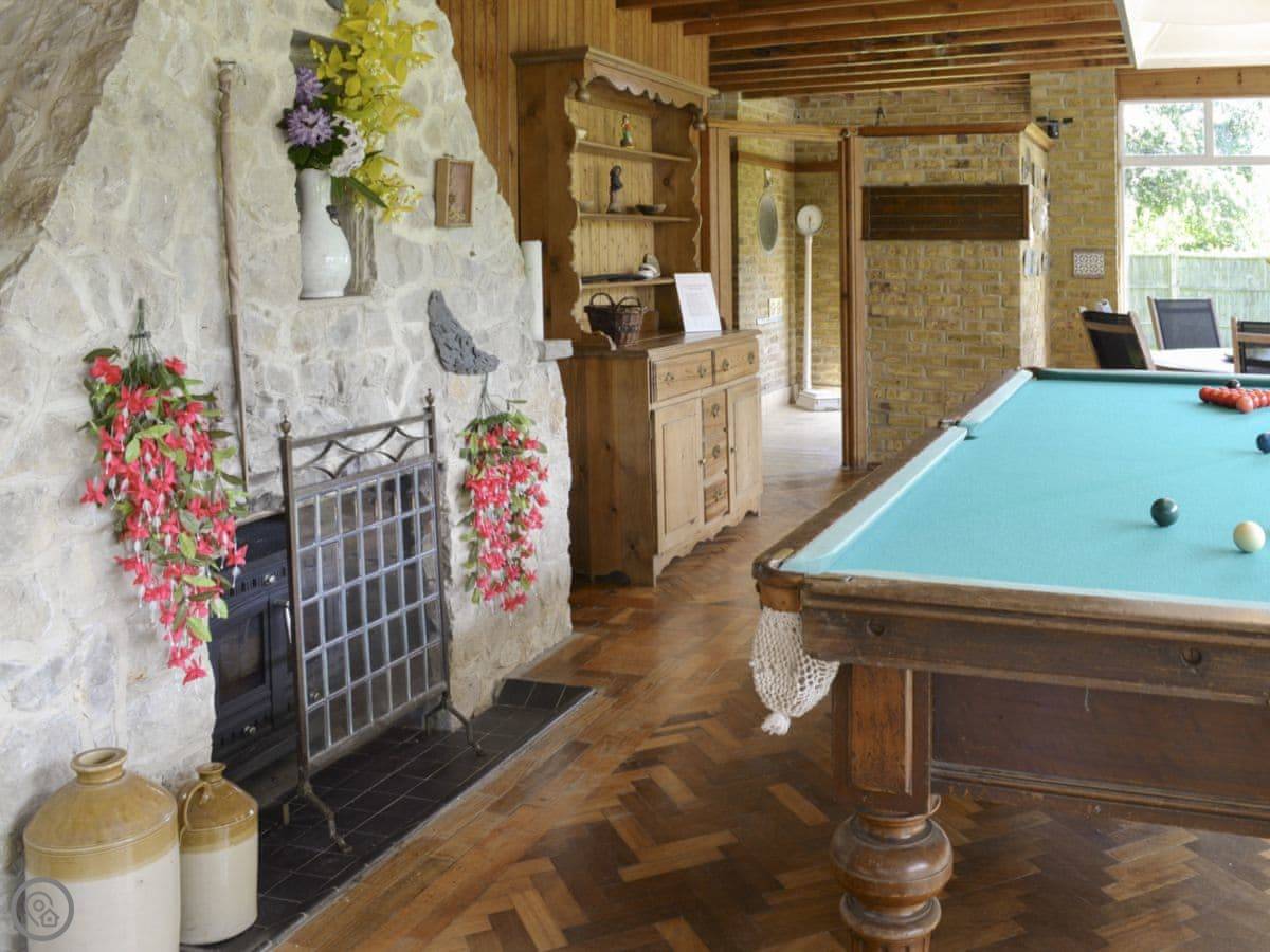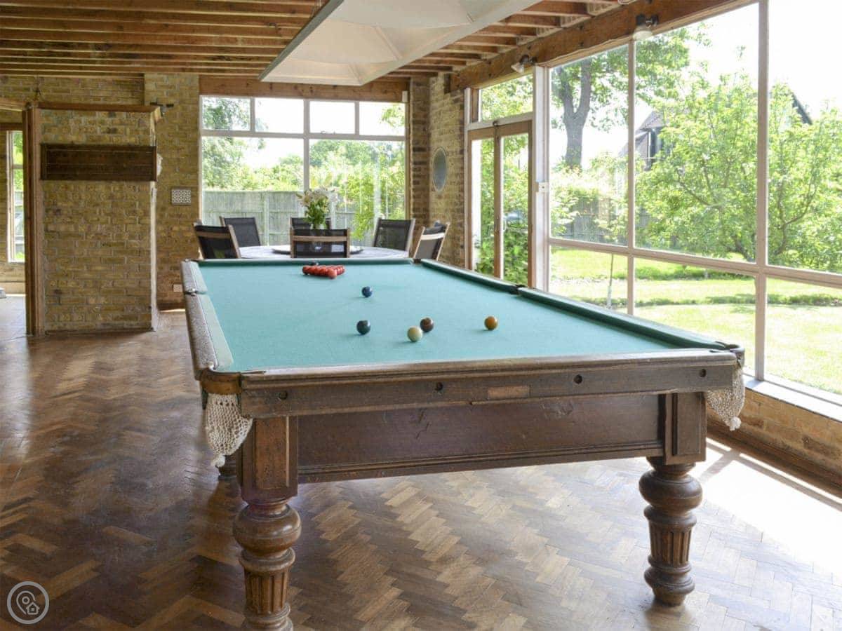 The house sits in about four acres of land. The gardens are big and open, with views across fields. There’s a patio and a barbecue area. The swimming pool is outdoors, so it’s only usable in the warmer months. There's also a separate summerhouse that we use as a games room.