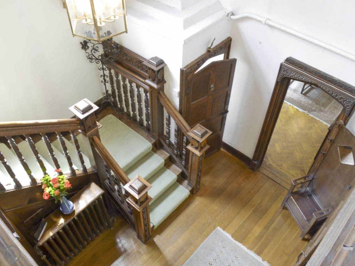 Inside, there’s an open fireplace. The stairs are the original oak ones, so they’re a bit curved and the treads aren't always even. The floors are wood in some rooms.