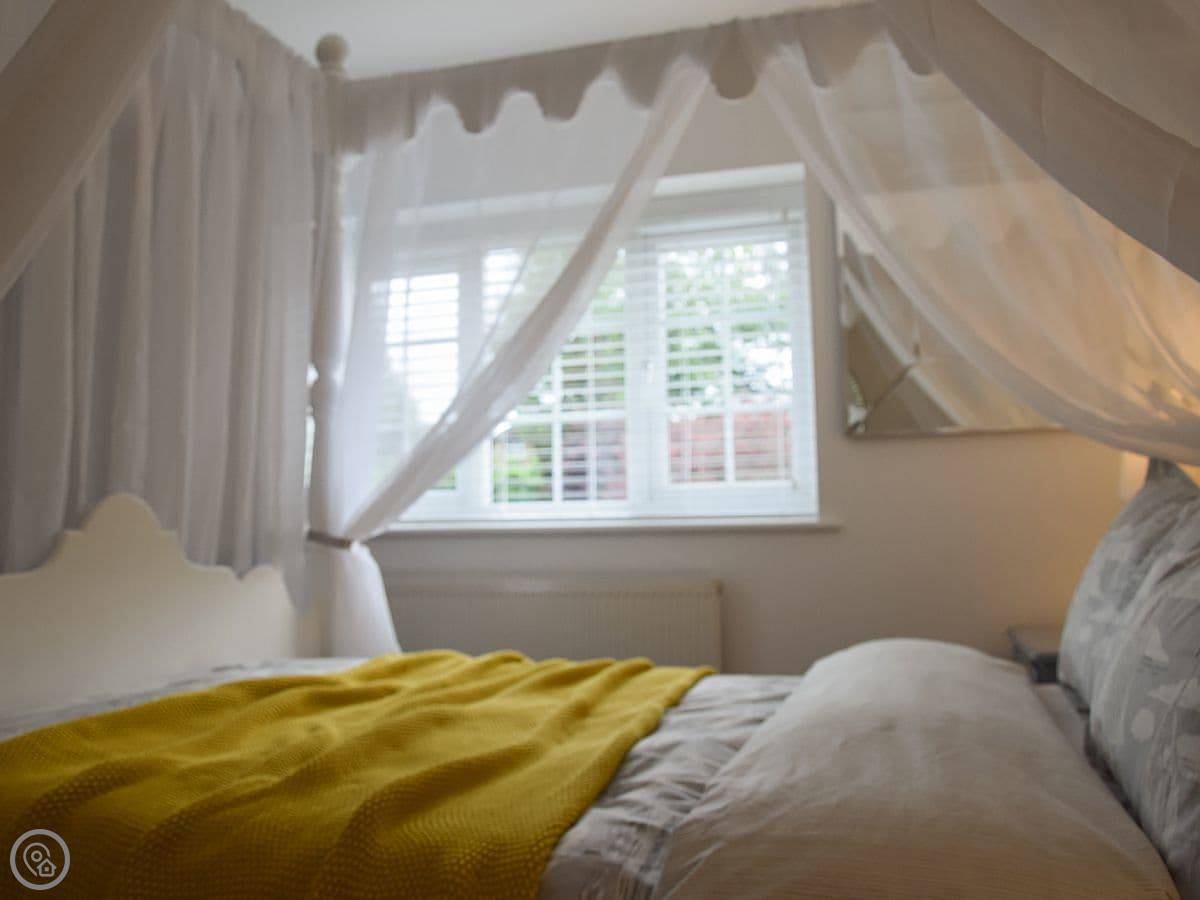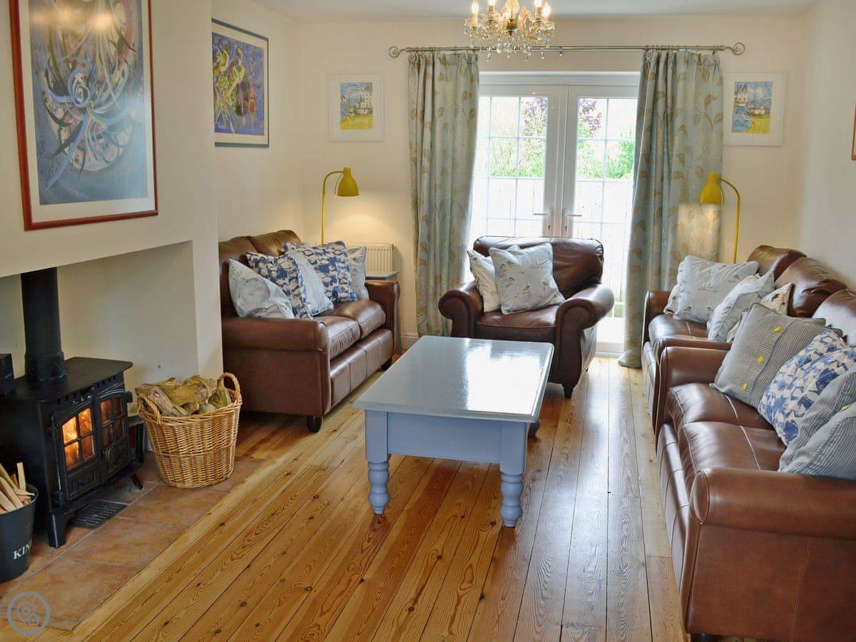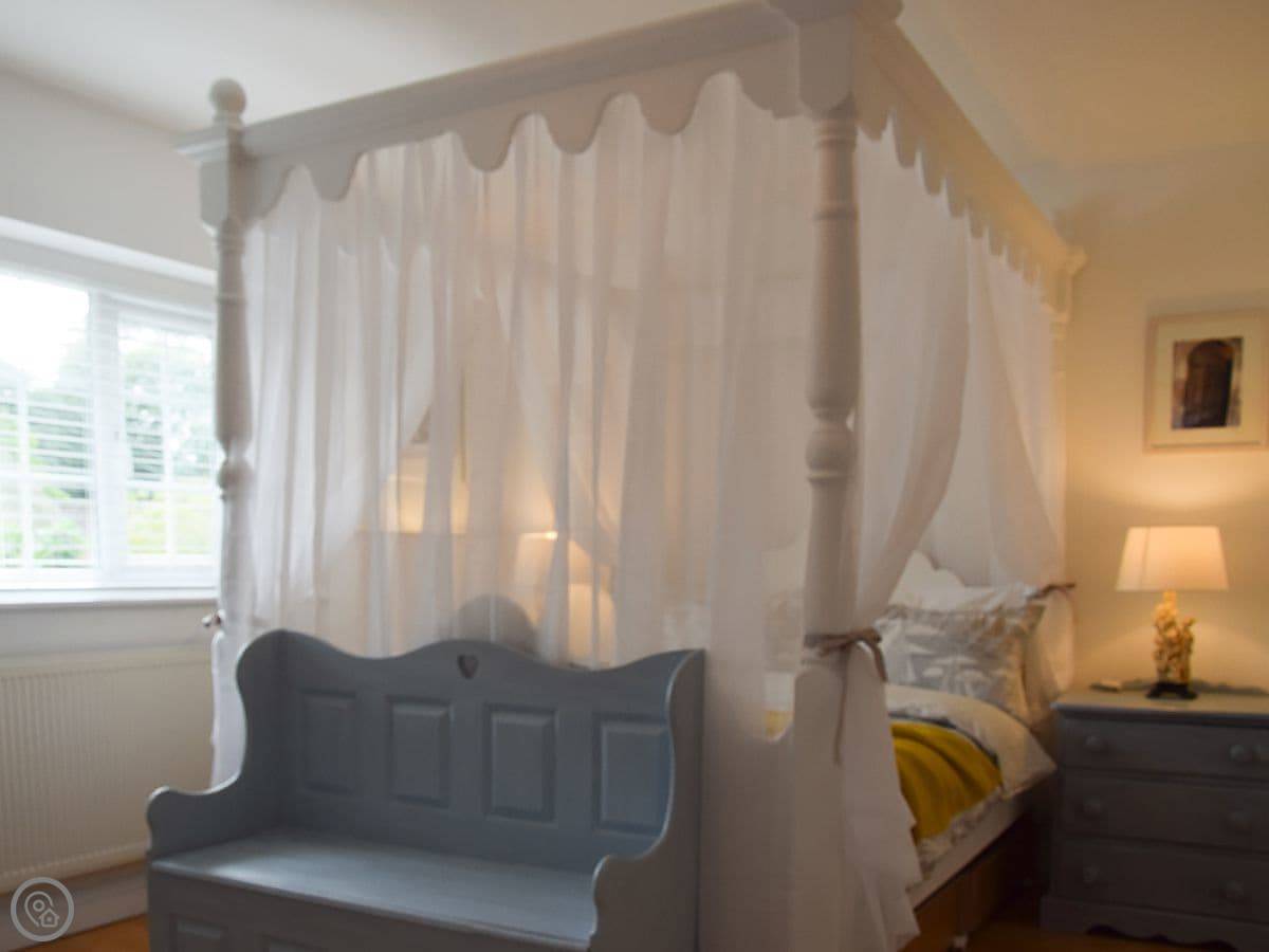 The kitchen has two dishwashers and a big old farmhouse table. There's a wood burner in the sitting room and the sofas are leather. The main bedroom has a four-poster bed.