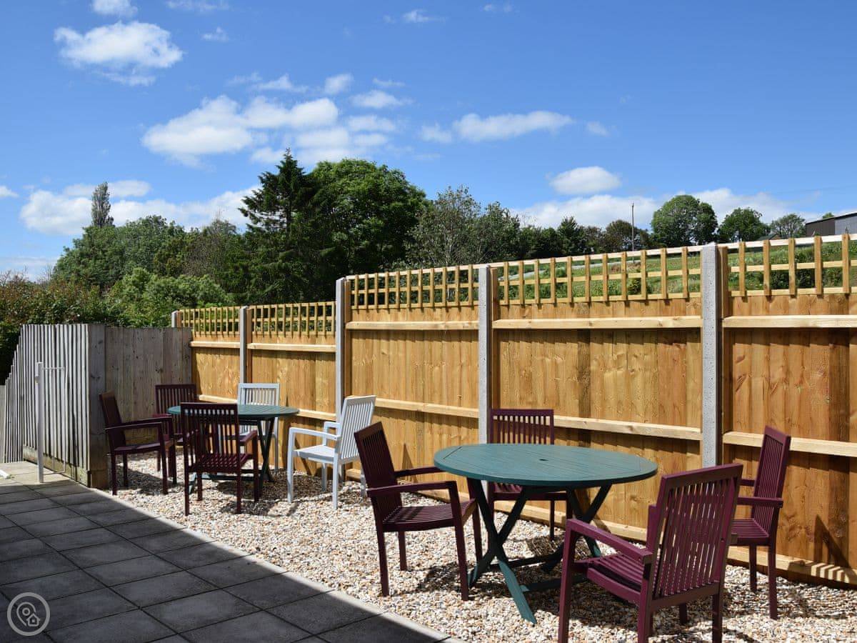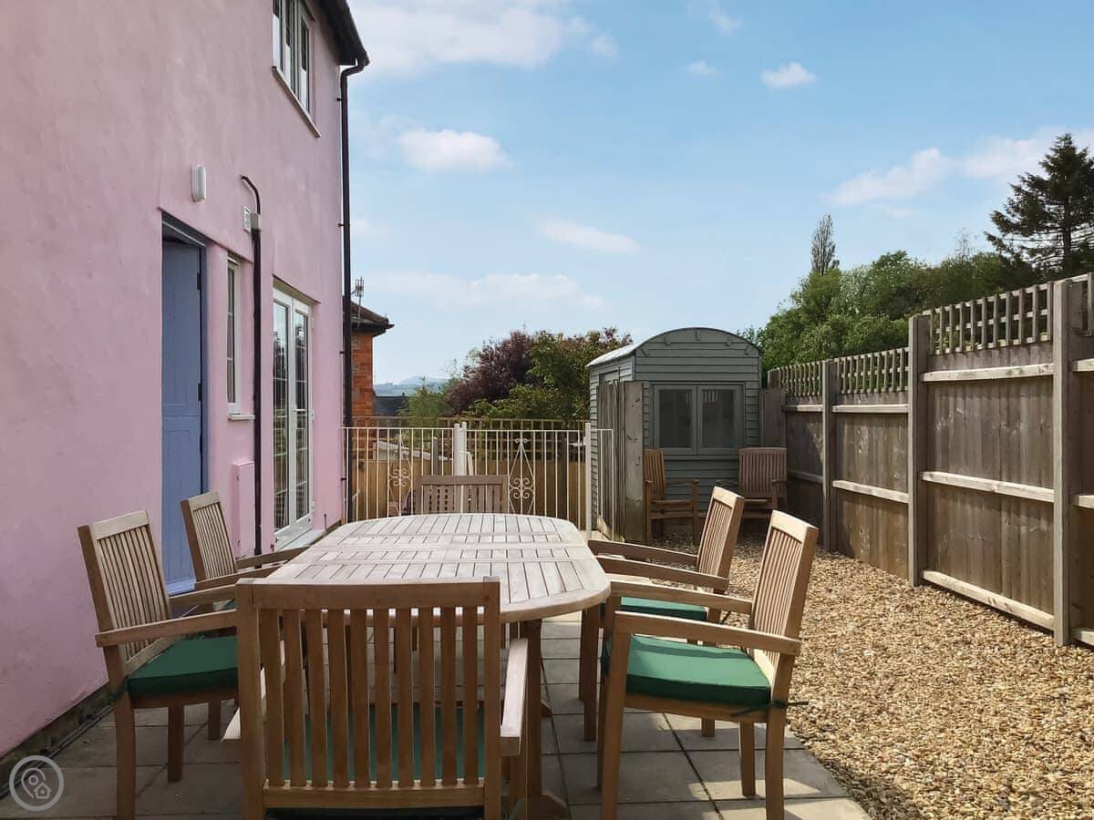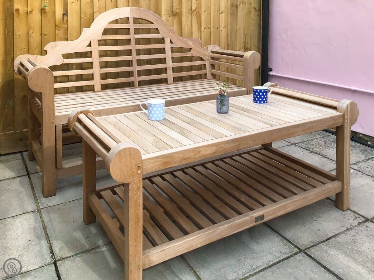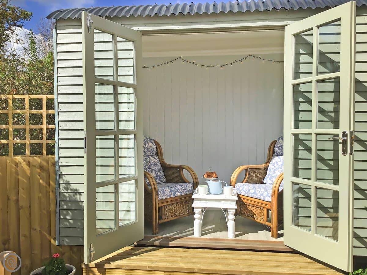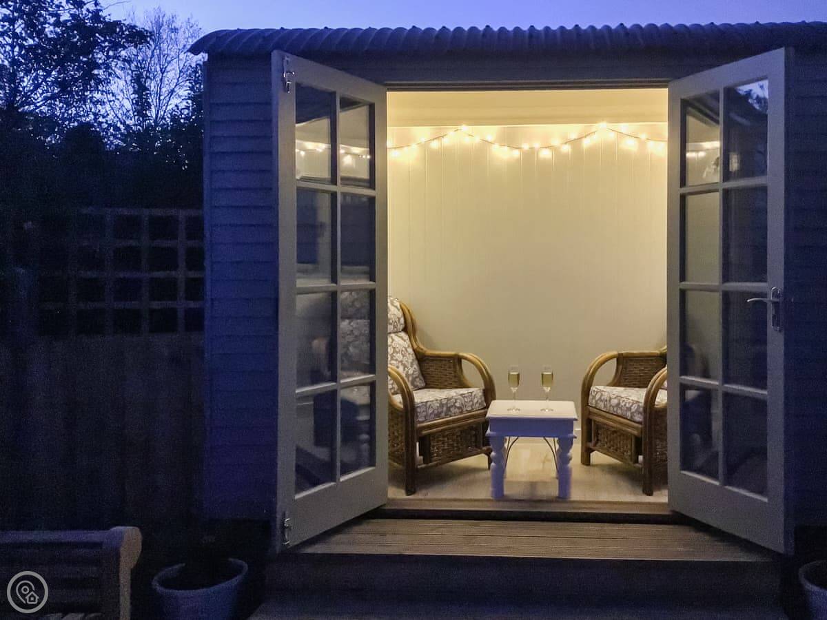 Outside, there's a patio with teak furniture and a shepherd's hut in the garden. We call it the Tea Junction. It's got a light and a heater, so you can sit out there in the evening.