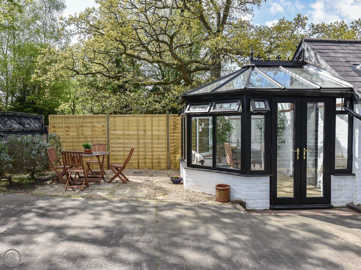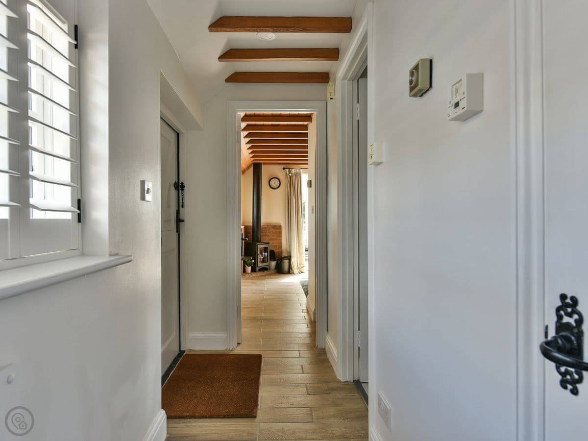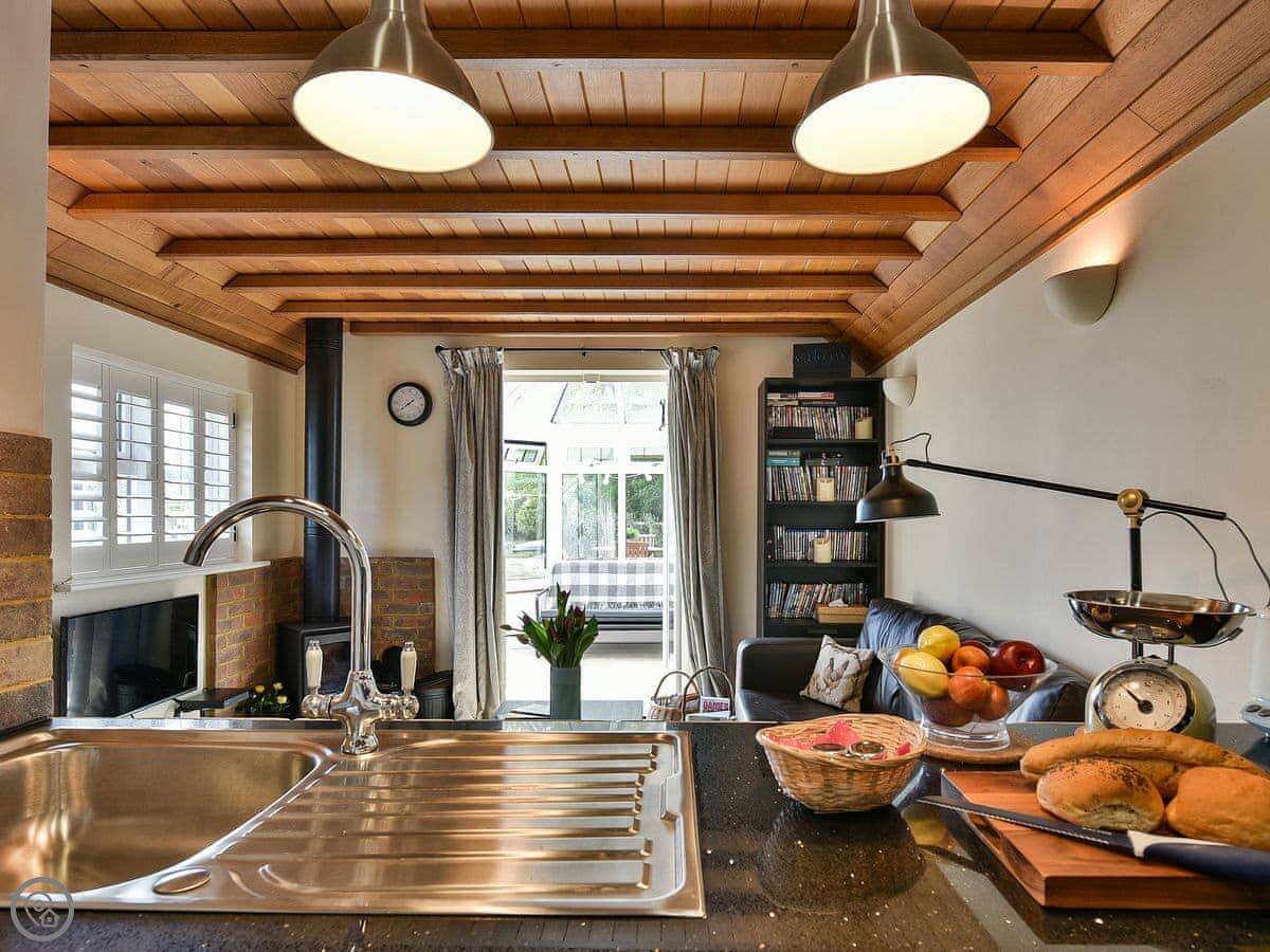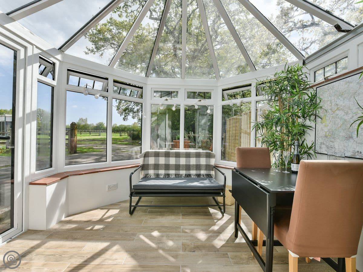 The main room has a wood burner. There’s a kitchen area with a hatch through to the sitting area, which is useful. There’s also a conservatory on the back that looks out over the paddocks. It gets the sun.