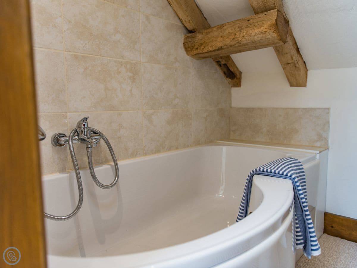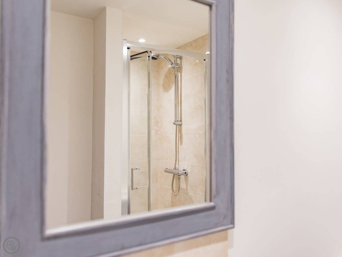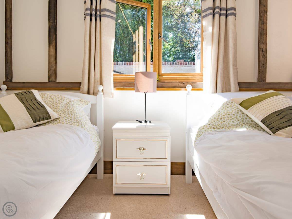 It sleeps four. Two bedrooms, two bathrooms. One bedroom is upstairs in the oldest part, with an en-suite and some beams. The other is a twin room downstairs, past a couple of steps. There's an open plan living area with a high ceiling and underfloor heating. The kitchen is separate but right next door.
